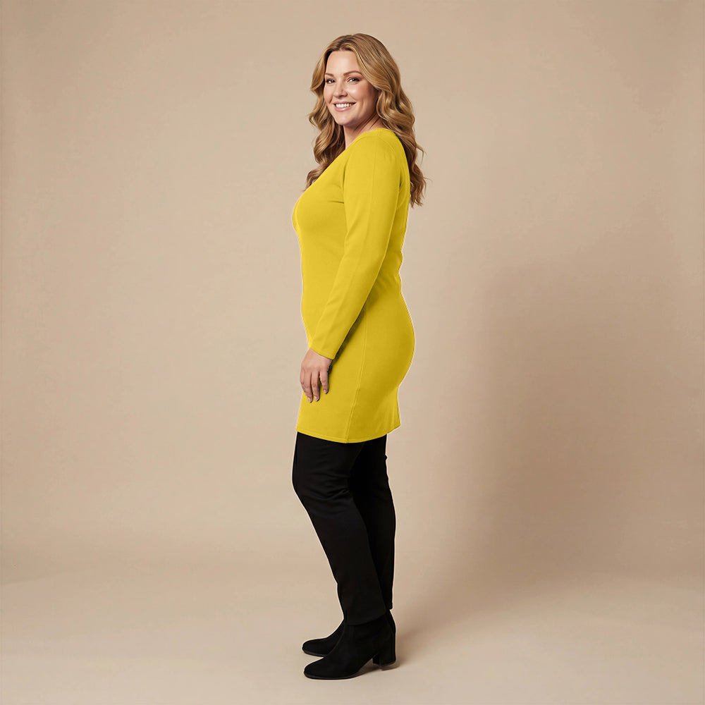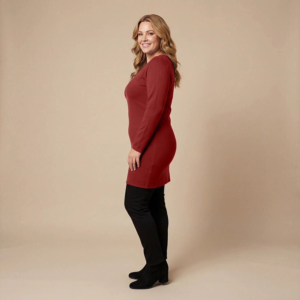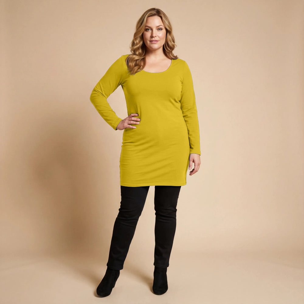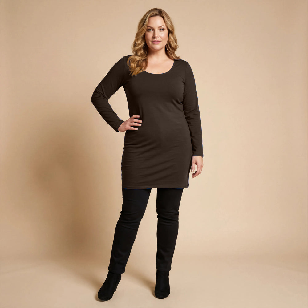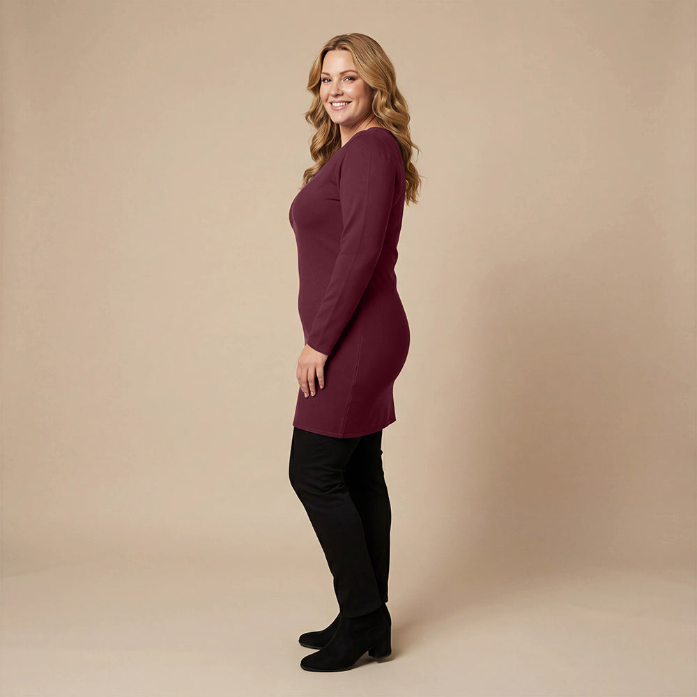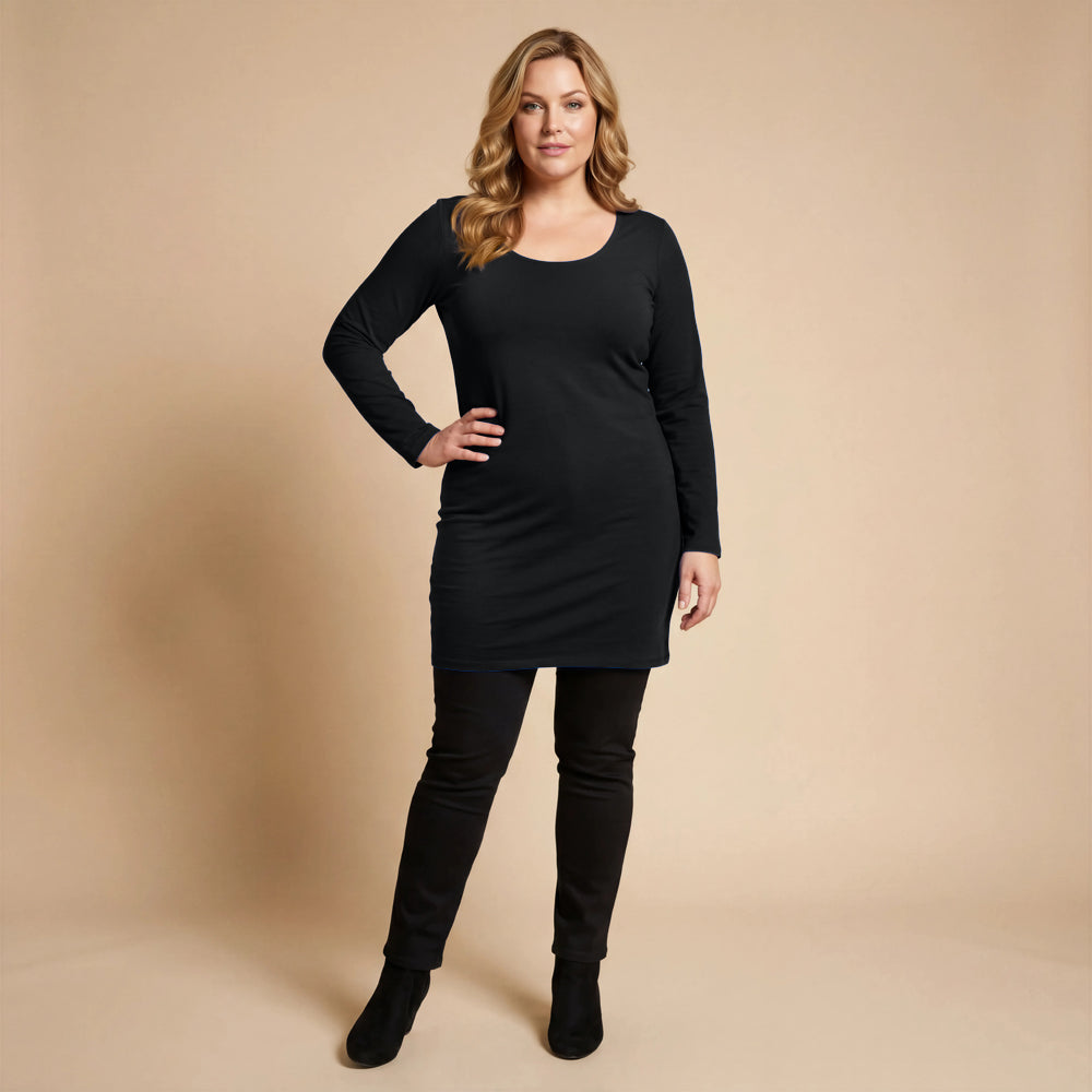 Diese Basic-Tunika von Boris Industries besteht aus robuster, dehnbarer Viskose mit weichem Futter. Der tiefe Rundhalsausschnitt und die langen Ärmel machen sie zu einem bequemen Modell, das allein oder mit Leggings getragen werden kann. Dank der taillierten und dennoch bequemen Passform eignet sie sich auch gut als kurzes Kleid.