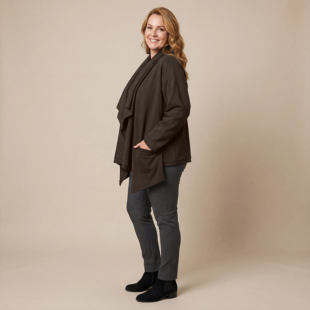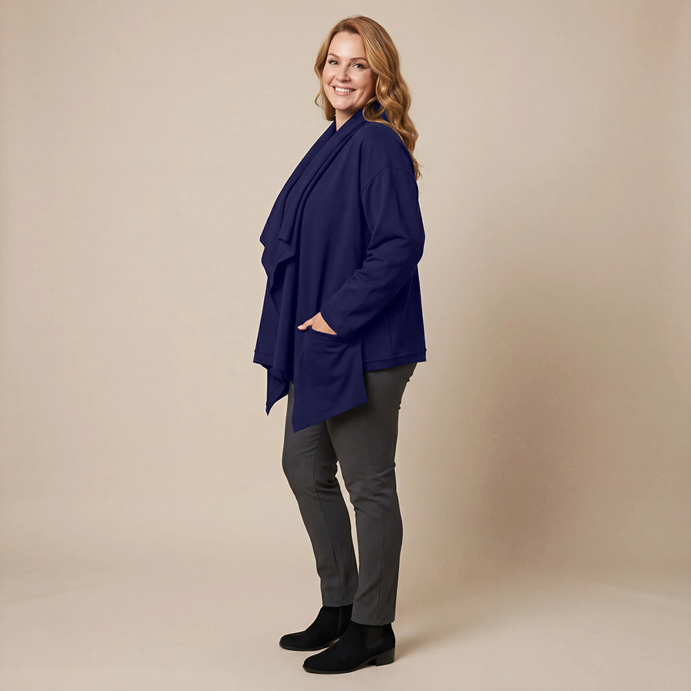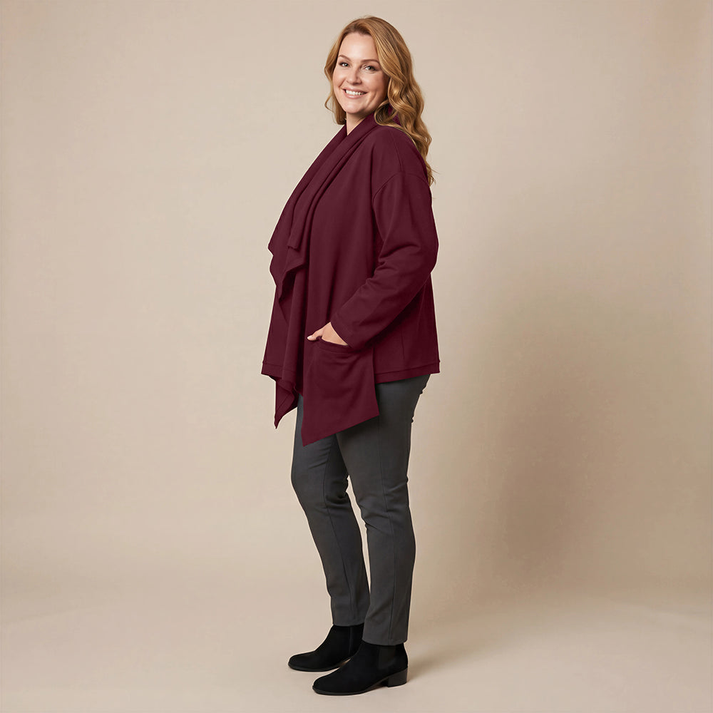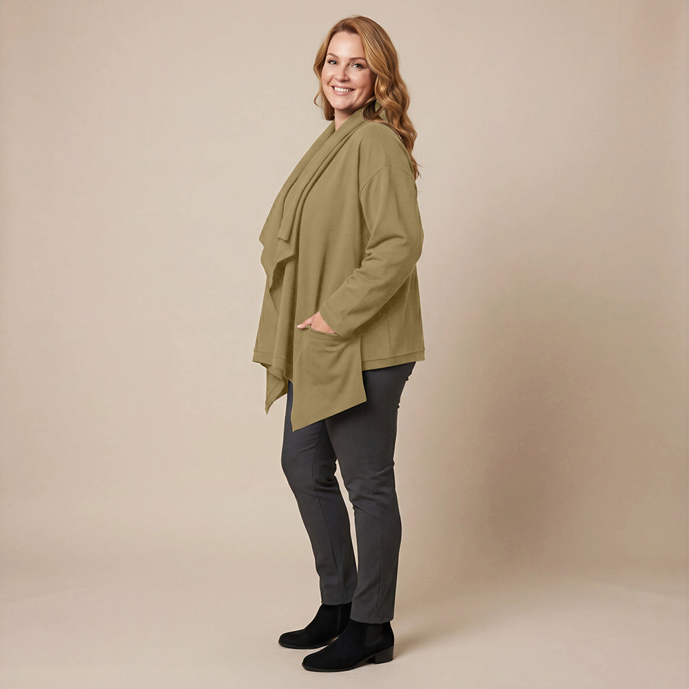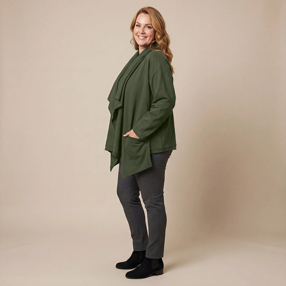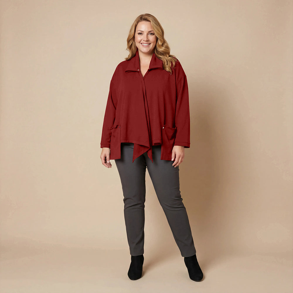 Dieser weite Cardigan von Boris Industries ist angenehm locker und fällt vorne schön. Der Doppelkragen lässt sich mit Druckknöpfen verstellen. Der Cardigan hat separate Taschen und wird ebenfalls mit Druckknöpfen geschlossen. Aus weichem Stoff gefertigt, eignet er sich perfekt zum Einkuscheln.