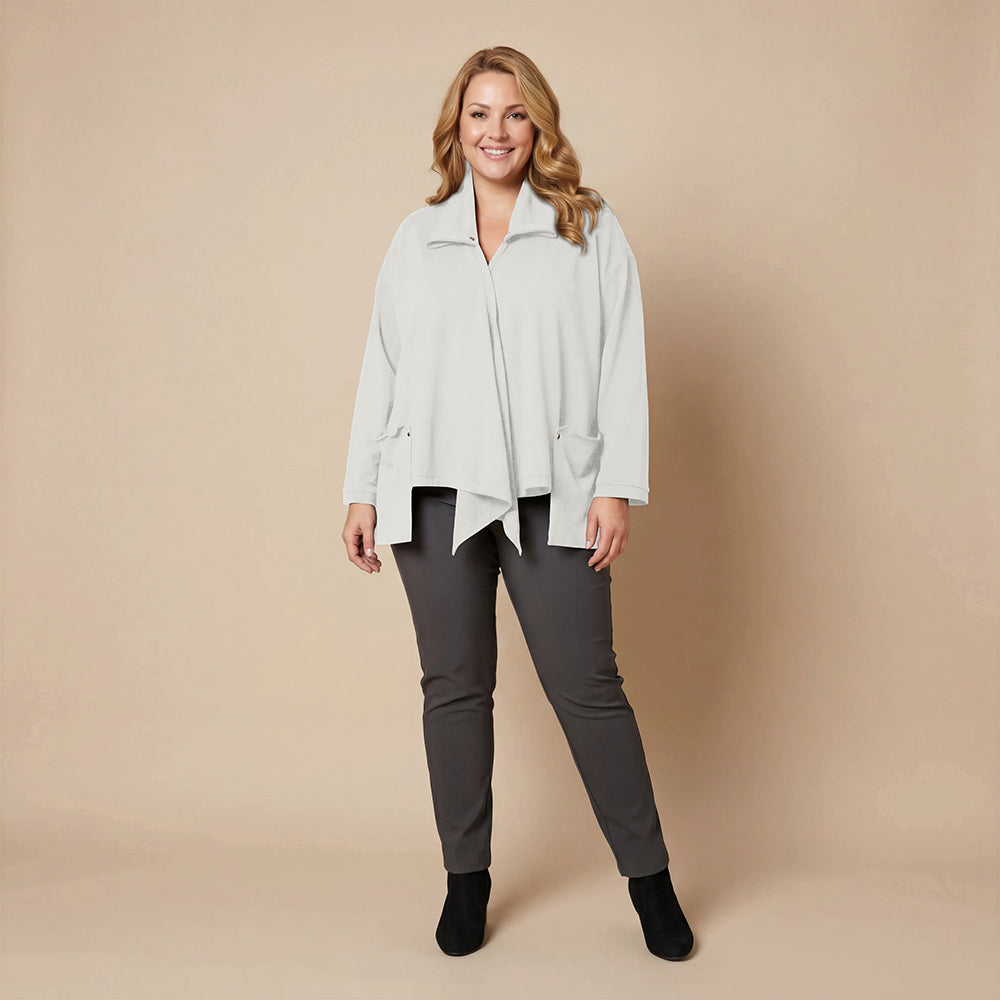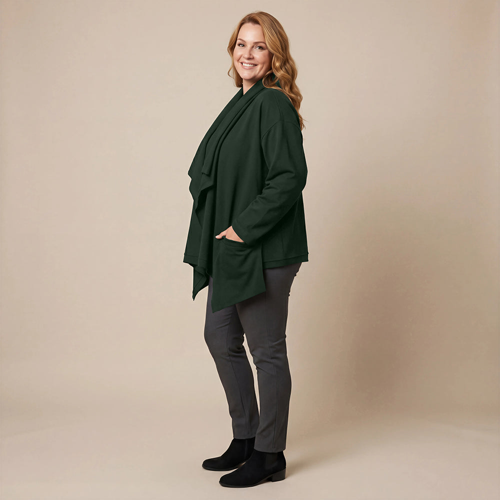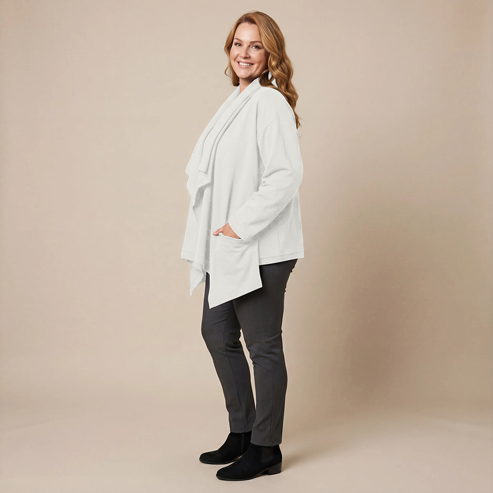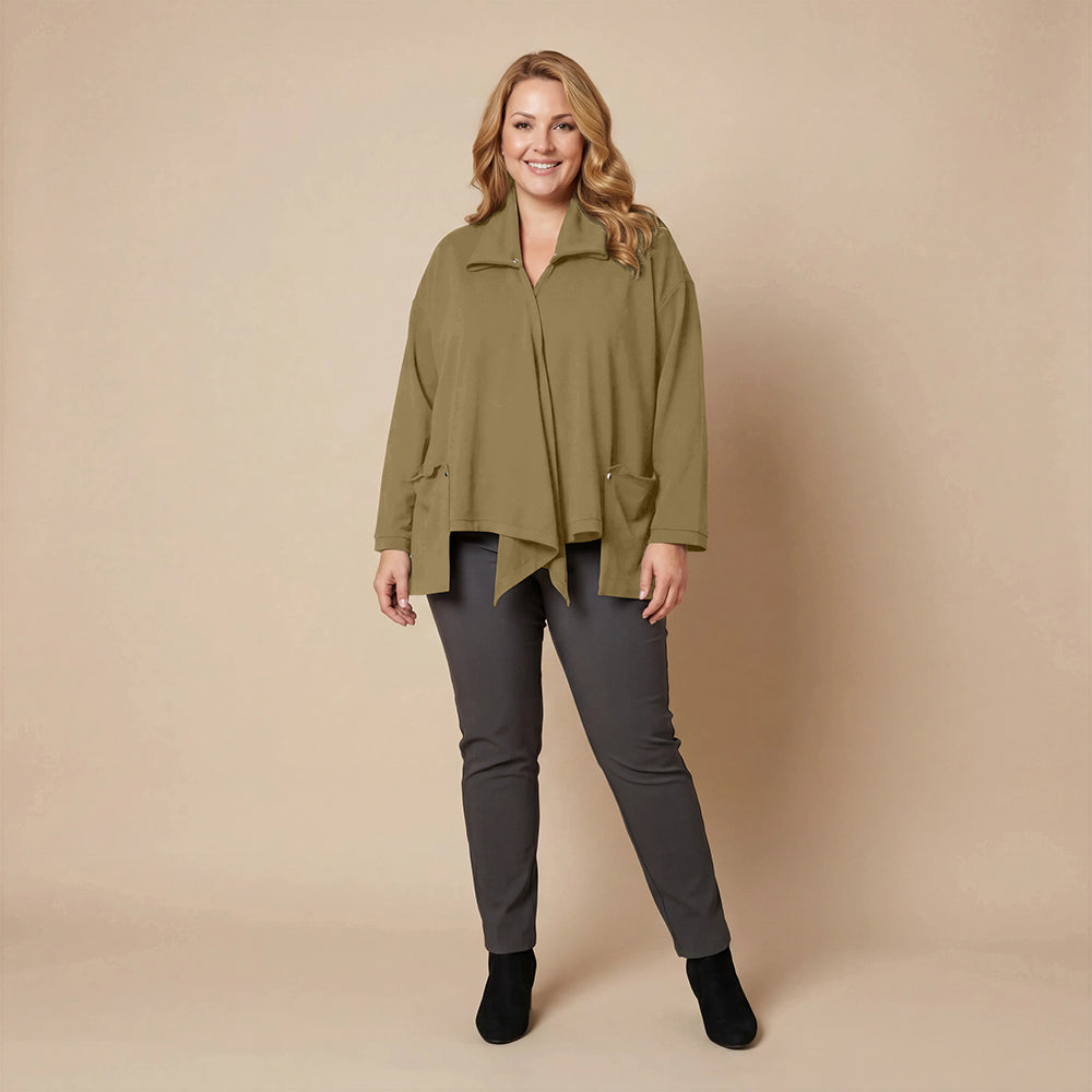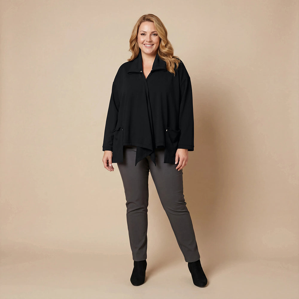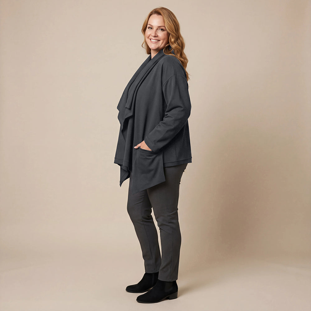 Dieser weite Cardigan von Boris Industries ist angenehm locker und fällt vorne schön. Der Doppelkragen lässt sich mit Druckknöpfen verstellen. Der Cardigan hat separate Taschen und wird ebenfalls mit Druckknöpfen geschlossen. Aus weichem Stoff gefertigt, eignet er sich perfekt zum Einkuscheln.