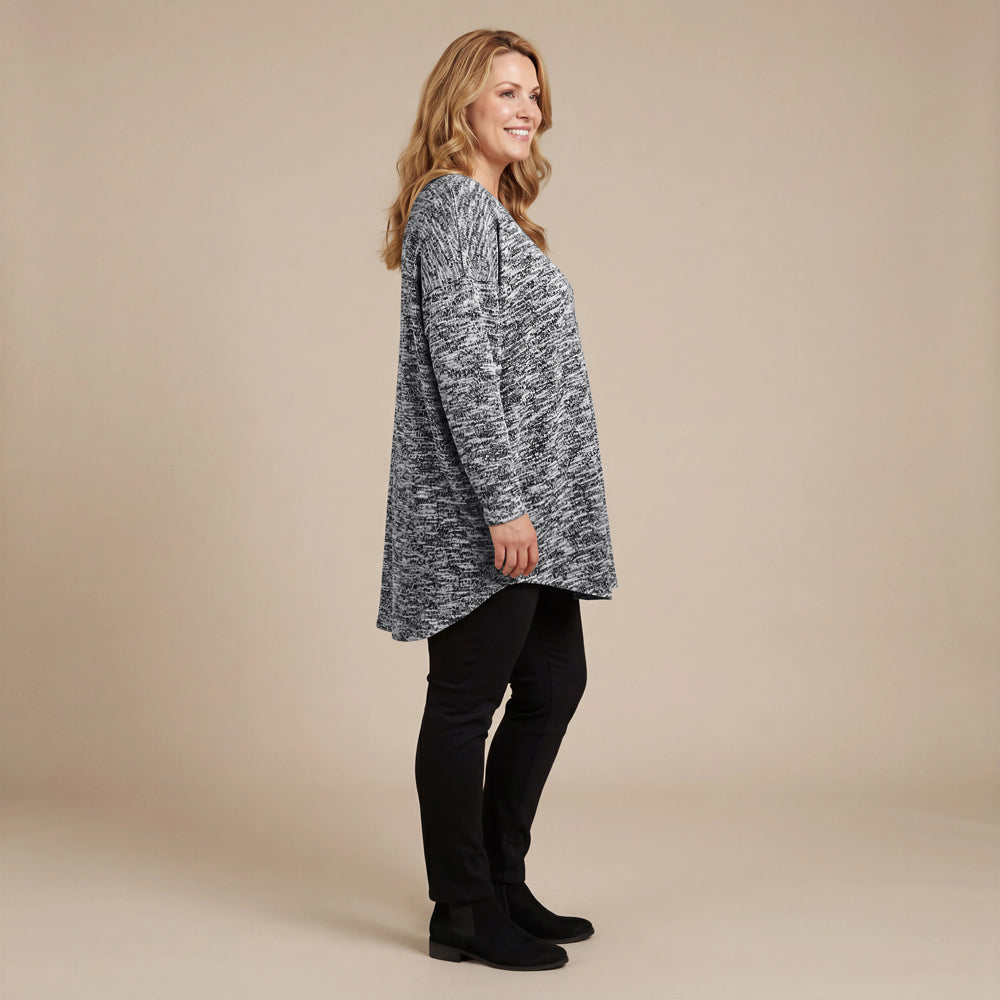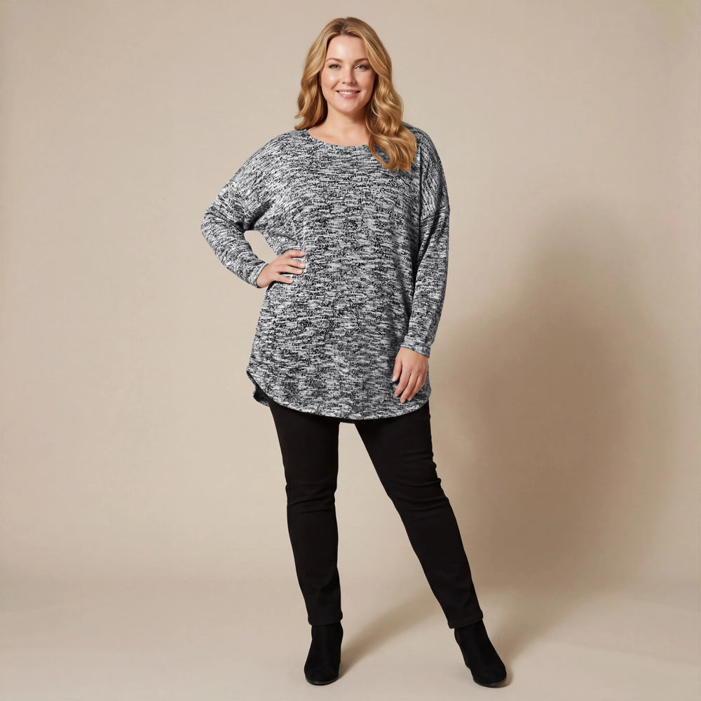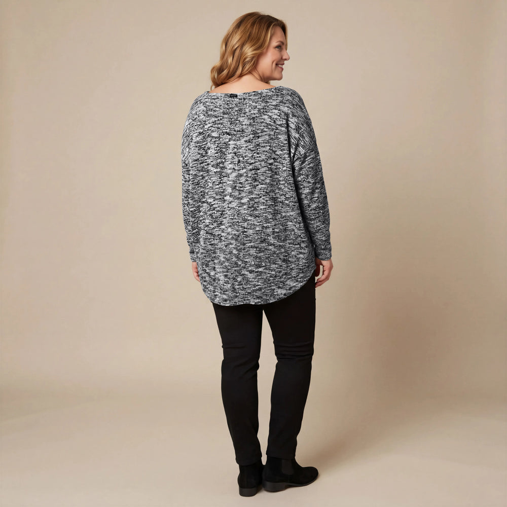 Cette large pull de Boris Industries est parfaite pour un look estival décontracté et élégant. Confectionnée dans un tricot souple noir et blanc chiné, cette pull offre une coupe confortable avec un col rond. Le modèle long est polyvalent et convient aux tailles 42-52.