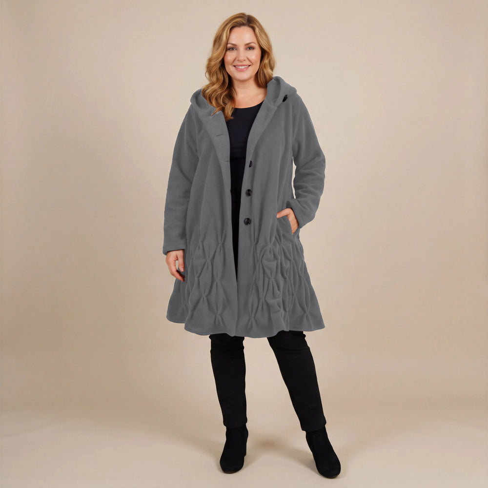 Questa giacca A-line di Boris Industries combina comfort ed eleganza. La giacca ha una linea A lusinghiera ed è dotata di smock nella parte inferiore, che crea un effetto giocoso e stiloso. Realizzata in pesante tessuto felpato, la giacca offre calore e una vestibilità piacevole. La giacca ha una chiusura con bottoni, un cappuccio e tasche a filetto sui lati.