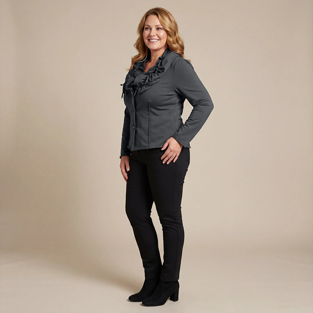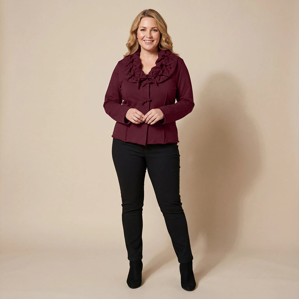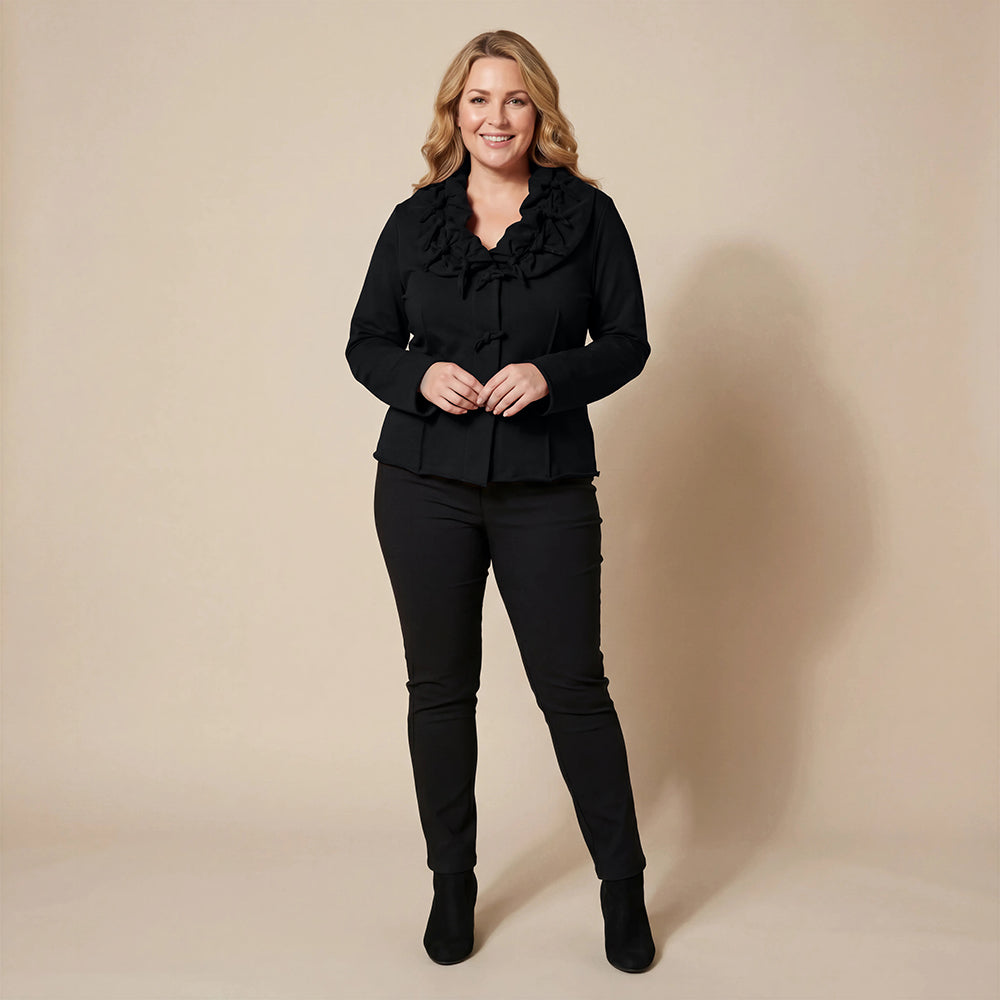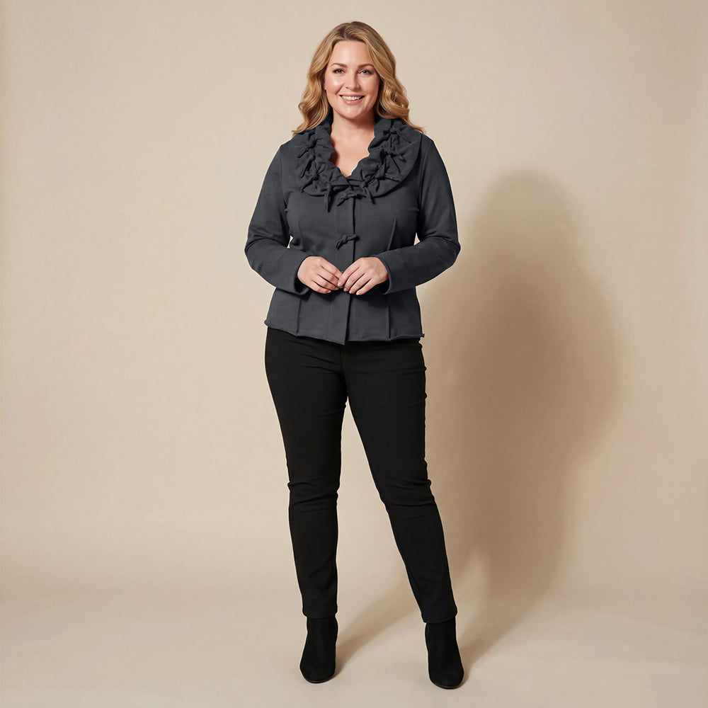 Questa giacca sagomata di Boris Industries è realizzata in viscosa di alta qualità con un interno morbido. La giacca presenta un colletto voluminoso e distintivo con bottoni, che conferisce un aspetto giocoso e mette in risalto il tuo décolleté. La giacca si chiude con bottoni a pressione sul davanti e può essere indossata sia come giacca che come cardigan. Disponibile in nero, bianco, rosso, antracite e una variante a strisce grigio/nero.