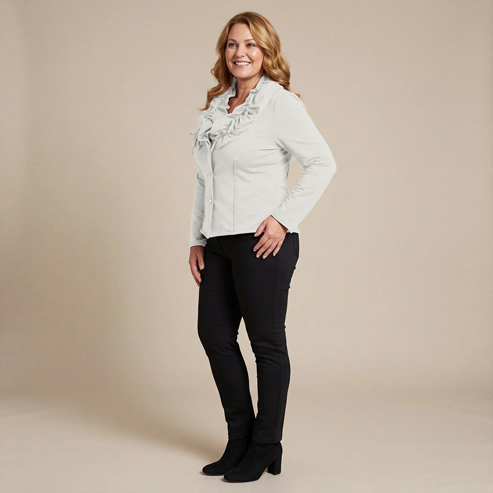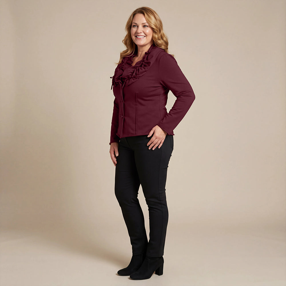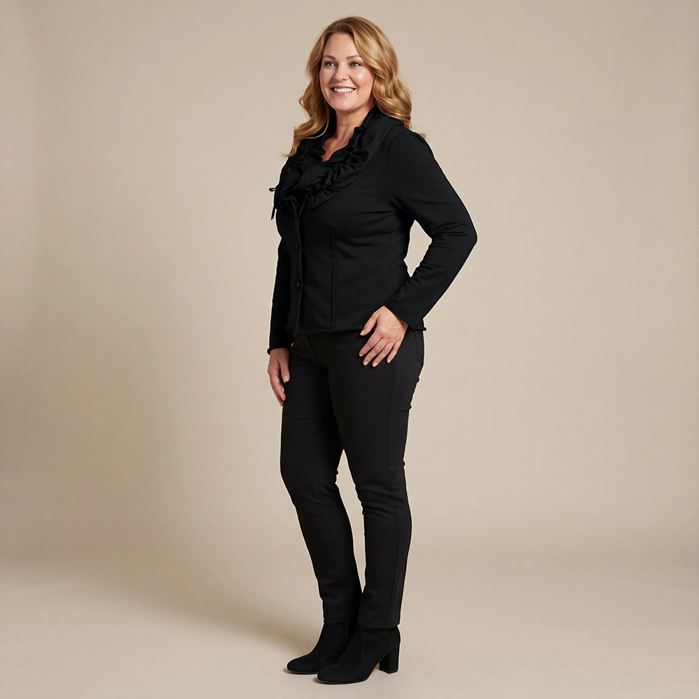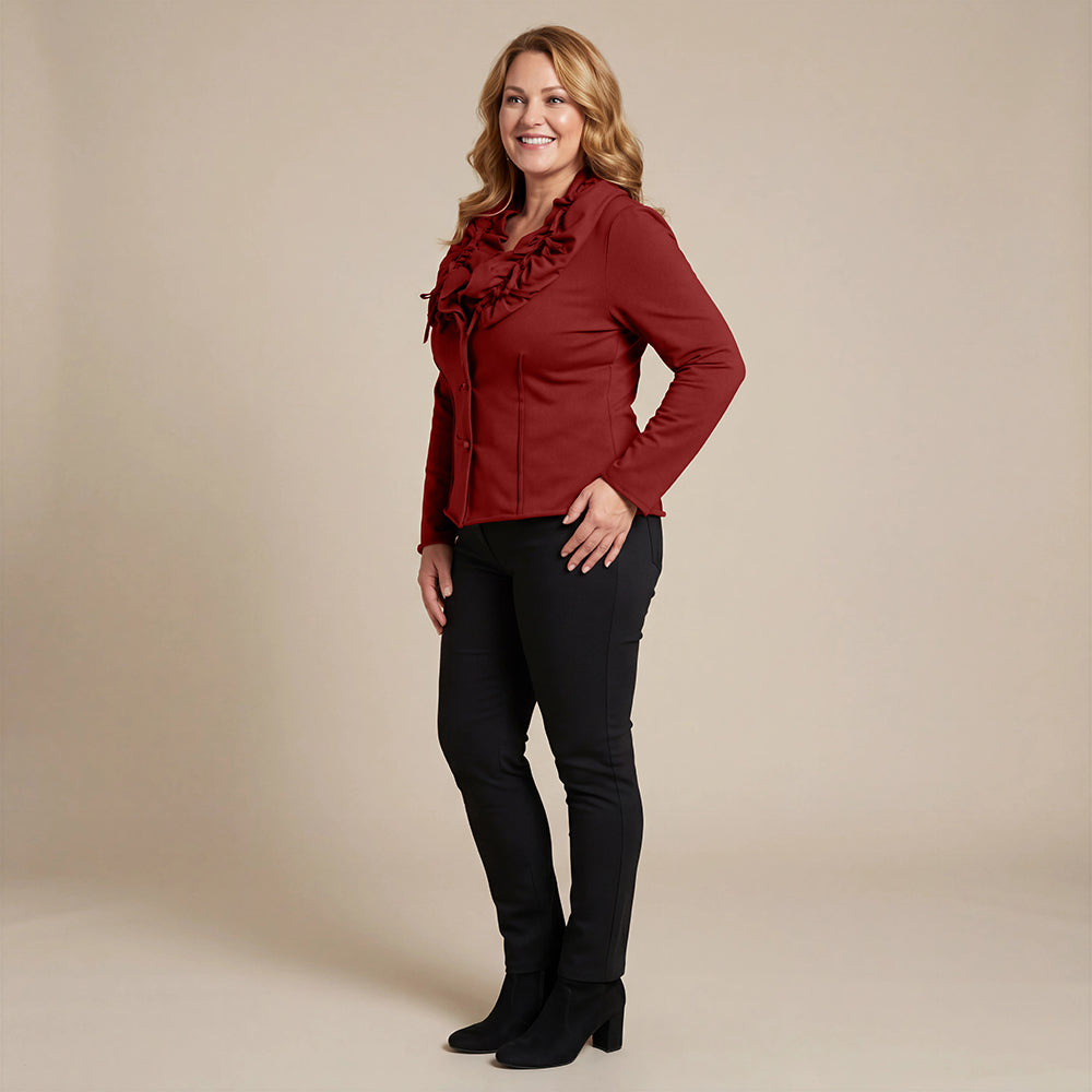 Questa giacca sagomata di Boris Industries è realizzata in viscosa di alta qualità con un interno morbido. La giacca presenta un colletto voluminoso e distintivo con bottoni, che conferisce un aspetto giocoso e mette in risalto il tuo décolleté. La giacca si chiude con bottoni a pressione sul davanti e può essere indossata sia come giacca che come cardigan. Disponibile in nero, bianco, rosso, antracite e una variante a strisce grigio/nero.