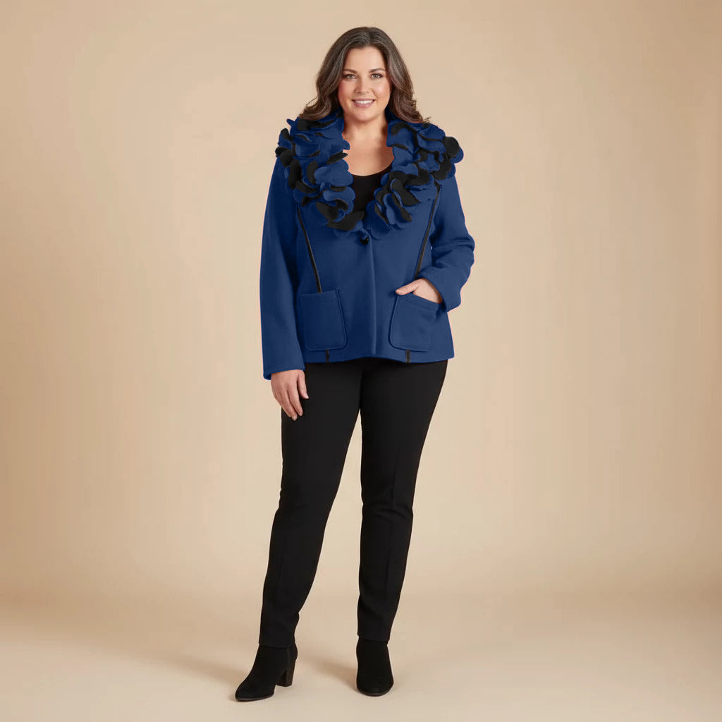 Questa giacca corta di Boris Industries è realizzata in fleece di alta qualità ed ha un colletto floreale distintivo, che risulta morbido e caldo al tatto. Il colletto è composto da toppe in fleece a forma di fiori, creando un effetto giocoso e frivolo. La giacca può essere indossata sia in modo elegante che casual, o anche come cardigan sotto un'altra giacca per far risaltare ulteriormente il colletto. La giacca si chiude con un bottone sul davanti.
