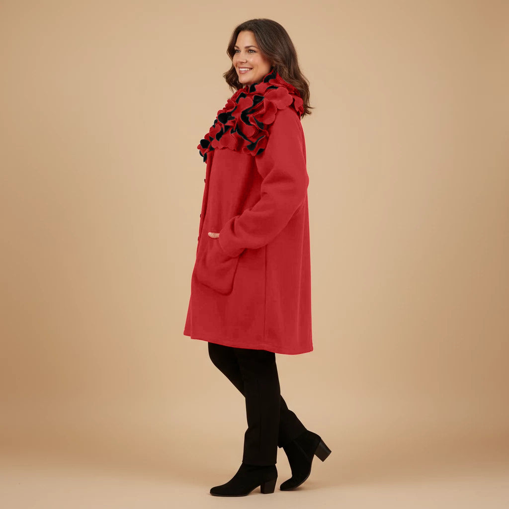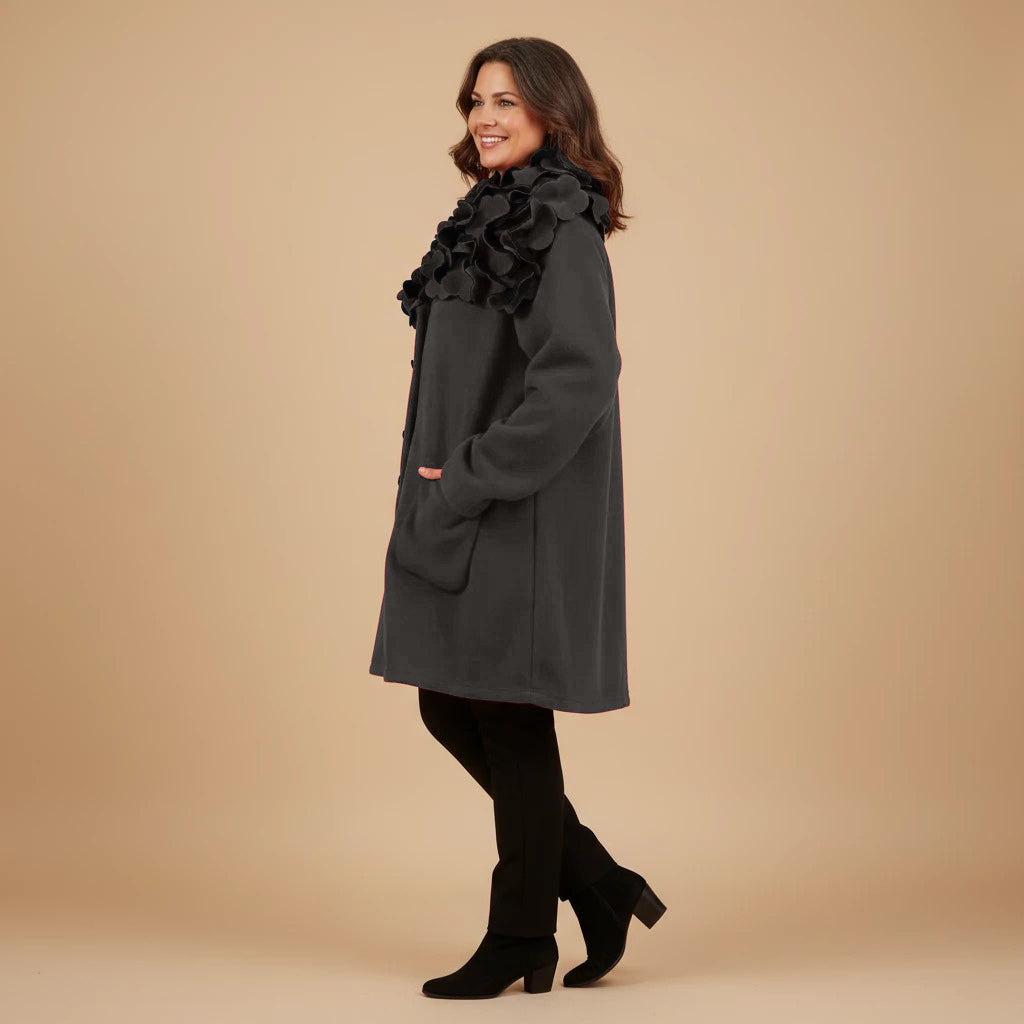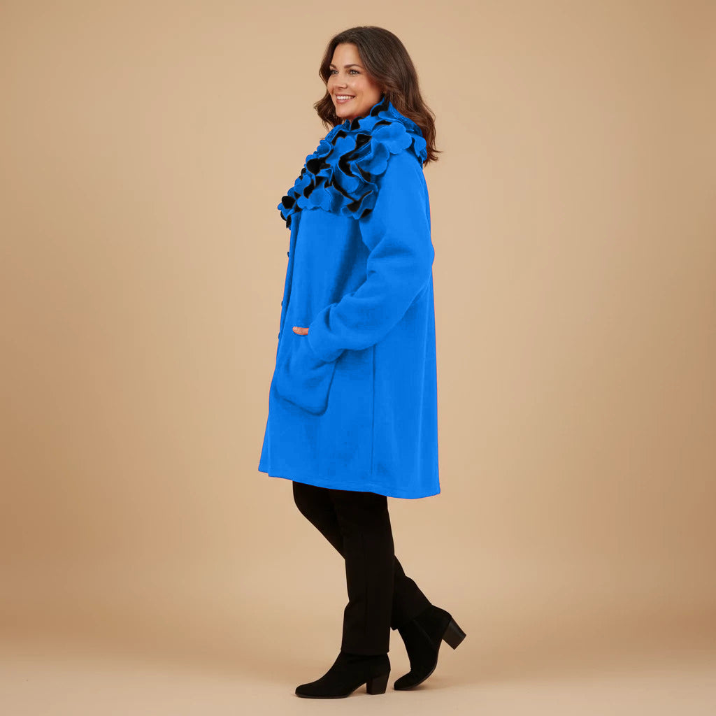 This cozy fleece coat is a statement! The cobalt blue colour is so vibrant that it will brighten any dreary winter day. There are so many interesting design elements on this coat that make it stand out. The pockets, the attached scarf and interesting buttons. I know this coat will be one to reach for in the cold days ahead!