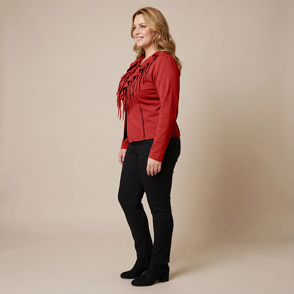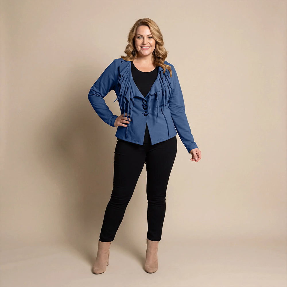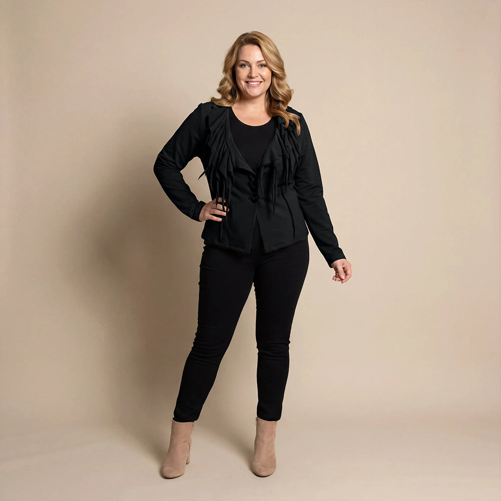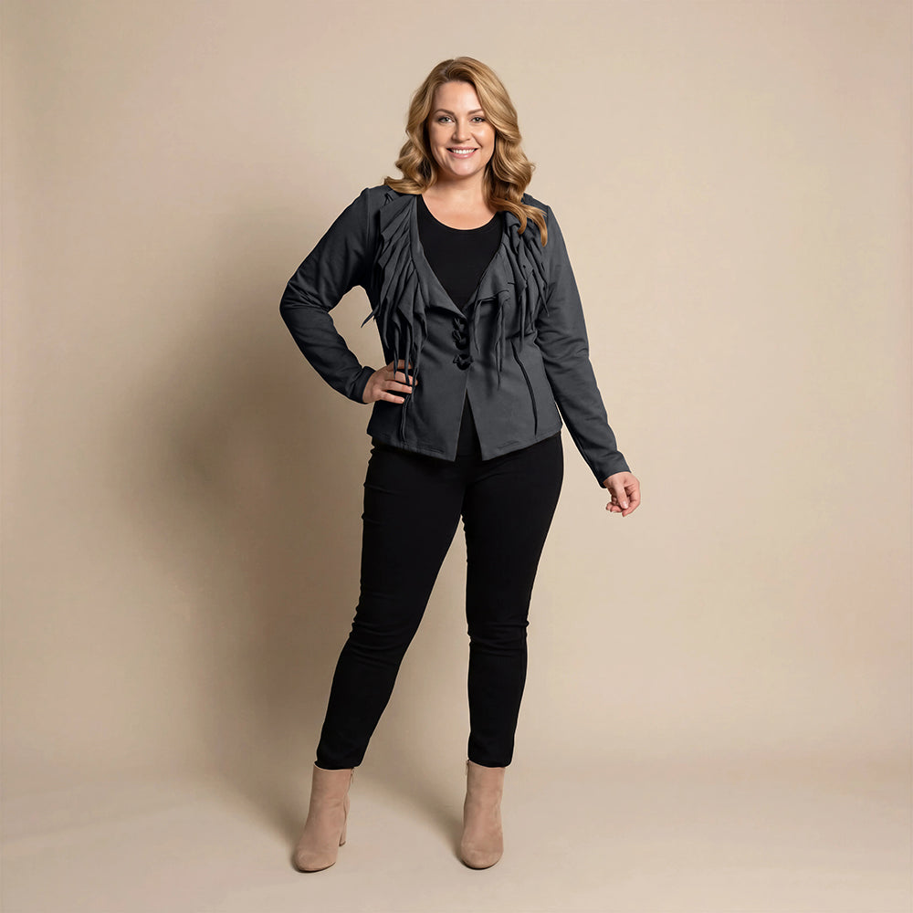 Questa giacca sagomata di Boris Industries è un'aggiunta unica al tuo guardaroba, con un colletto distintivo tagliato a strisce che si arrotola in modo giocoso verso il basso. Realizzata in viscosa spazzolata, questa giacca corta offre sia comfort che stile. Il colletto, realizzato interamente in tessuto a pois, forma dei simpatici rotolini che pendono attorno al tuo collo. La giacca si chiude con tre bottoni ed è perfetta da abbinare a camicie più lunghe.