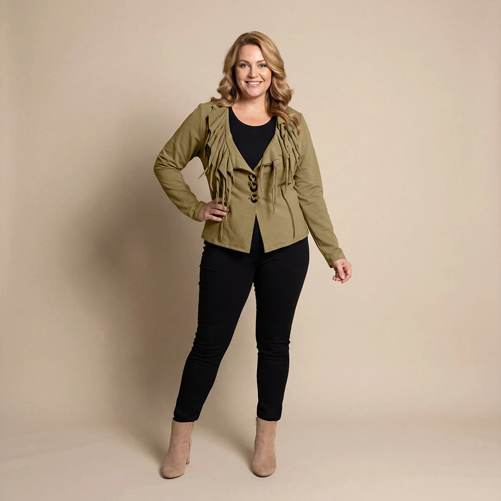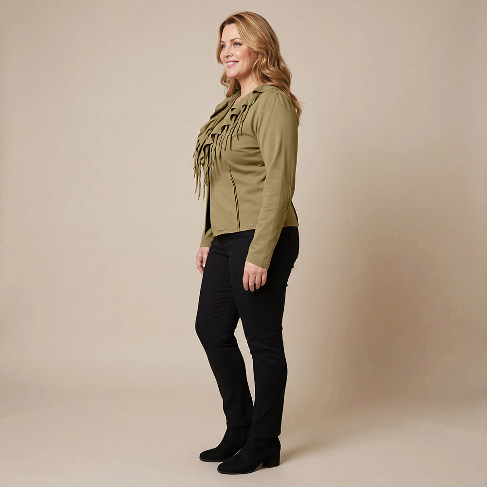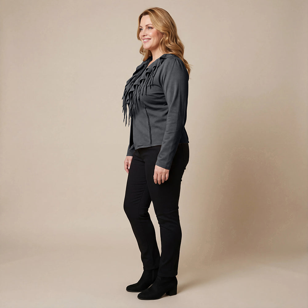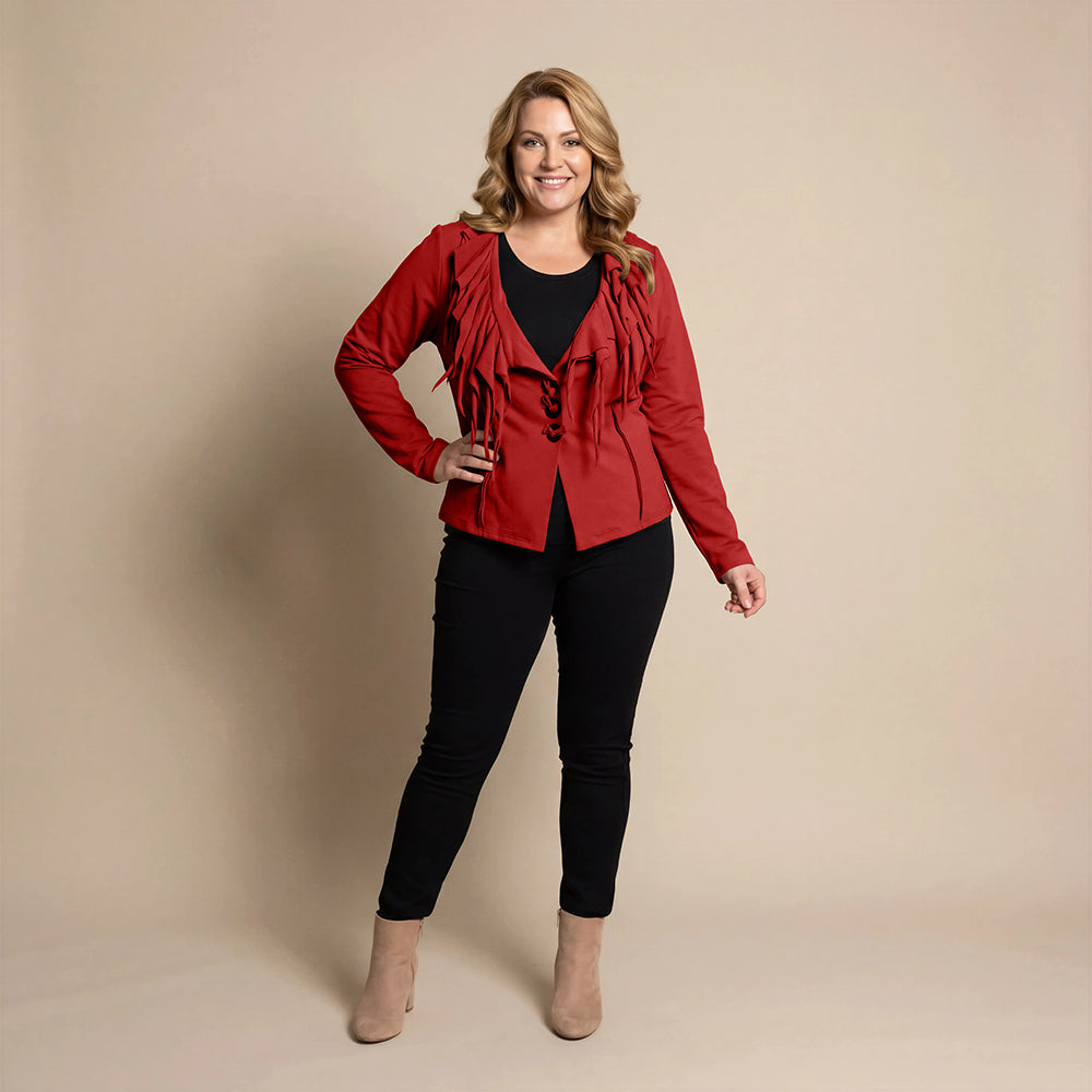 Questa giacca sagomata di Boris Industries è un'aggiunta unica al tuo guardaroba, con un colletto distintivo tagliato a strisce che si arrotola in modo giocoso verso il basso. Realizzata in viscosa spazzolata, questa giacca corta offre sia comfort che stile. Il colletto, realizzato interamente in tessuto a pois, forma dei simpatici rotolini che pendono attorno al tuo collo. La giacca si chiude con tre bottoni ed è perfetta da abbinare a camicie più lunghe.
