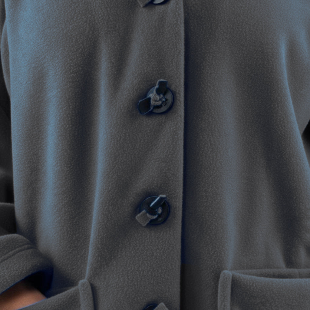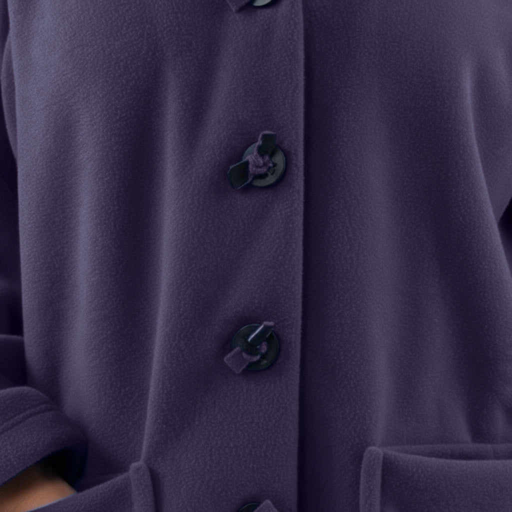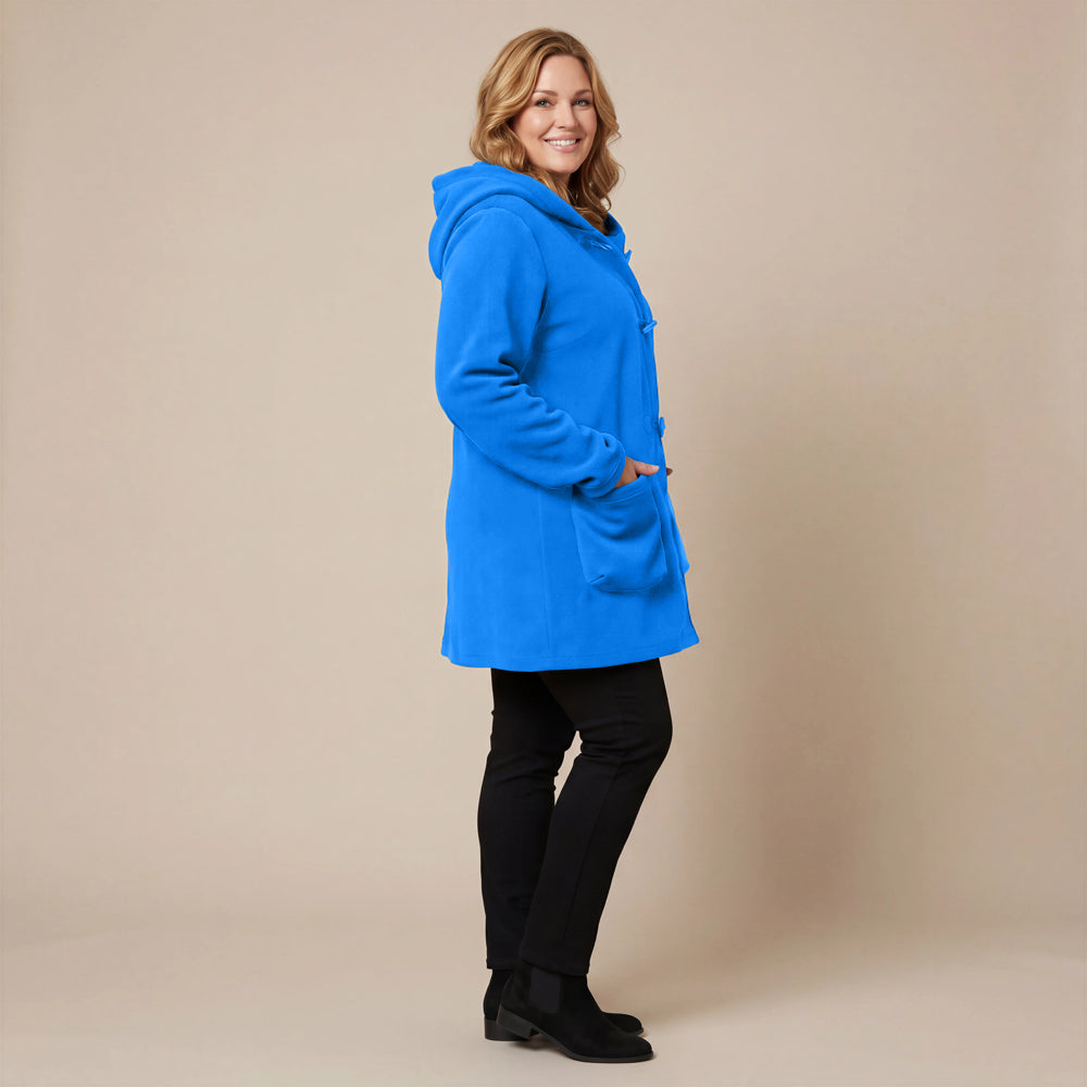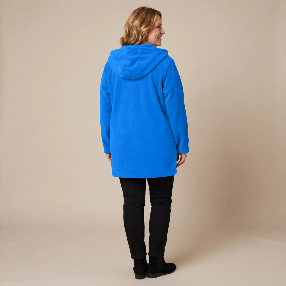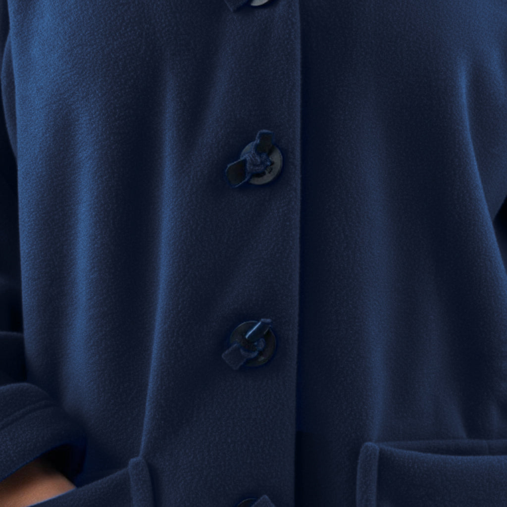 This cozy fleece coat is a statement! The cobalt blue colour is so vibrant that it will brighten any dreary winter day. There are so many interesting design elements on this coat that make it stand out. The pockets, the attached scarf and interesting buttons. I know this coat will be one to reach for in the cold days ahead!