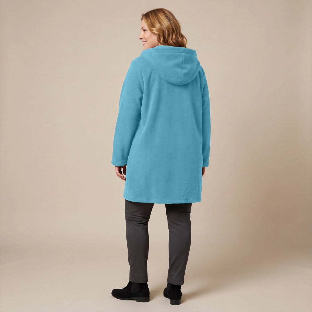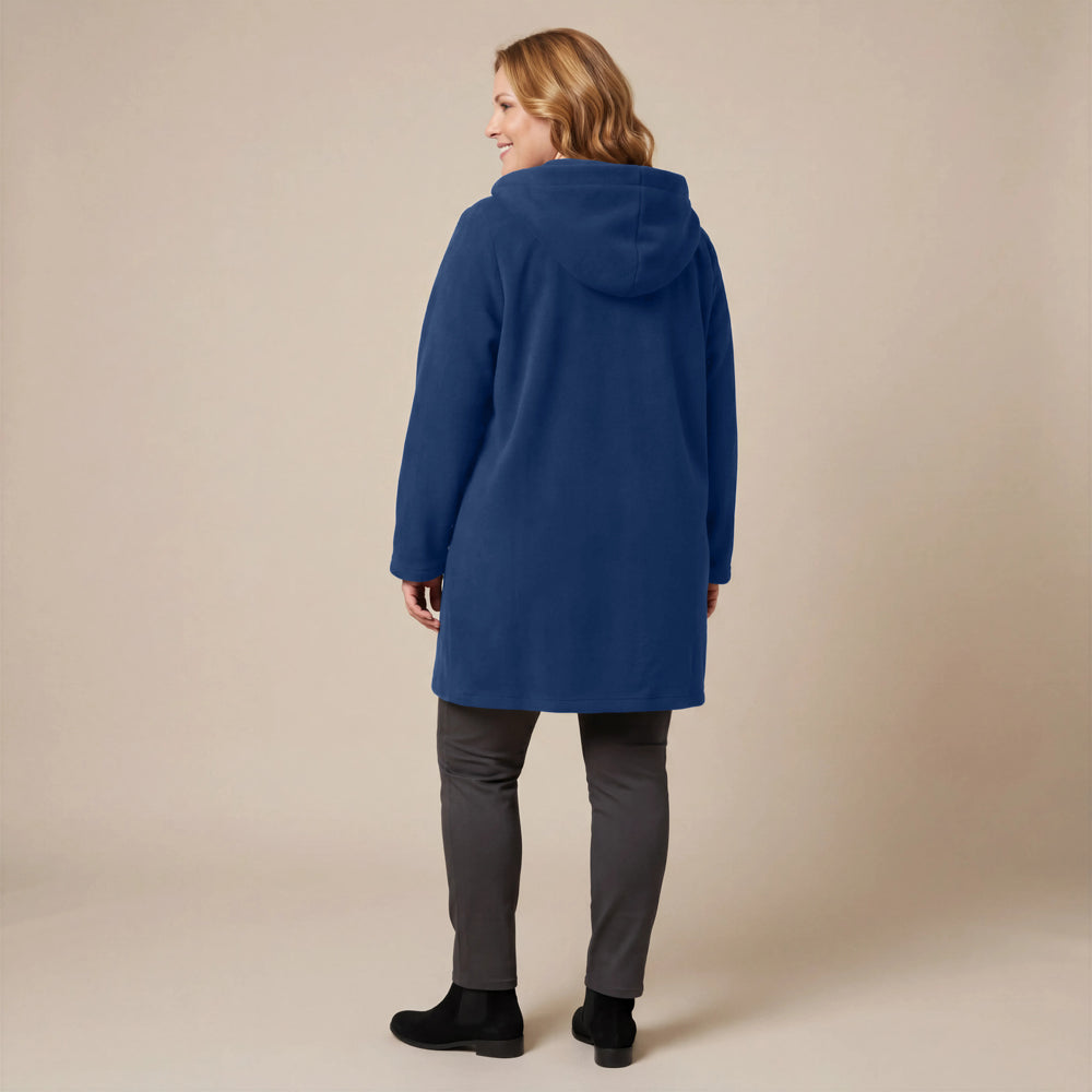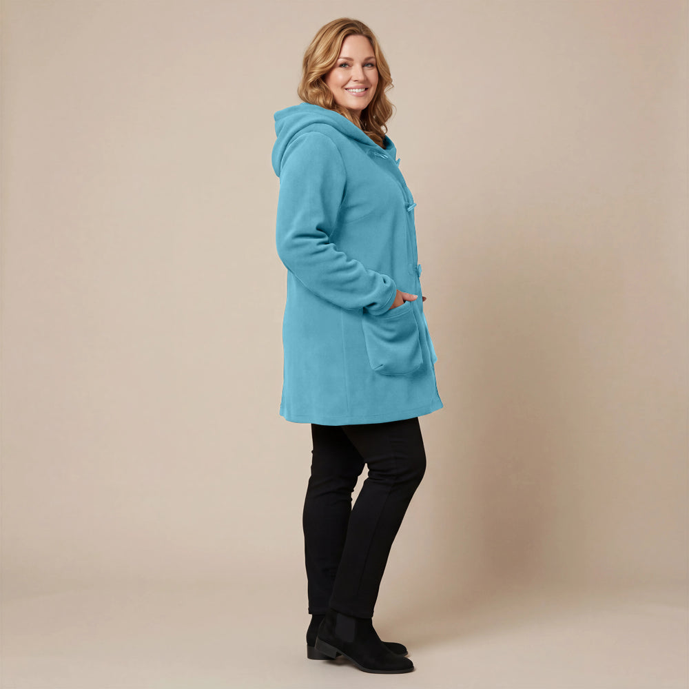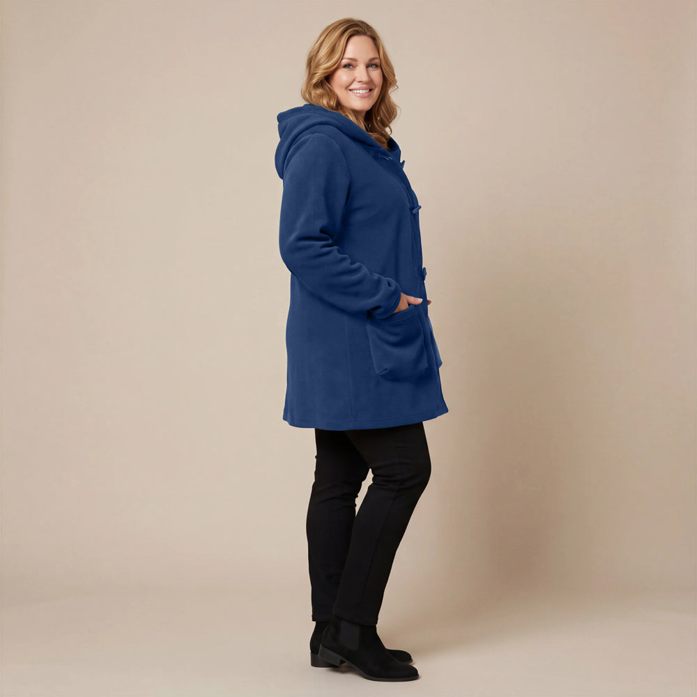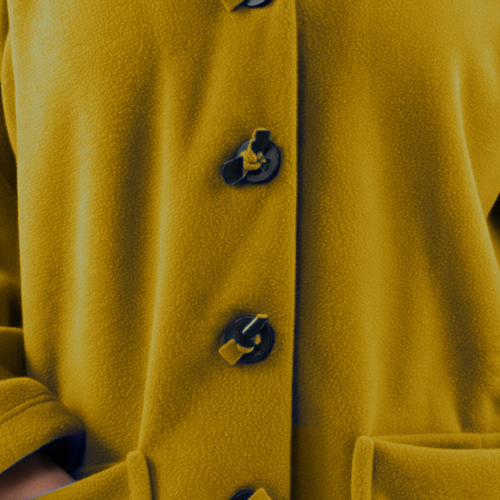 This cozy fleece coat is a statement! The cobalt blue colour is so vibrant that it will brighten any dreary winter day. There are so many interesting design elements on this coat that make it stand out. The pockets, the attached scarf and interesting buttons. I know this coat will be one to reach for in the cold days ahead!