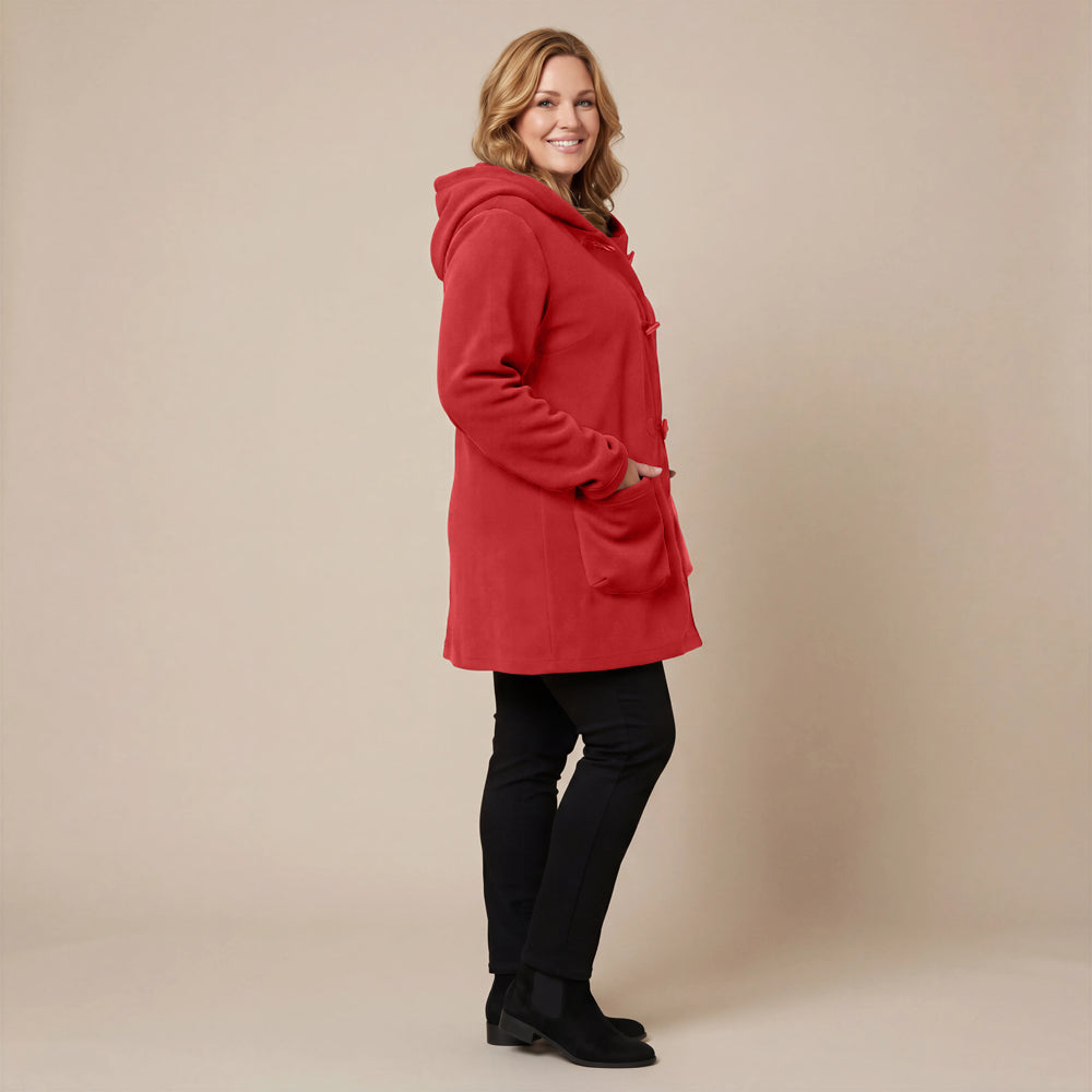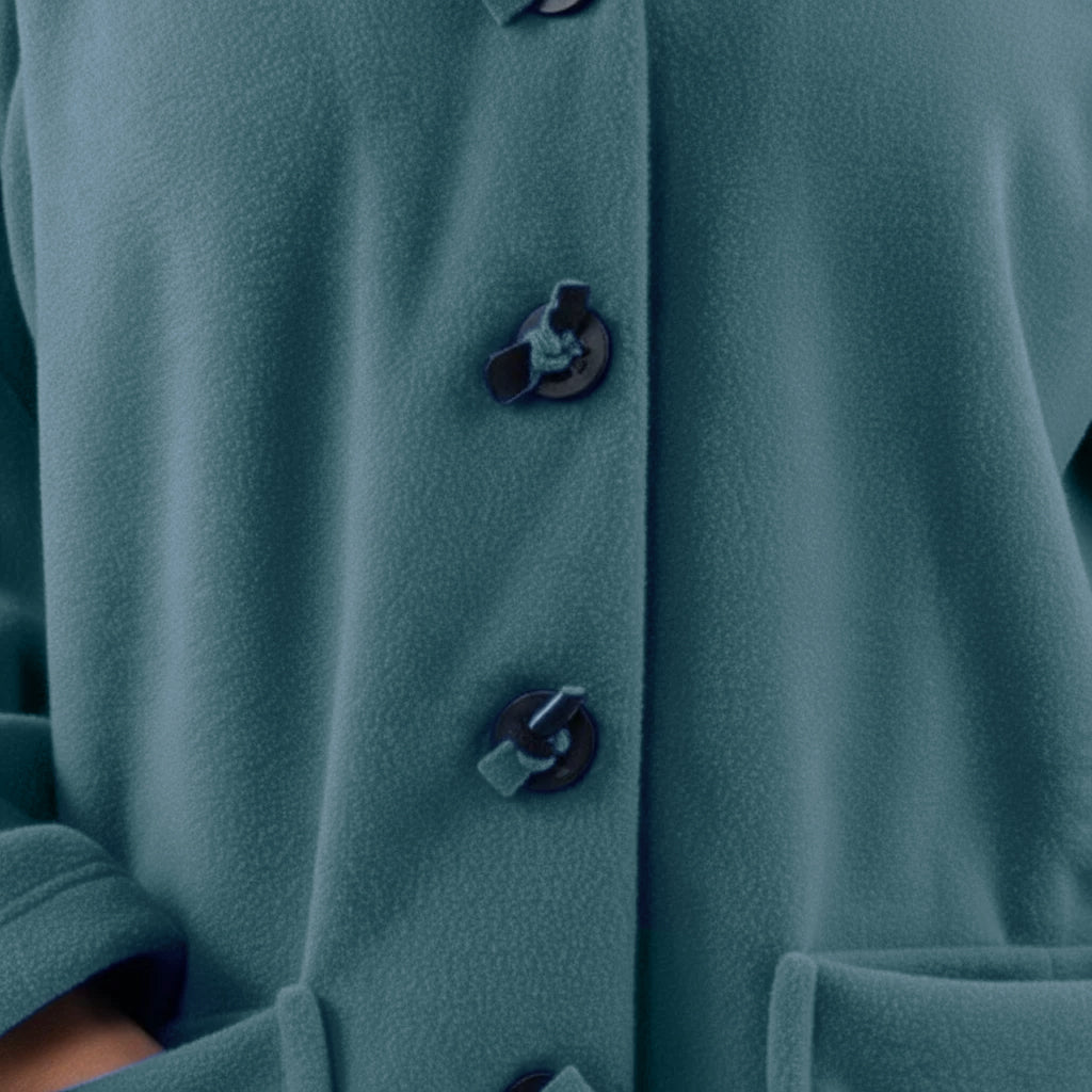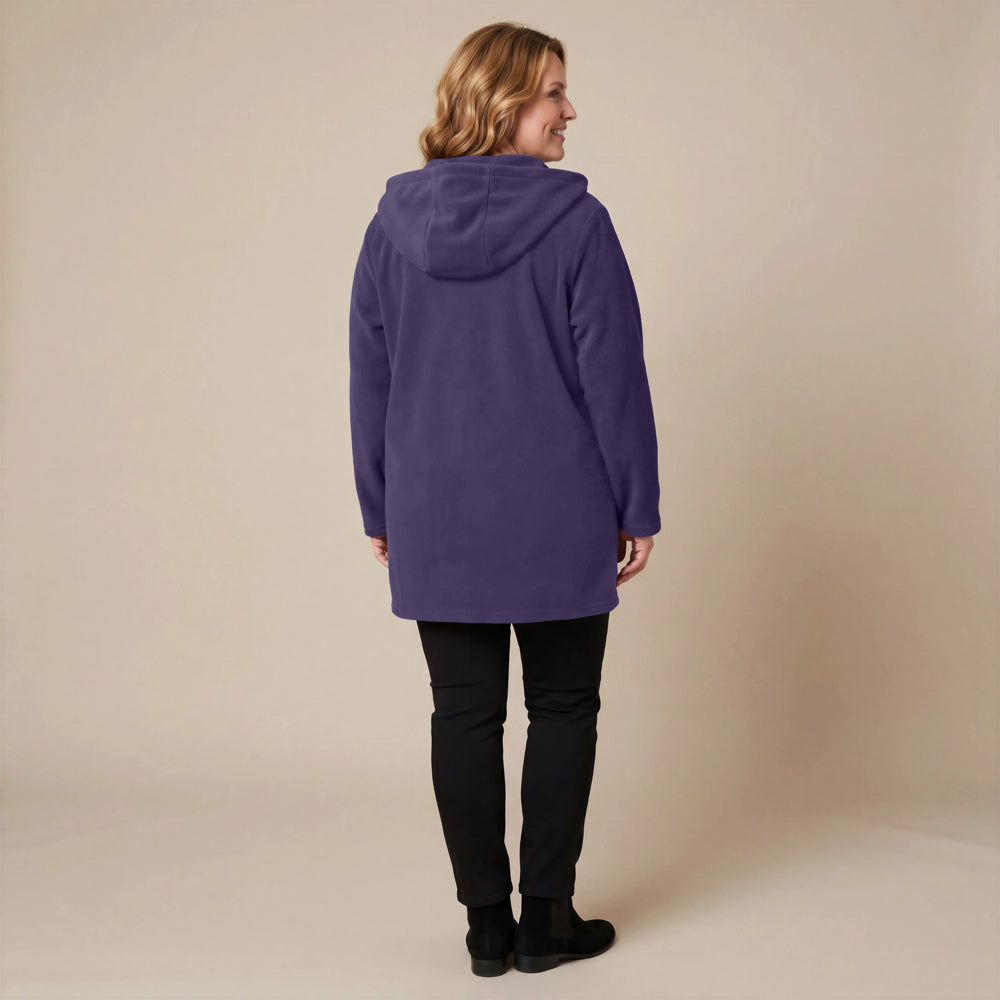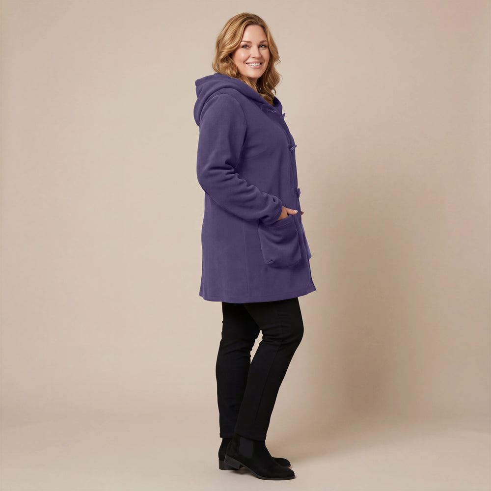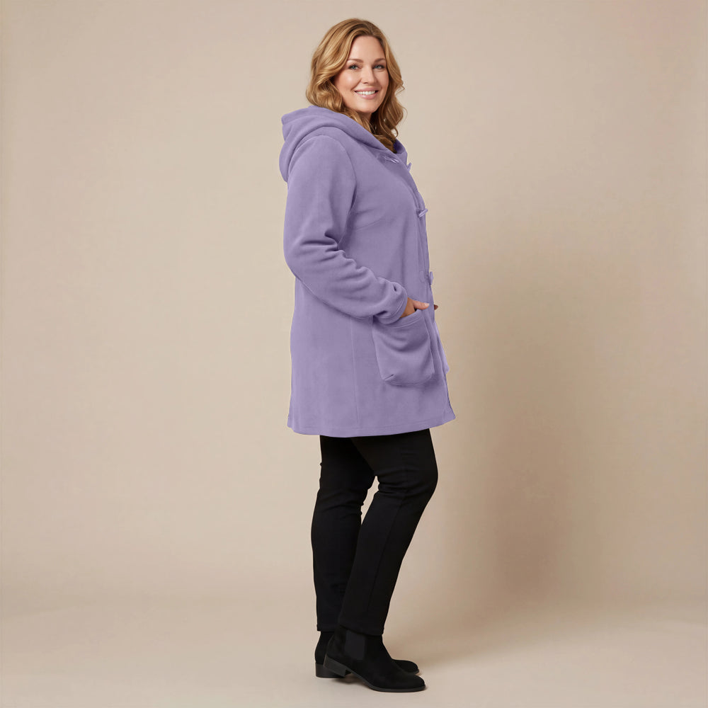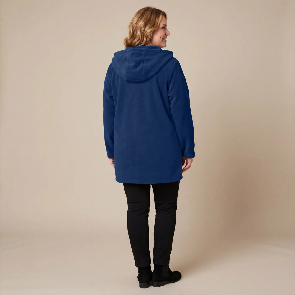 This cozy fleece coat is a statement! The cobalt blue colour is so vibrant that it will brighten any dreary winter day. There are so many interesting design elements on this coat that make it stand out. The pockets, the attached scarf and interesting buttons. I know this coat will be one to reach for in the cold days ahead!