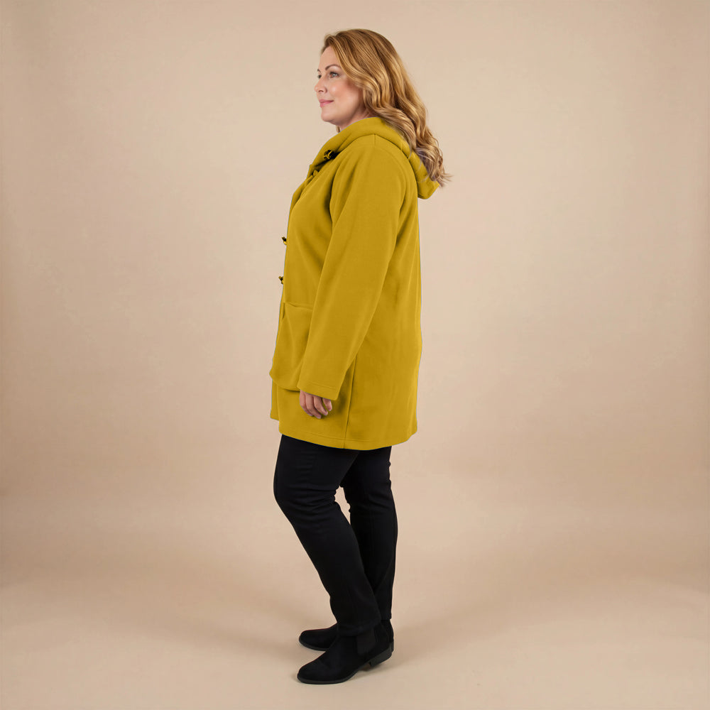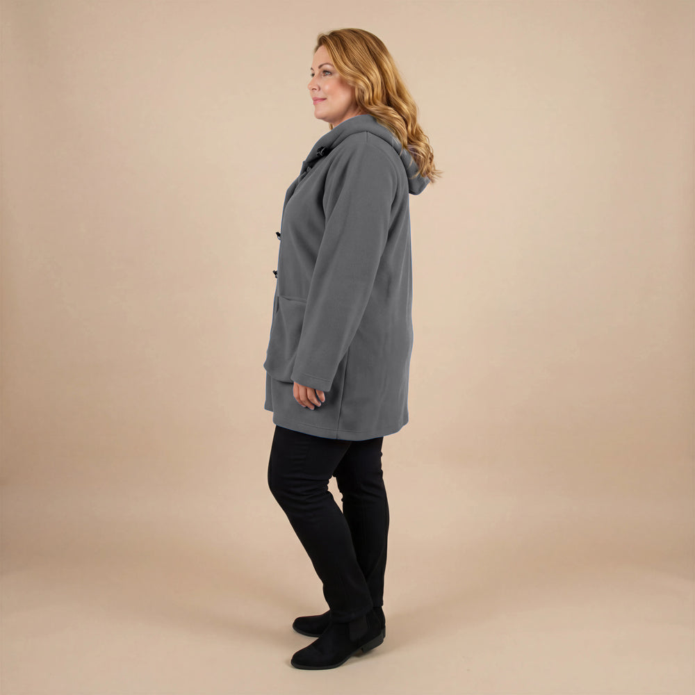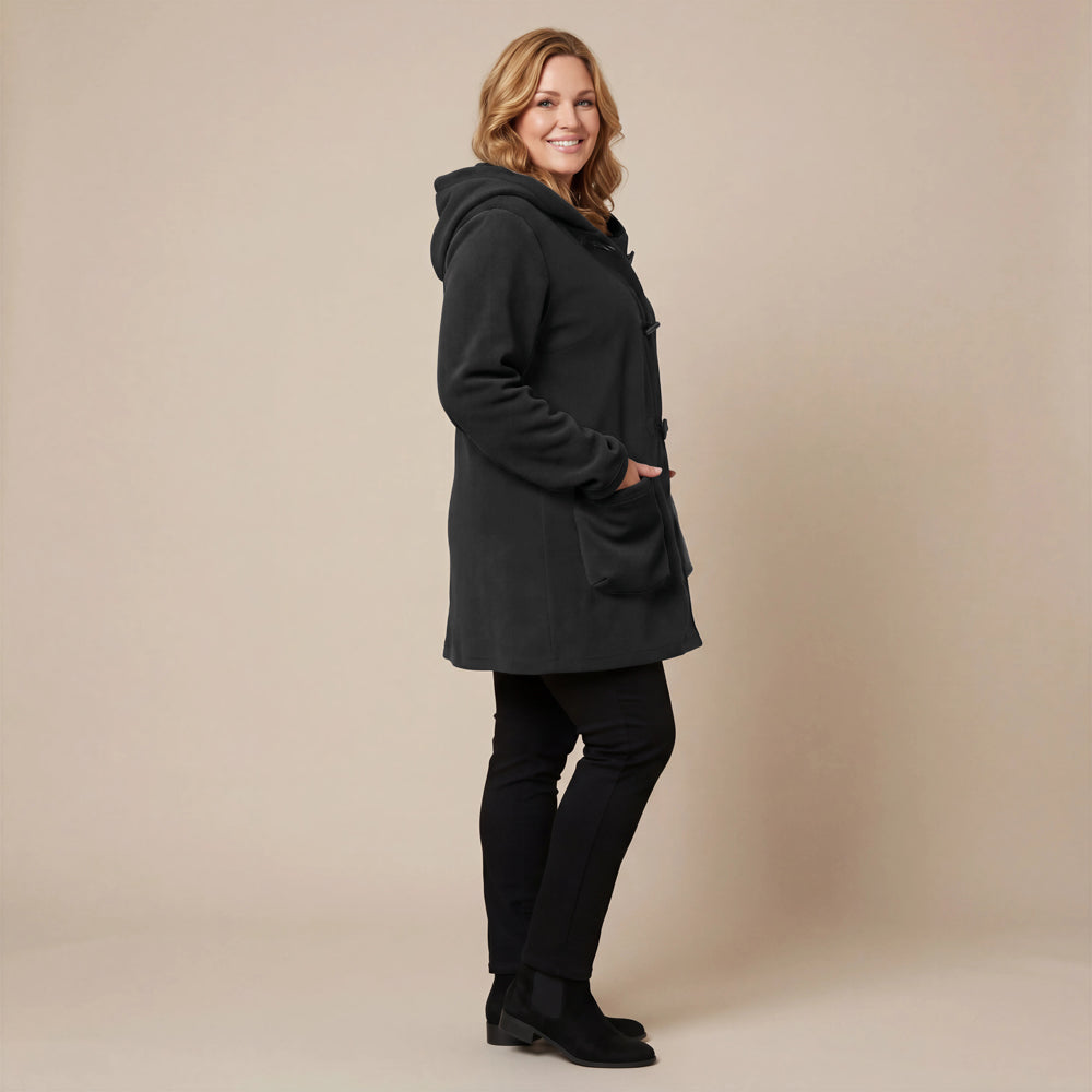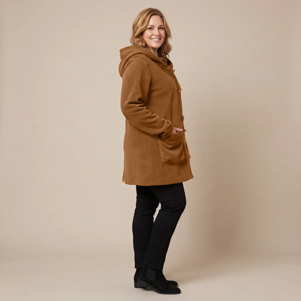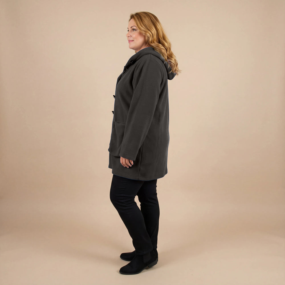 This cozy fleece coat is a statement! The cobalt blue colour is so vibrant that it will brighten any dreary winter day. There are so many interesting design elements on this coat that make it stand out. The pockets, the attached scarf and interesting buttons. I know this coat will be one to reach for in the cold days ahead!