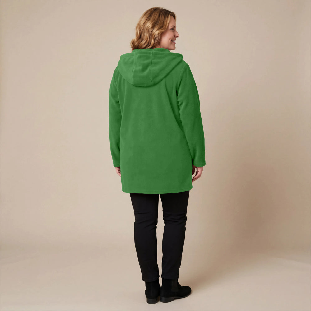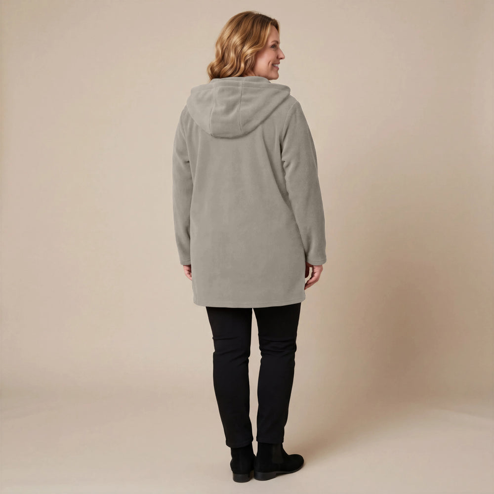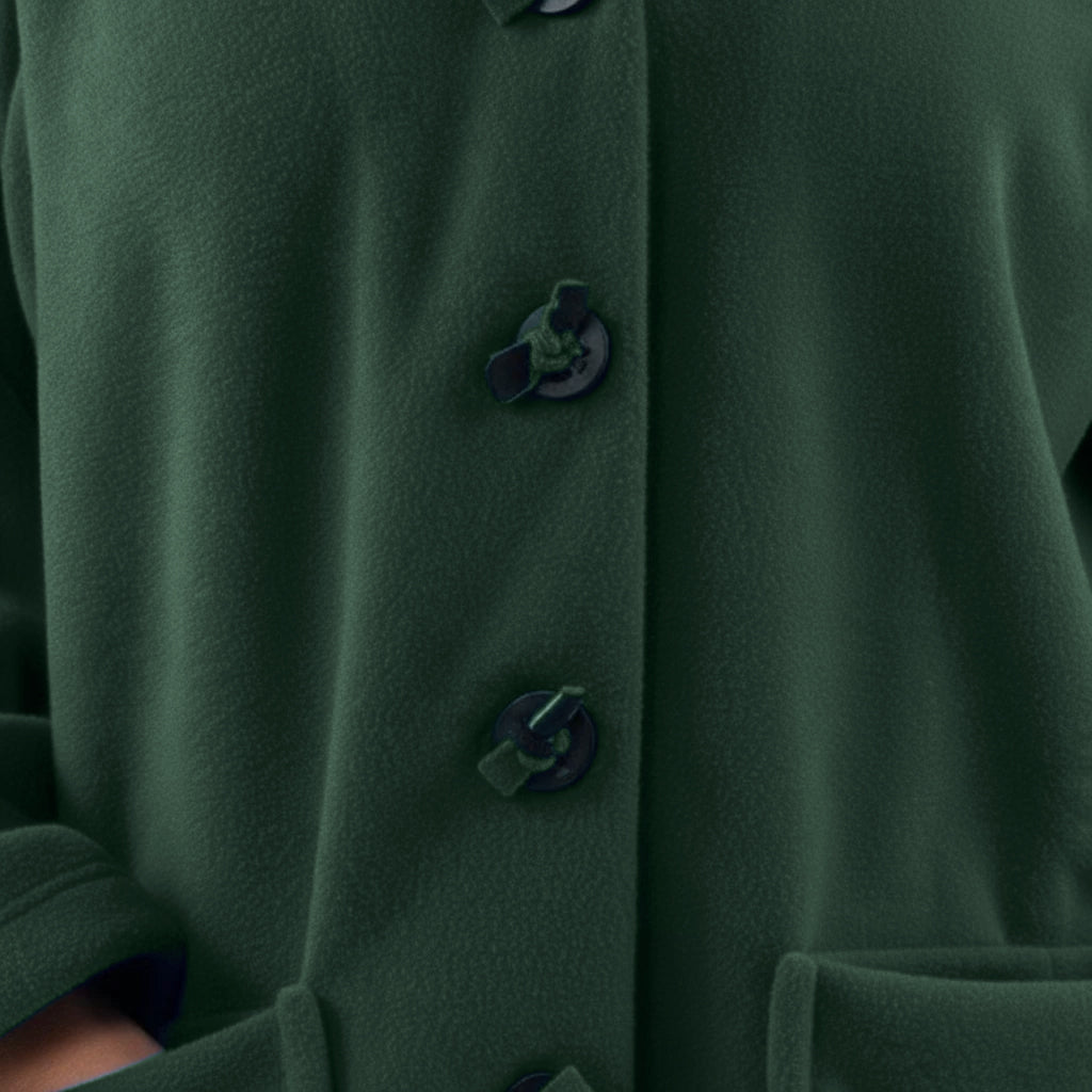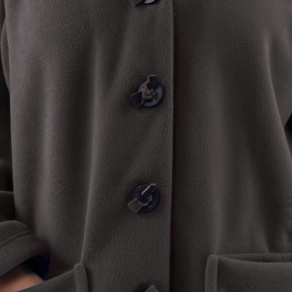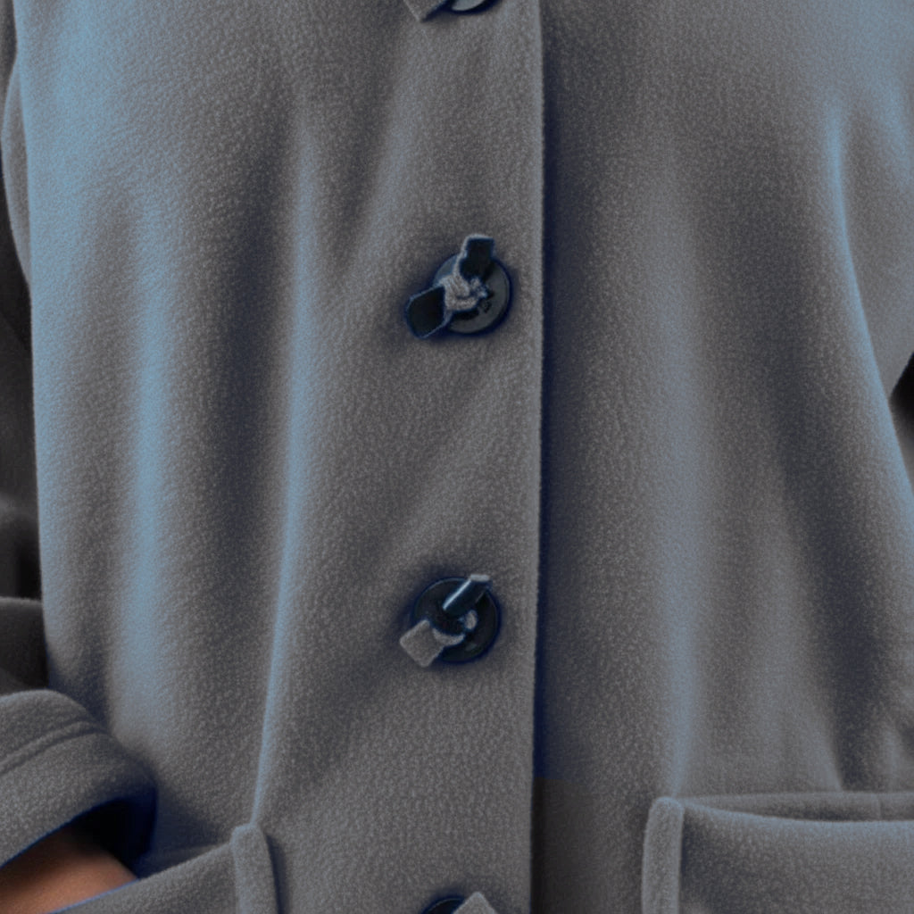 Questa giacca sportiva di media lunghezza di Boris Industries è perfetta per le mezze stagioni. La giacca è realizzata in fleece di alta qualità e presenta un grande cappuccio e tasche evidenti che pendono sul fondo. La giacca si chiude con grandi bottoni e offre comfort e calore in un design elegante. Una scelta versatile che si abbina facilmente.