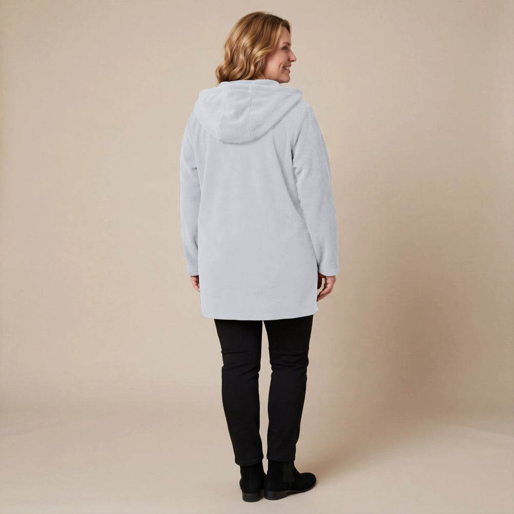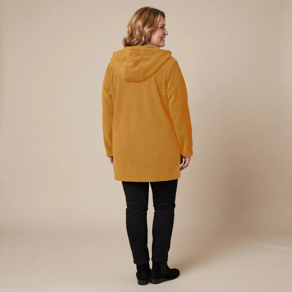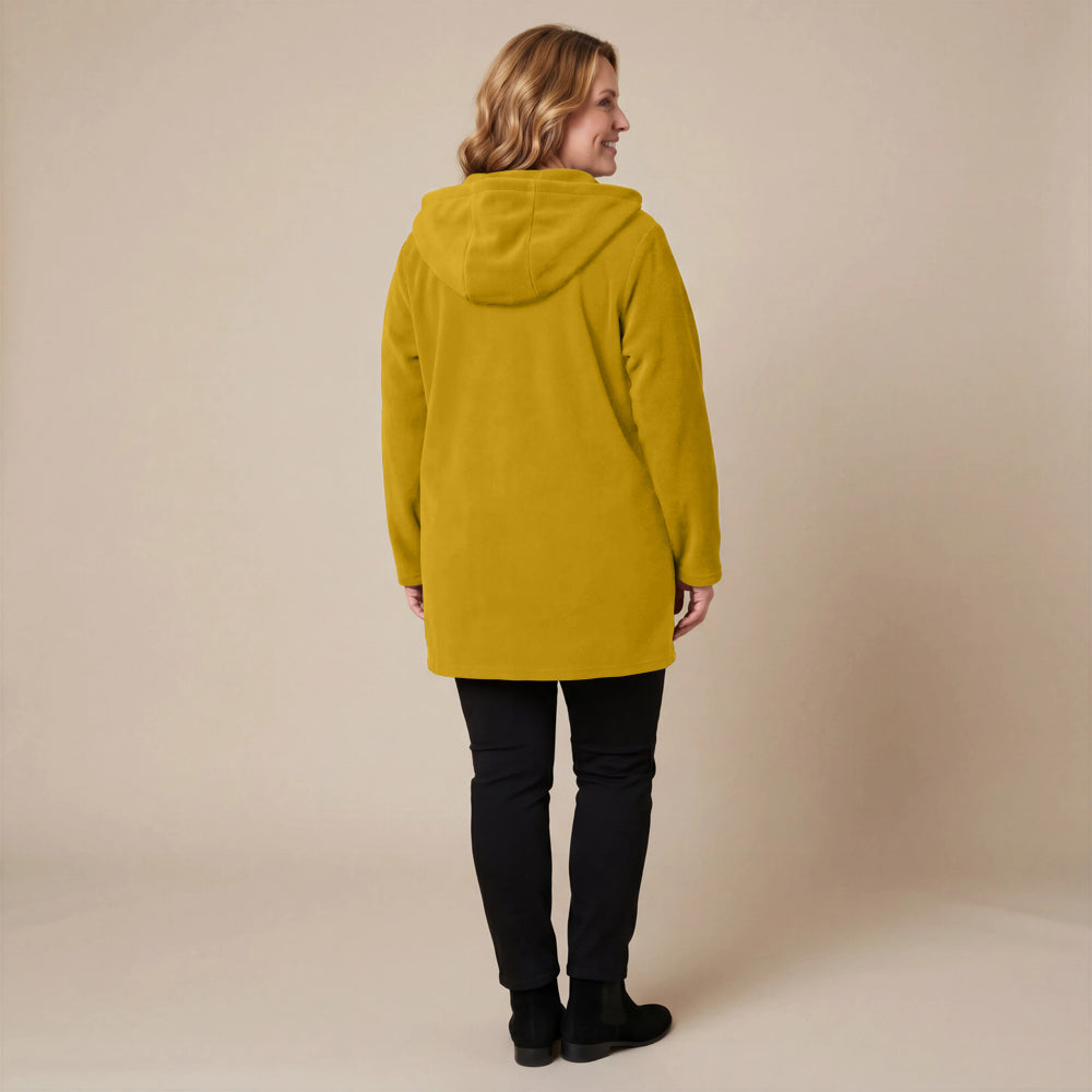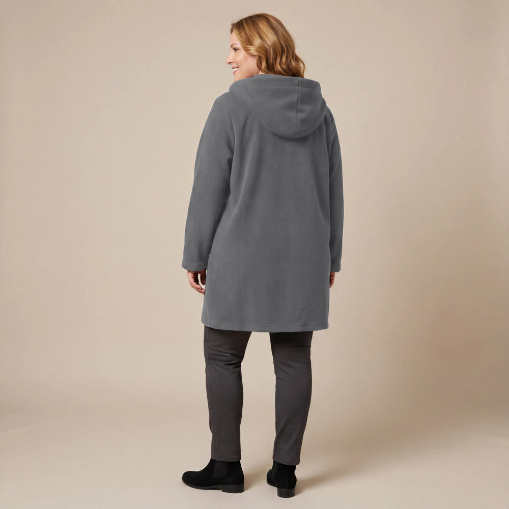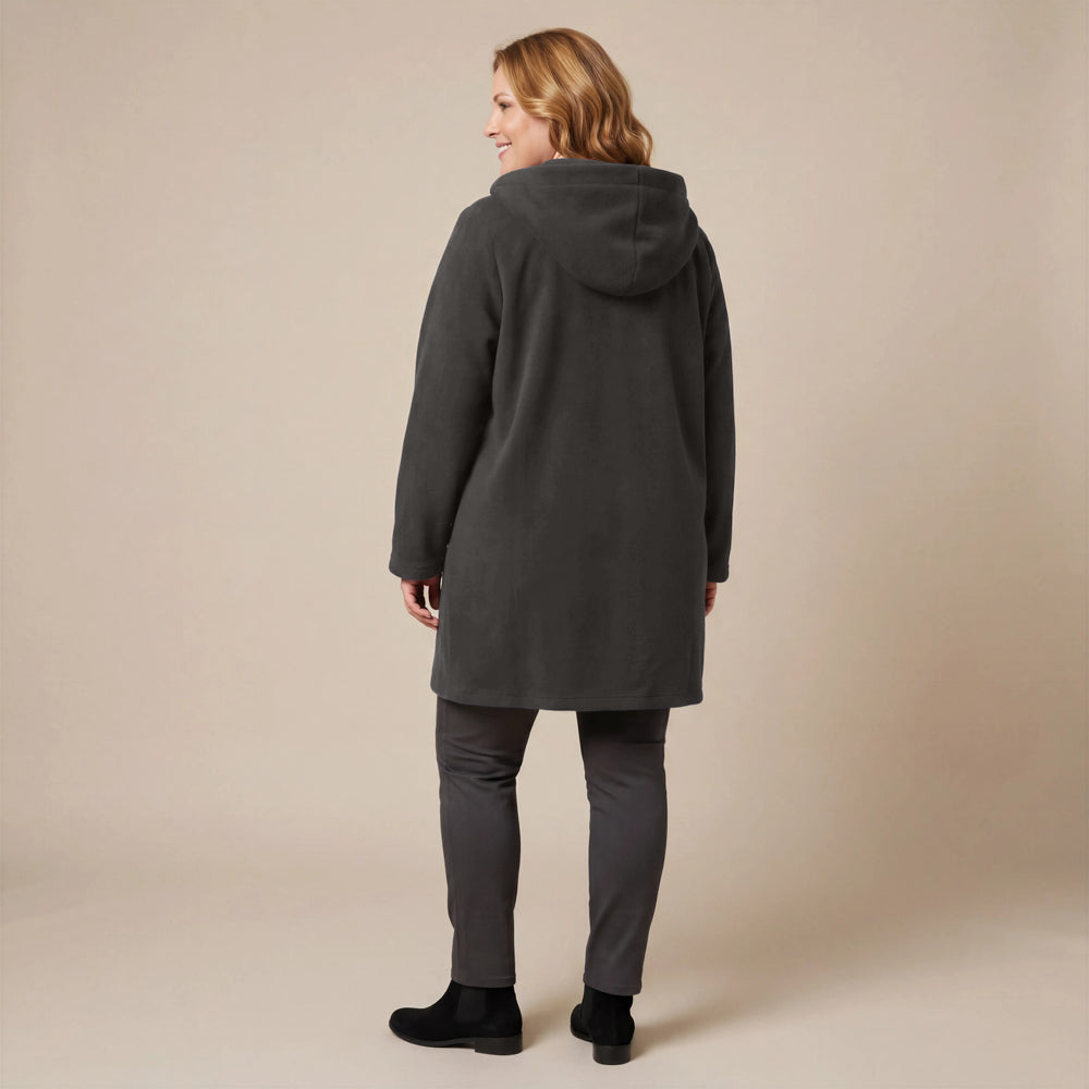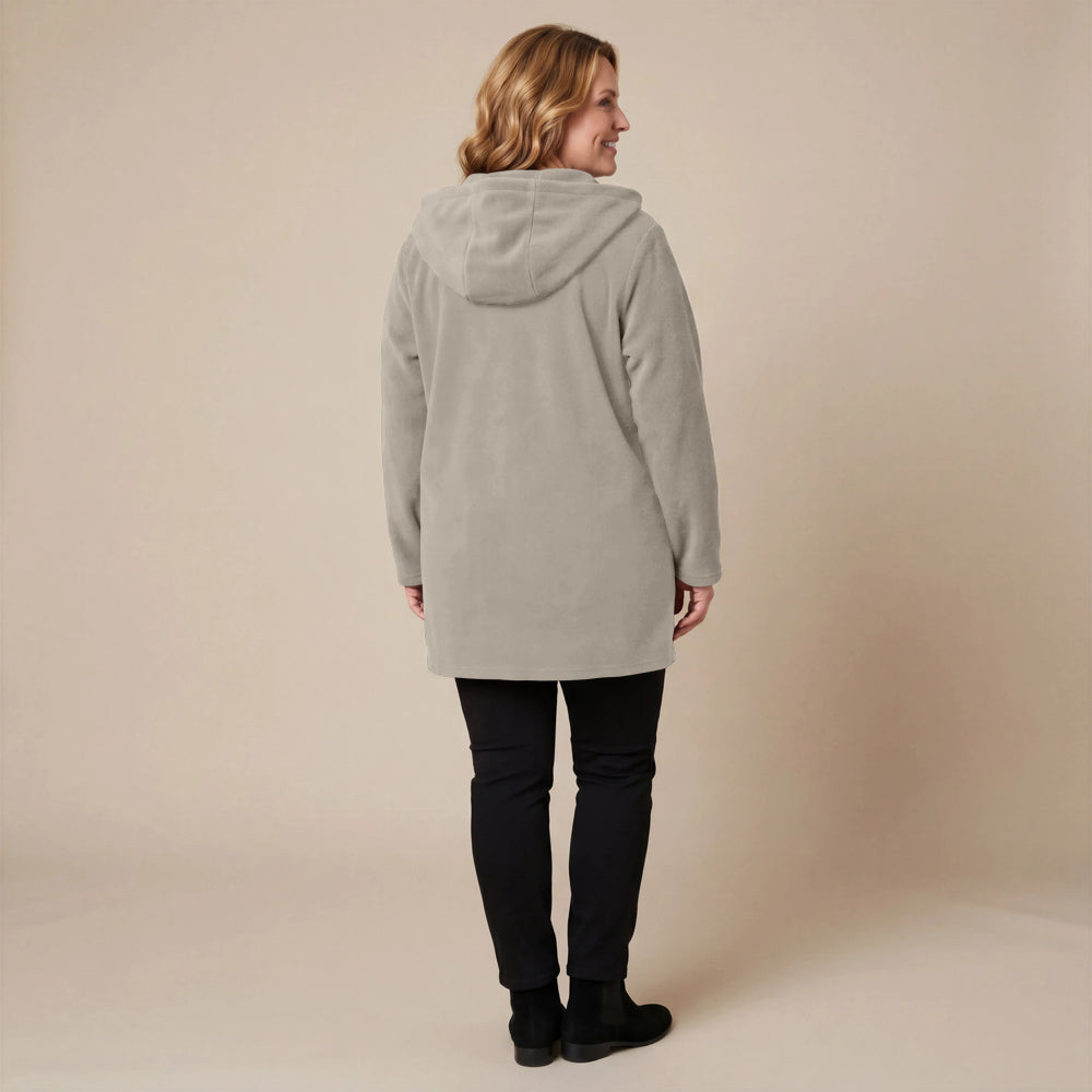 Questa giacca sportiva di media lunghezza di Boris Industries è perfetta per le mezze stagioni. La giacca è realizzata in fleece di alta qualità e presenta un grande cappuccio e tasche evidenti che pendono sul fondo. La giacca si chiude con grandi bottoni e offre comfort e calore in un design elegante. Una scelta versatile che si abbina facilmente.
