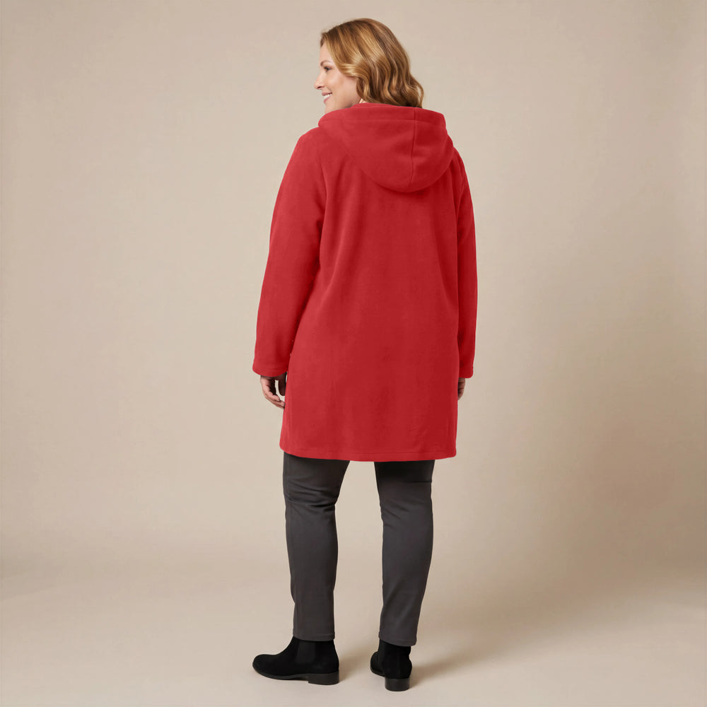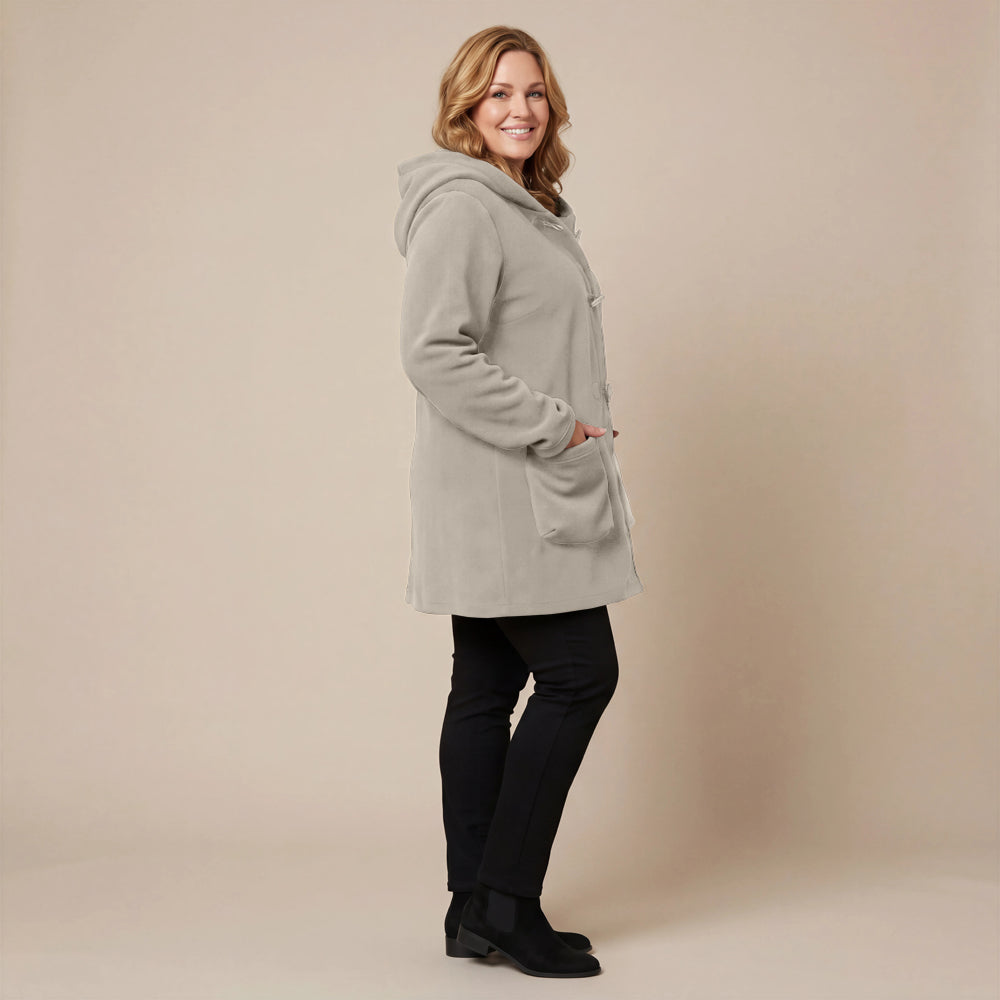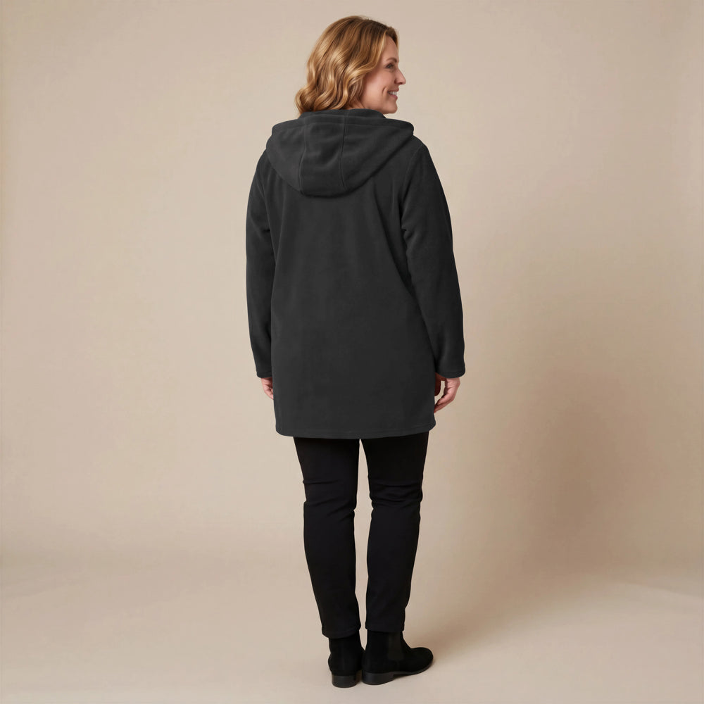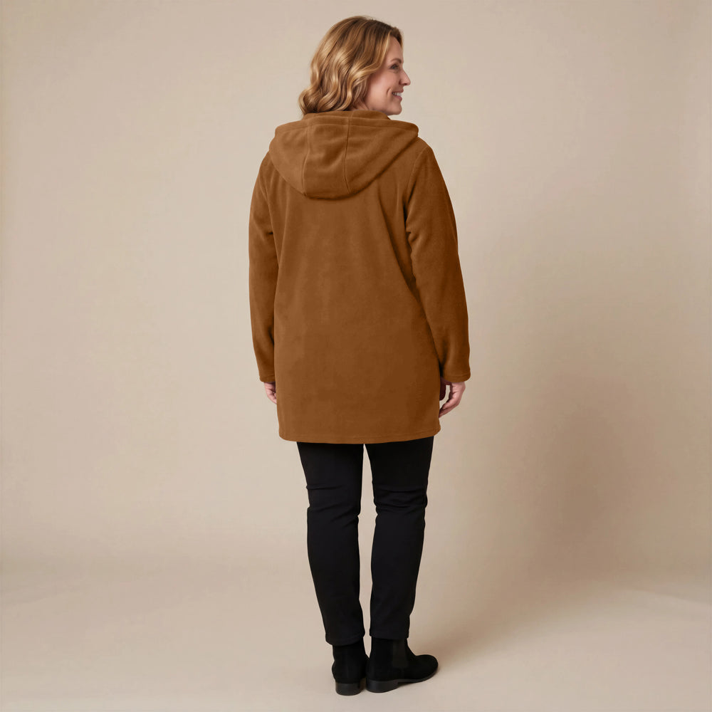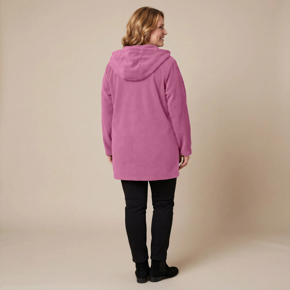 Questa giacca sportiva di media lunghezza di Boris Industries è perfetta per le mezze stagioni. La giacca è realizzata in fleece di alta qualità e presenta un grande cappuccio e tasche evidenti che pendono sul fondo. La giacca si chiude con grandi bottoni e offre comfort e calore in un design elegante. Una scelta versatile che si abbina facilmente.