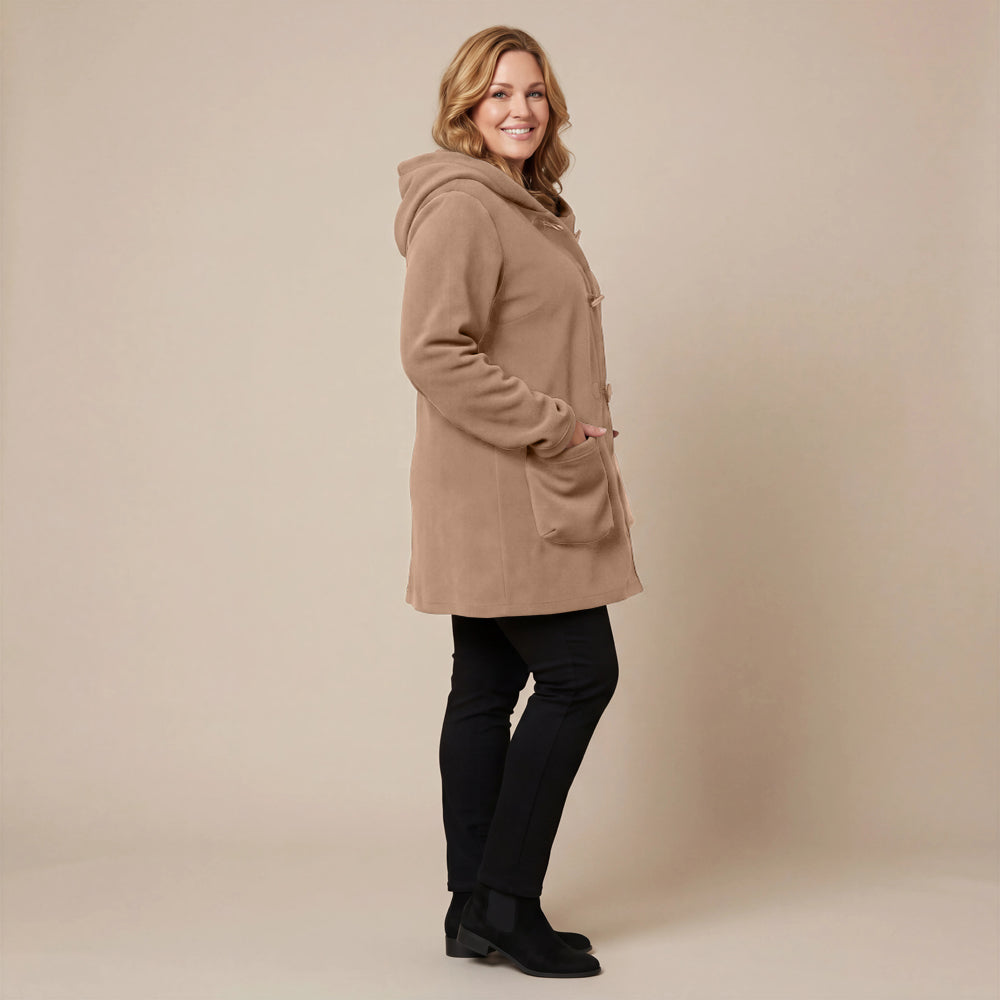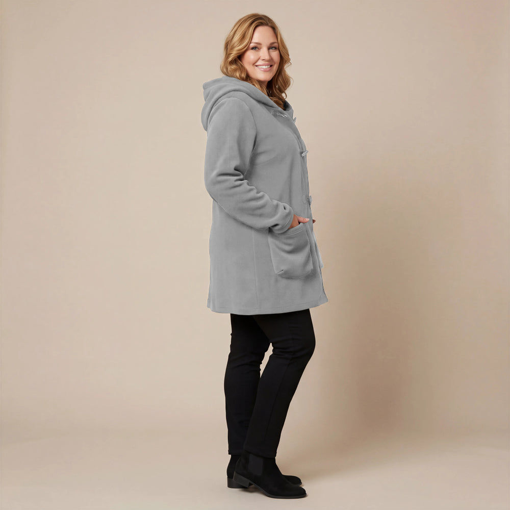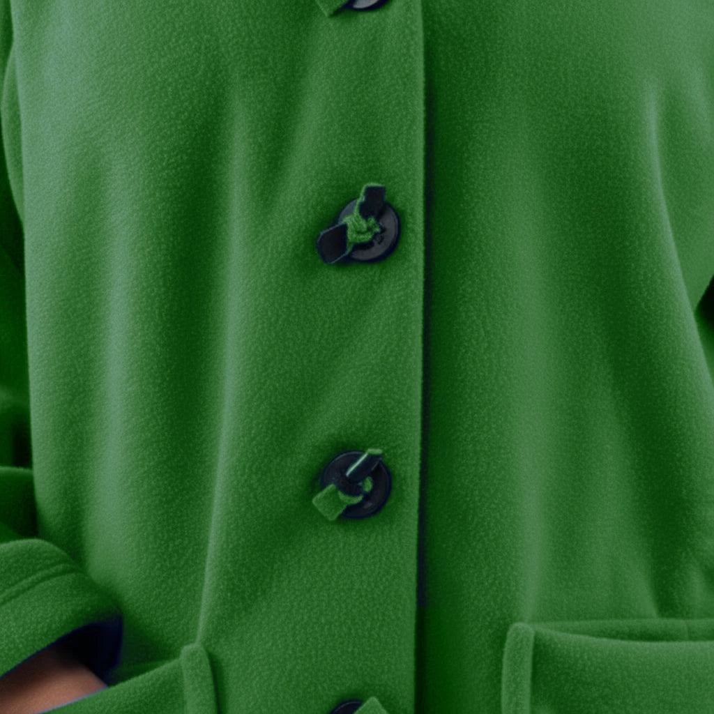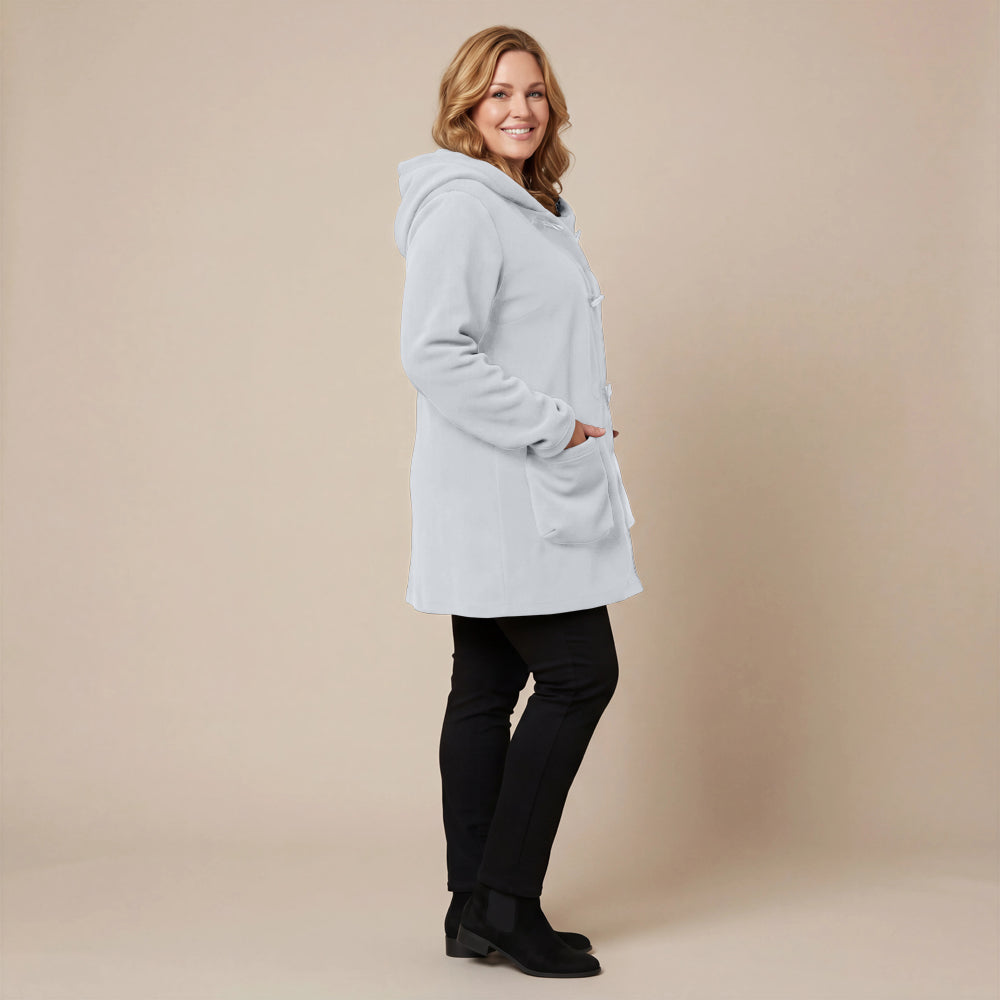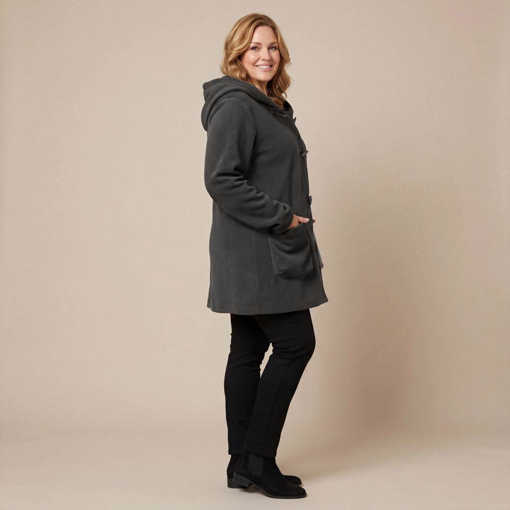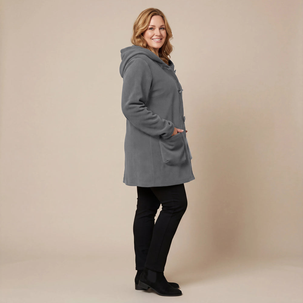 Questa giacca sportiva di media lunghezza di Boris Industries è perfetta per le mezze stagioni. La giacca è realizzata in fleece di alta qualità e presenta un grande cappuccio e tasche evidenti che pendono sul fondo. La giacca si chiude con grandi bottoni e offre comfort e calore in un design elegante. Una scelta versatile che si abbina facilmente.