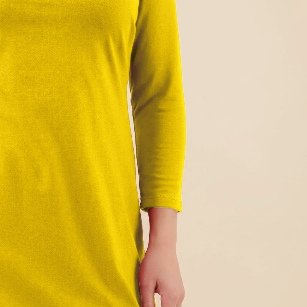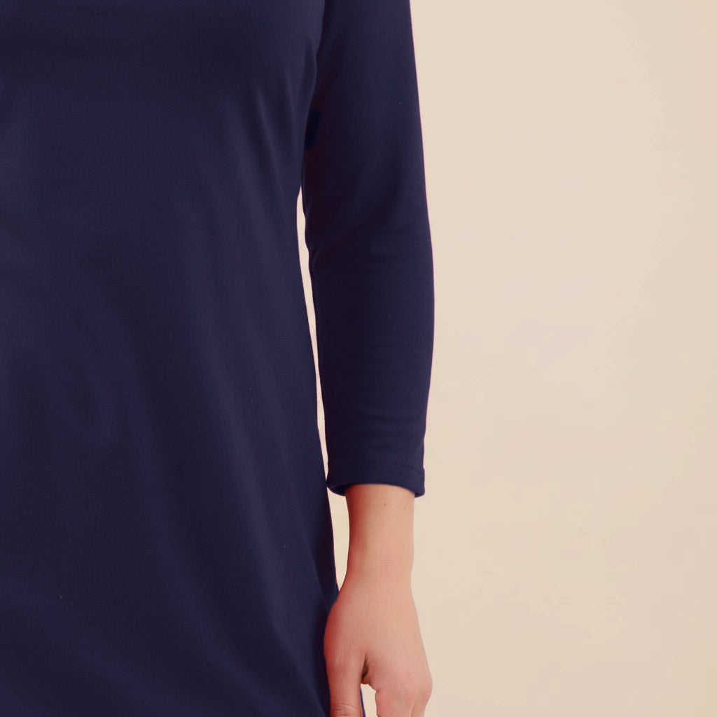 Figursydd kjole med 3/4 ermer. Denne kjolen sitter ikke veldig tett, og er laget av en tung kvalitet viskose med en myk innside.