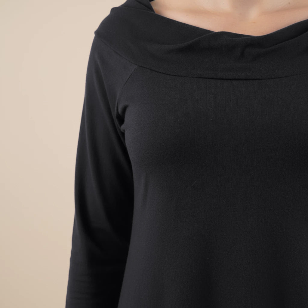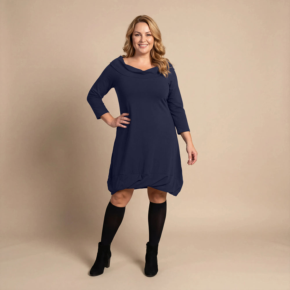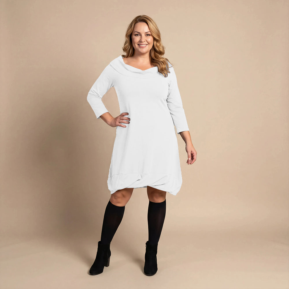 Boris Industries kjole med båthals er en sjarmerende kjole med 3/4 ermer. Båthalsen er vid og pyntet med en lett krage. Skjørtet går ut i A-linje med en bred dobbel søm nederst. Foran er det subtilt kortere enn bak.