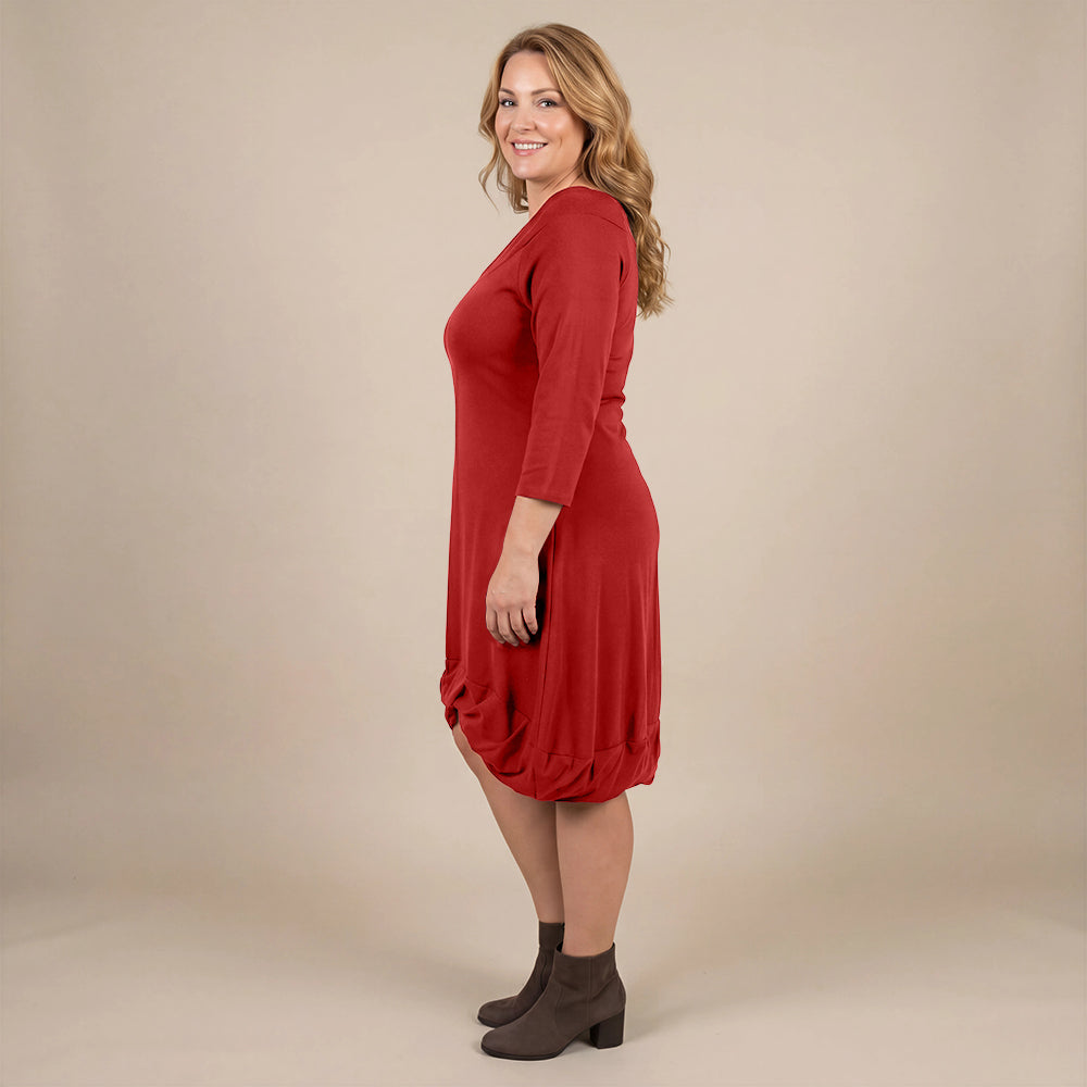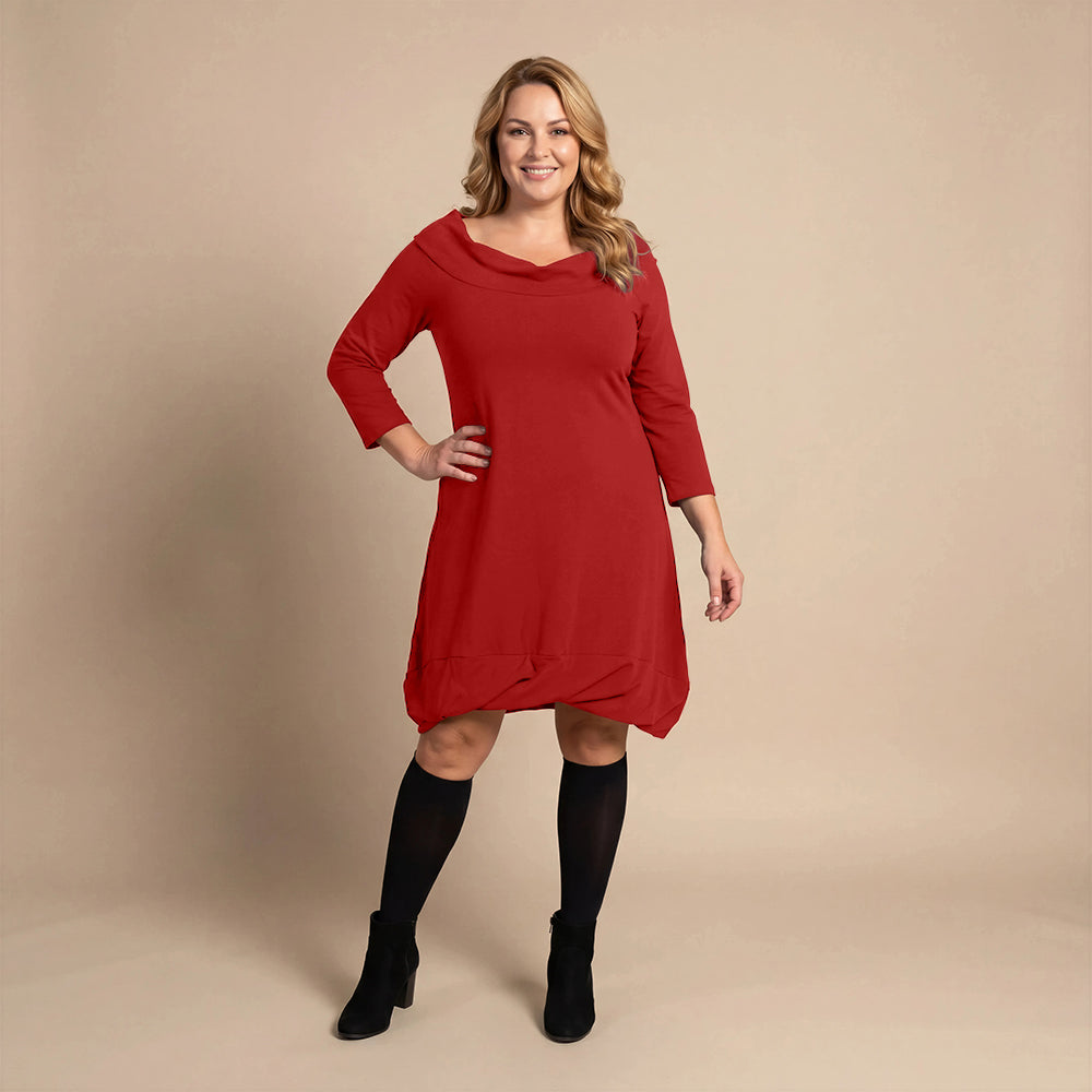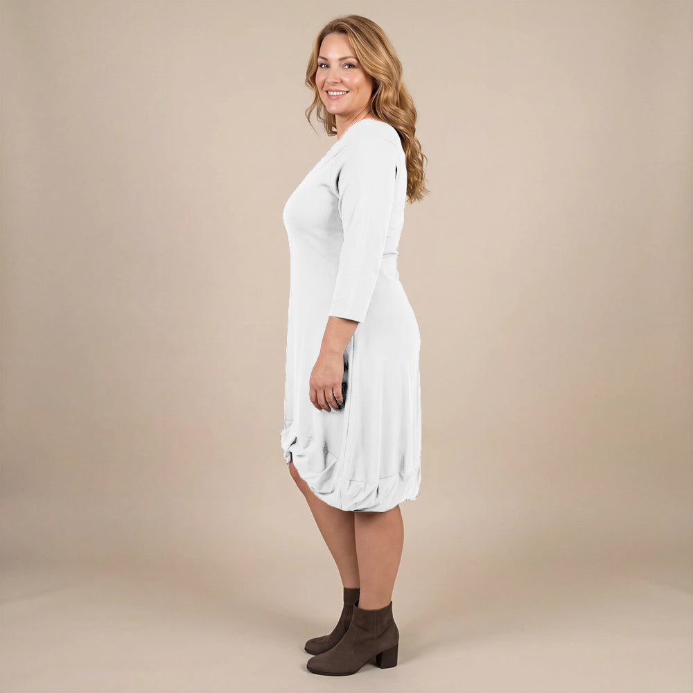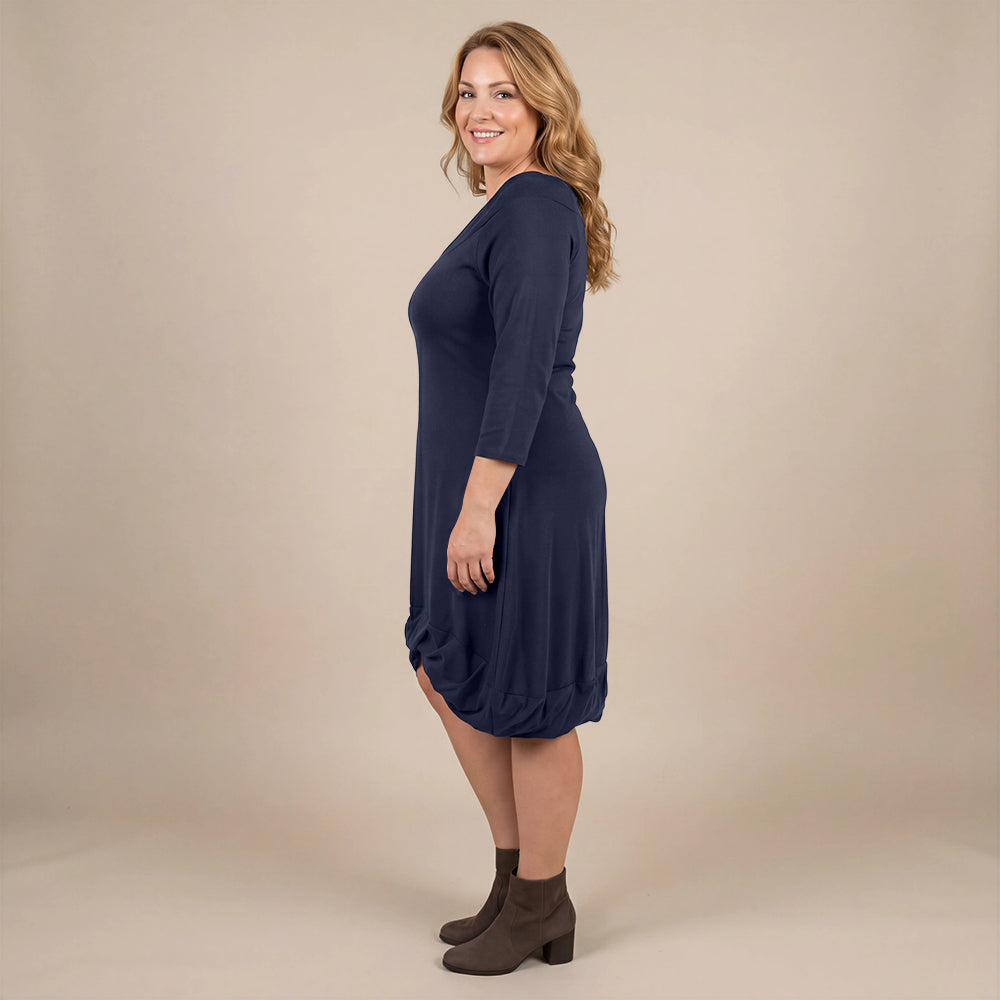 Boris Industries kjole med båthals er en sjarmerende kjole med 3/4 ermer. Båthalsen er vid og pyntet med en lett krage. Skjørtet går ut i A-linje med en bred dobbel søm nederst. Foran er det subtilt kortere enn bak.