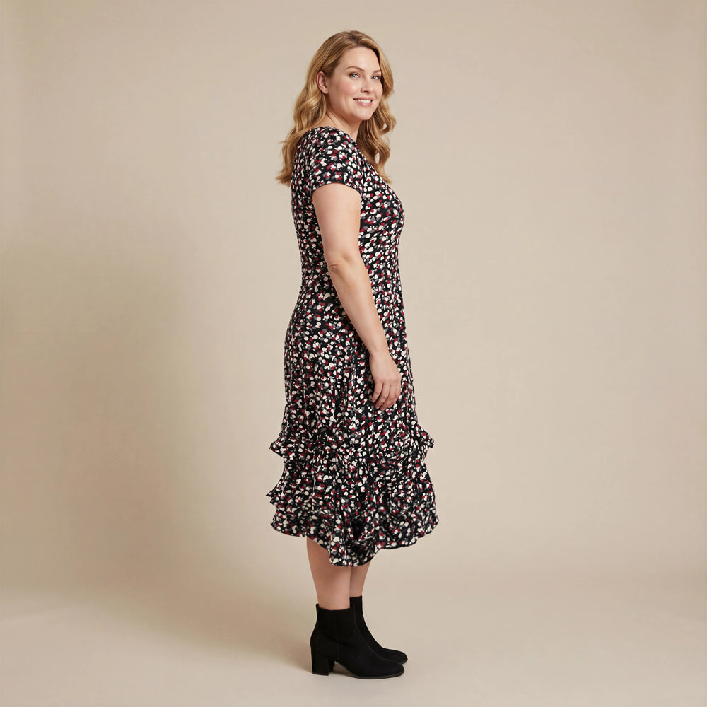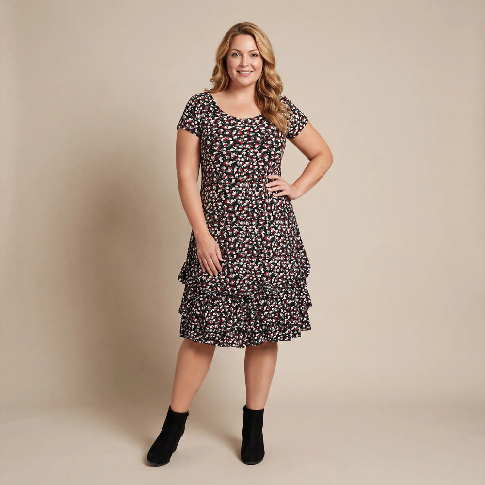 Boris Industries kjole med korte ermer. En vakker sommerkjole med blomsterprint, tilgjengelig i fargene gammel rosa, fuchsia og bordeaux. De innsydd "hjørnene" får kanten til å stå fint ut. Et must-have for alle! Vi blir veldig glade av denne kjolen.