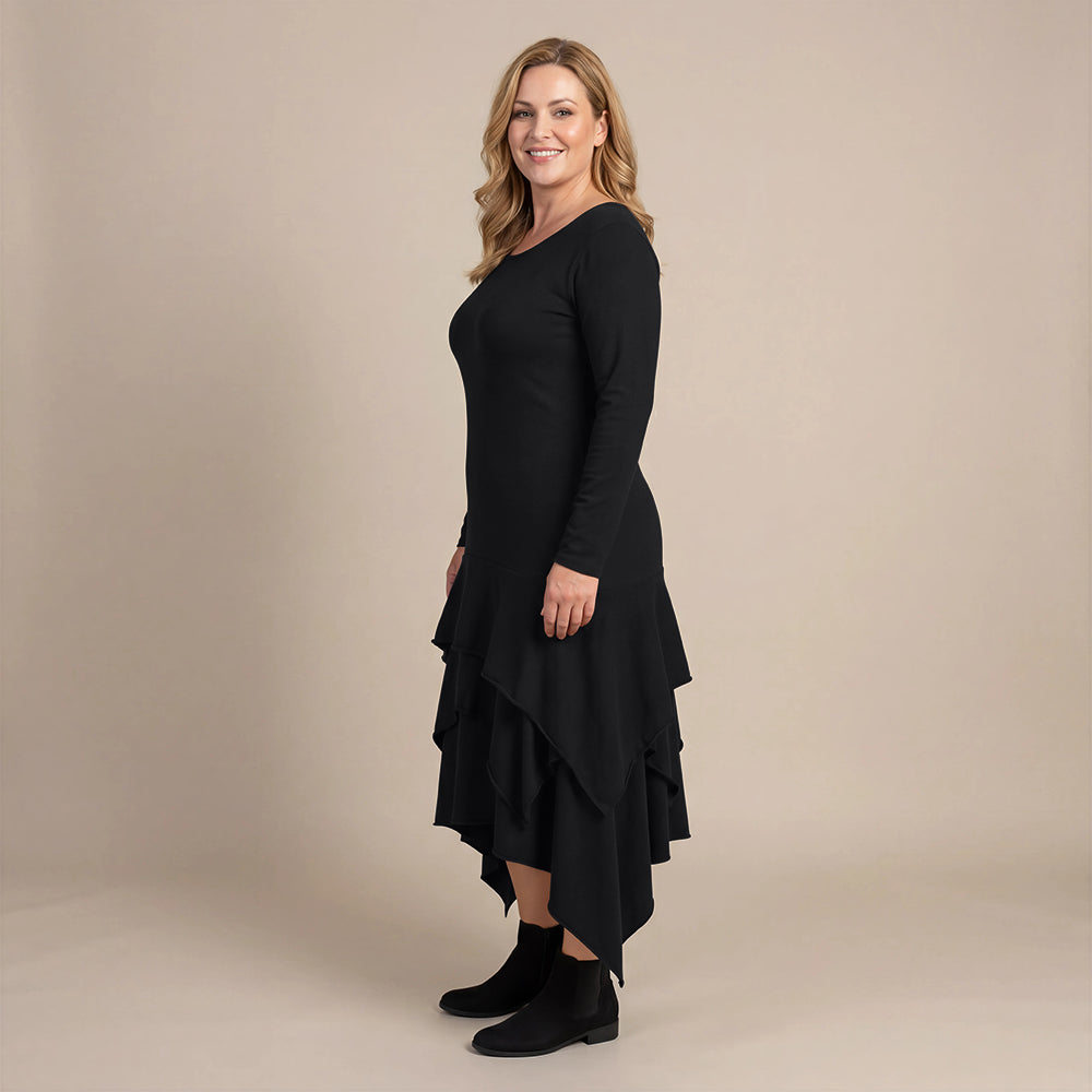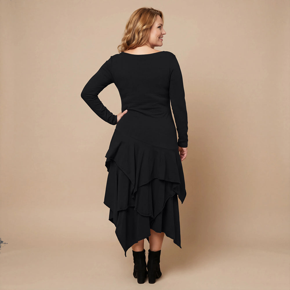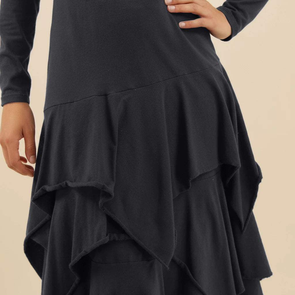 Boris Industries kjole med volanger er en vakker, ganske rett kjole med volanger fra hoftene, lange ermer og en vakker hals. Vi synes den har en litt bohemsk stil, fantastisk kjole med svingende stil.
