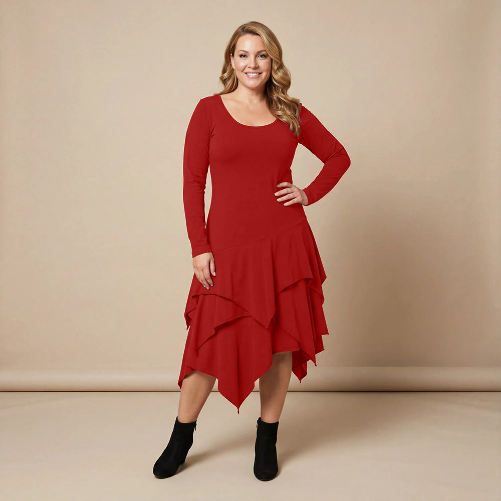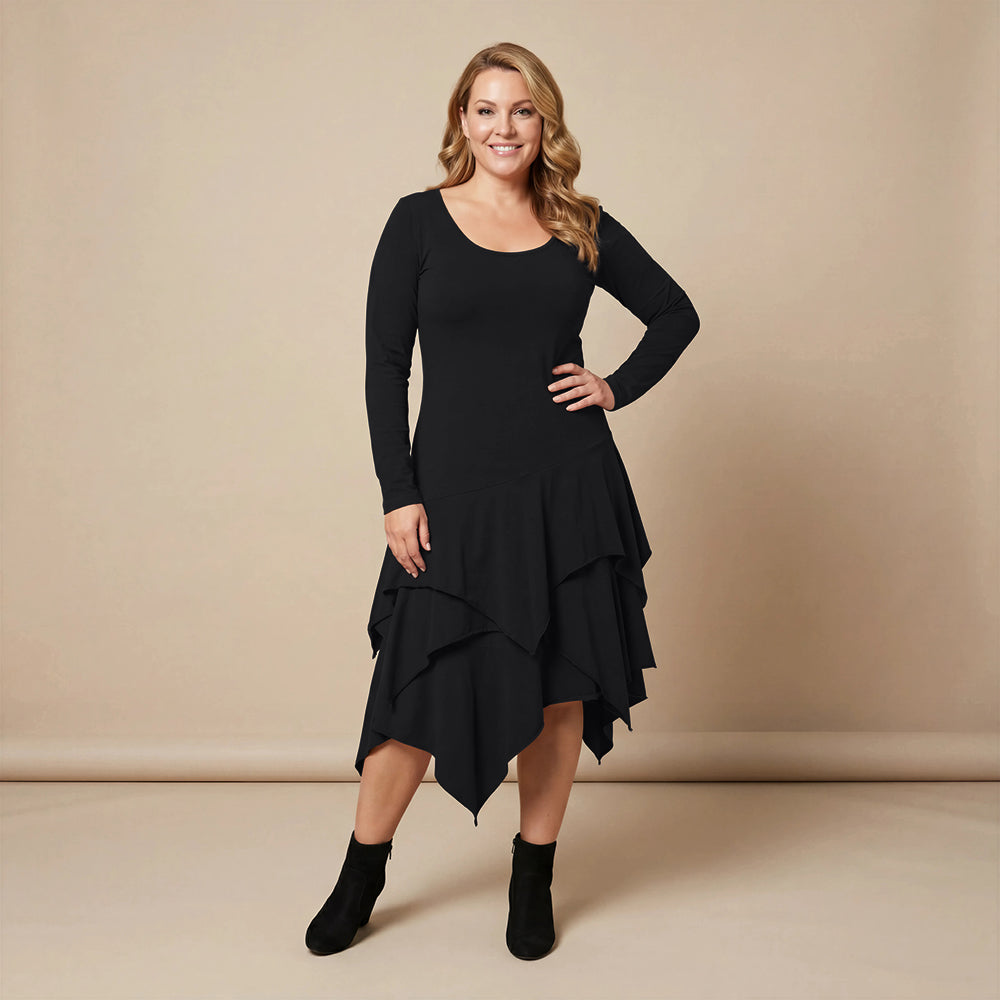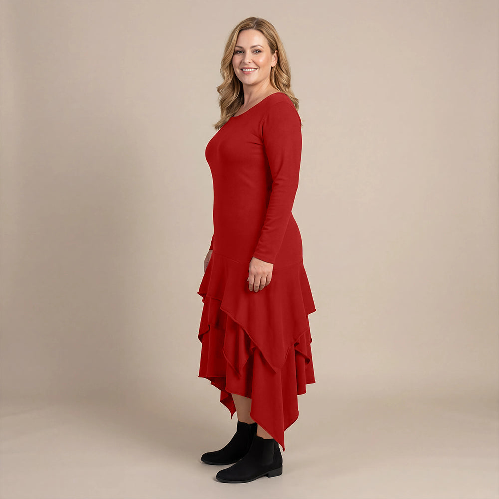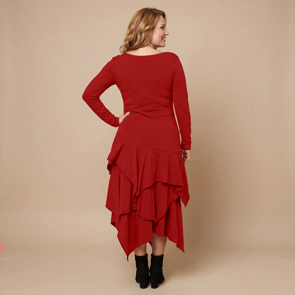 Boris Industries kjole med volanger er en vakker, ganske rett kjole med volanger fra hoftene, lange ermer og en vakker hals. Vi synes den har en litt bohemsk stil, fantastisk kjole med svingende stil.