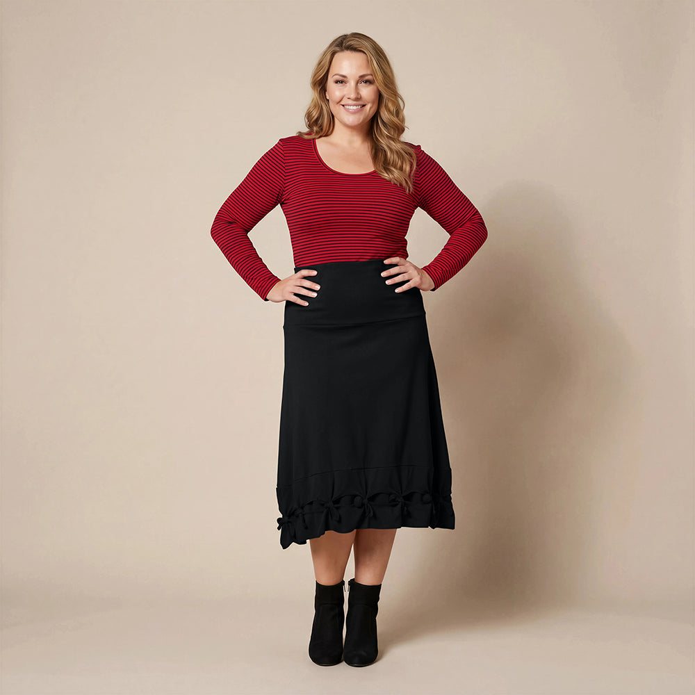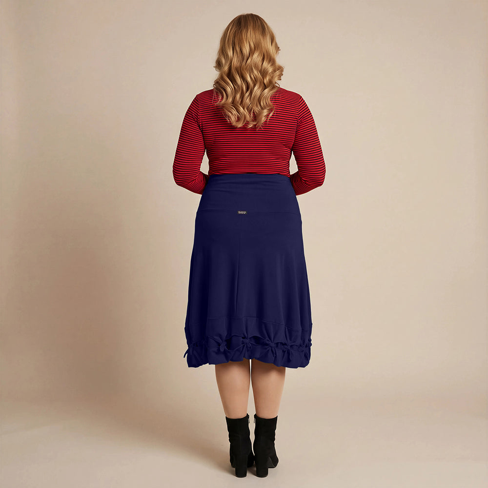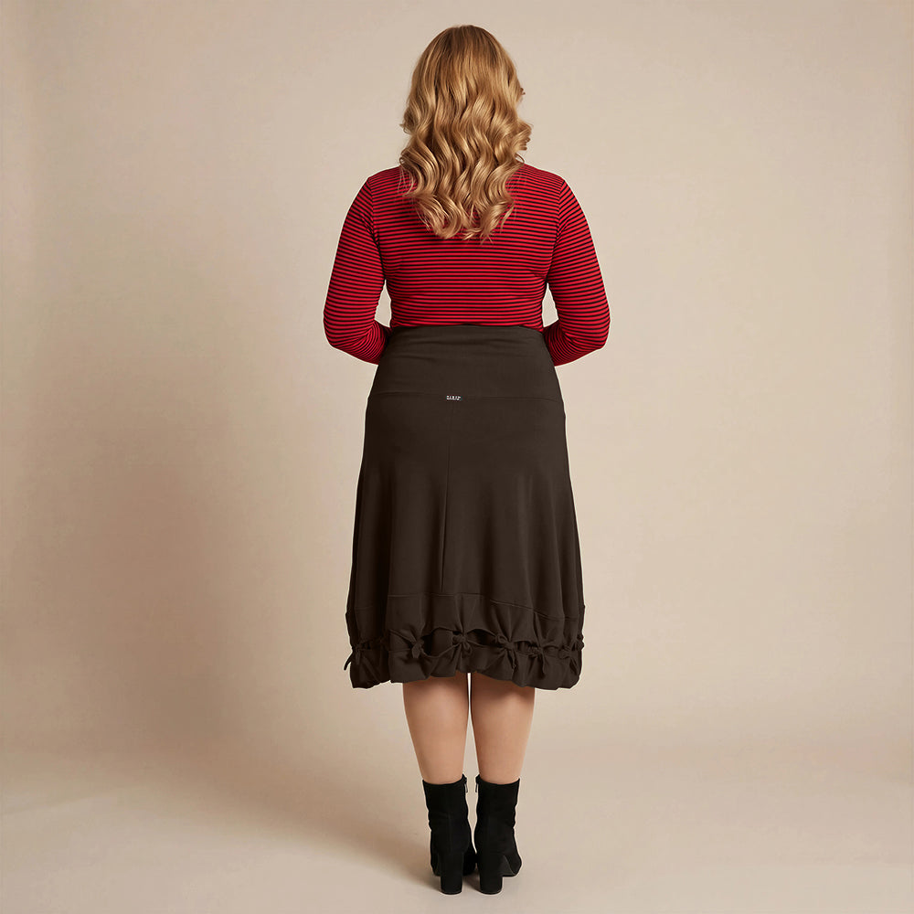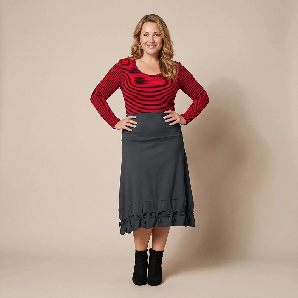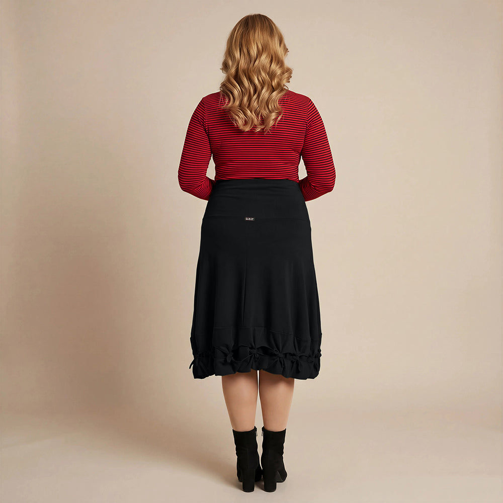 Dette knelengde skjørtet fra Boris Industries er et allsidig plagg med en bred midjebånd og iøynefallende sløyfer nederst. Laget av en komfortabel bomull-elastomer blanding.