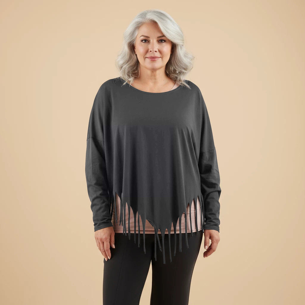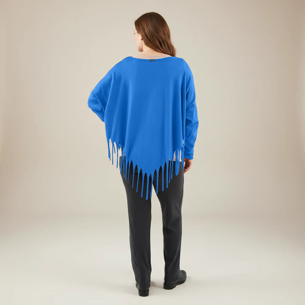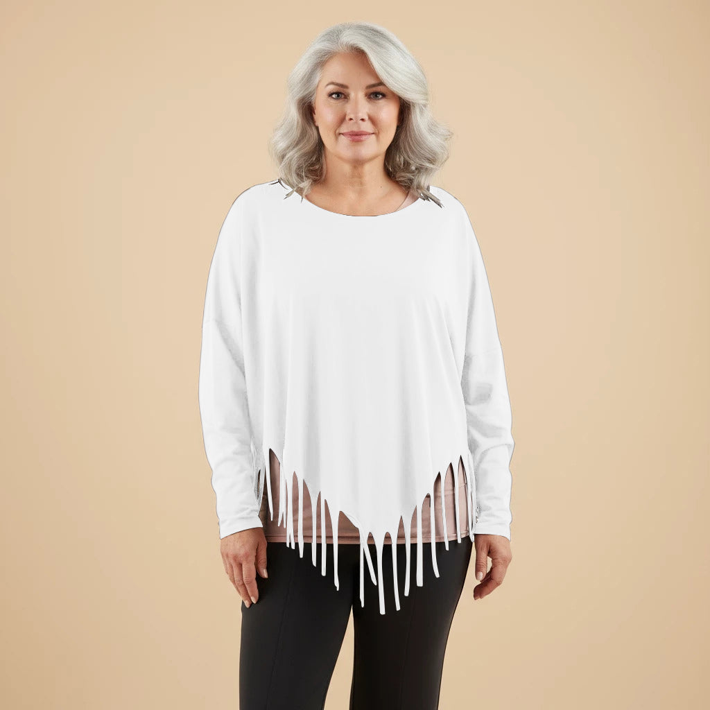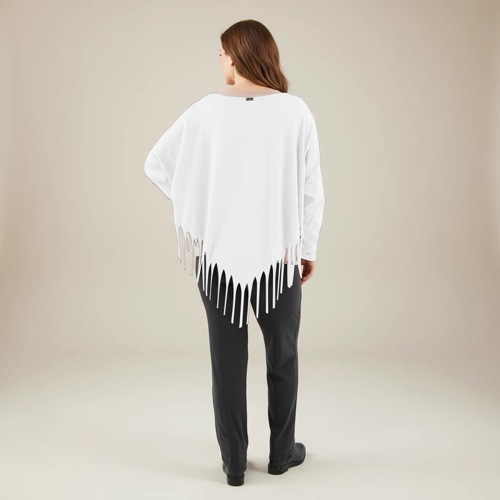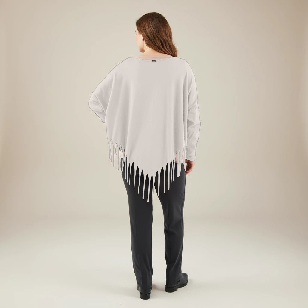 Oppdag et lekent og elegant tillegg til garderoben din med denne vide skjorten fra Boris Industries. Skjorten har en spesiell spiss kutt i bunnen og er dekorert med frynser, noe som gir et unikt utseende. Med sin komfortable one-size passform er denne skjorten perfekt for et avslappet og moteriktig utseende.