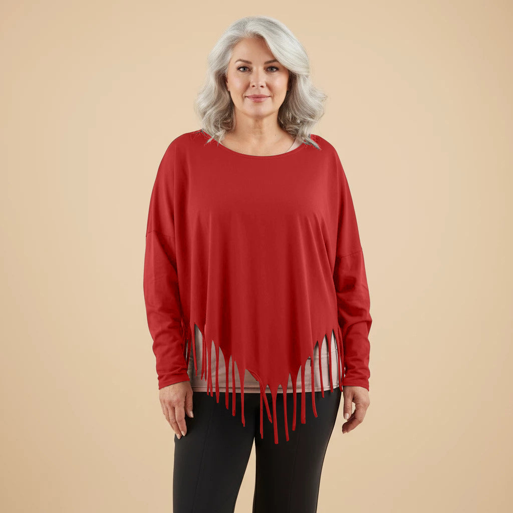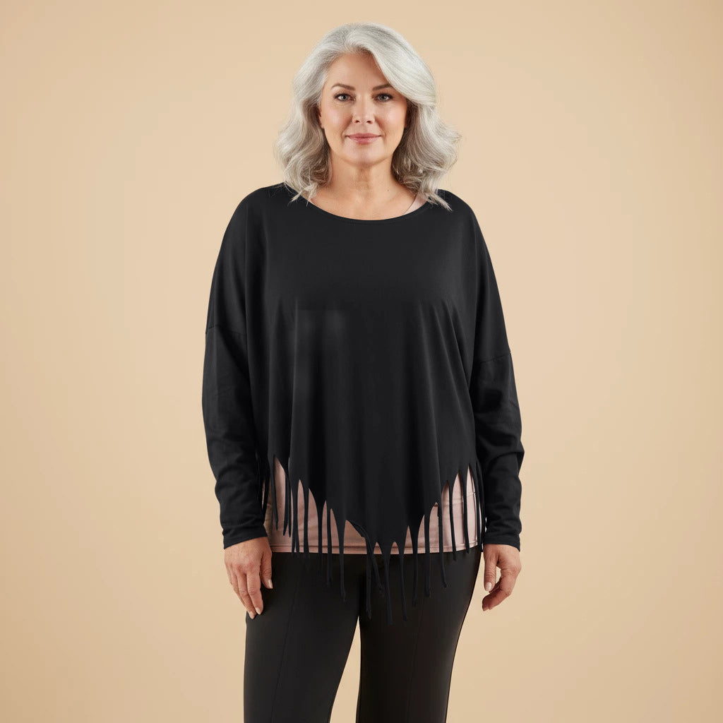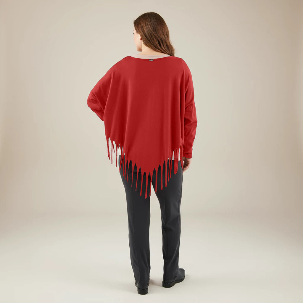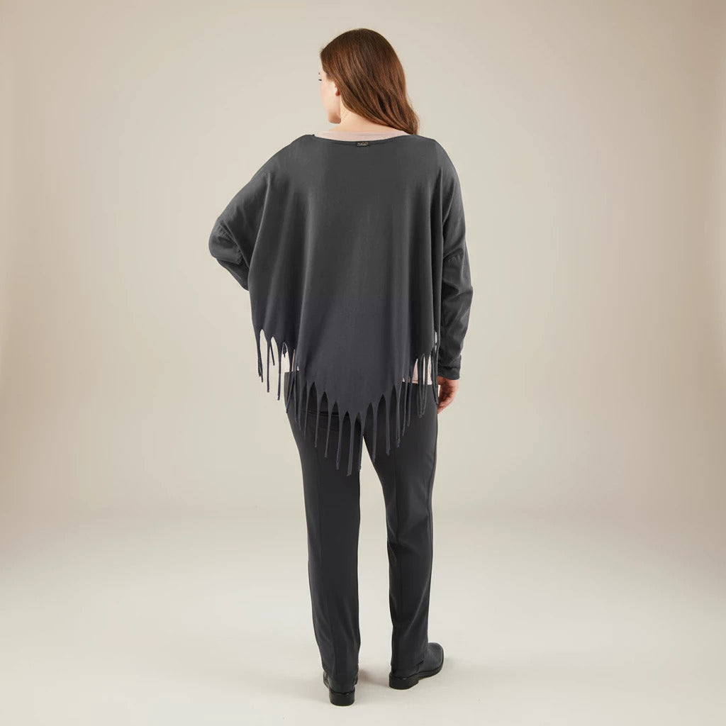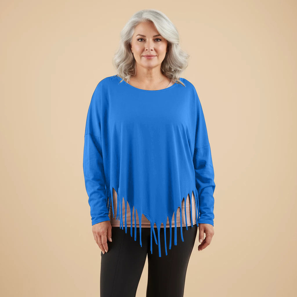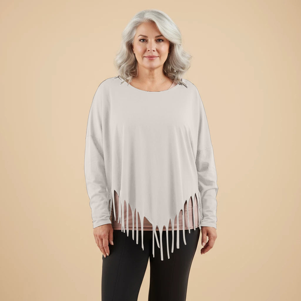 Oppdag et lekent og elegant tillegg til garderoben din med denne vide skjorten fra Boris Industries. Skjorten har en spesiell spiss kutt i bunnen og er dekorert med frynser, noe som gir et unikt utseende. Med sin komfortable one-size passform er denne skjorten perfekt for et avslappet og moteriktig utseende.