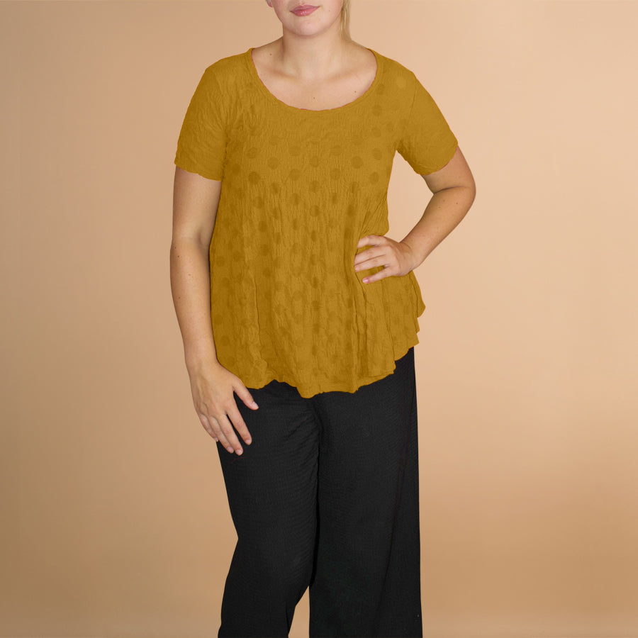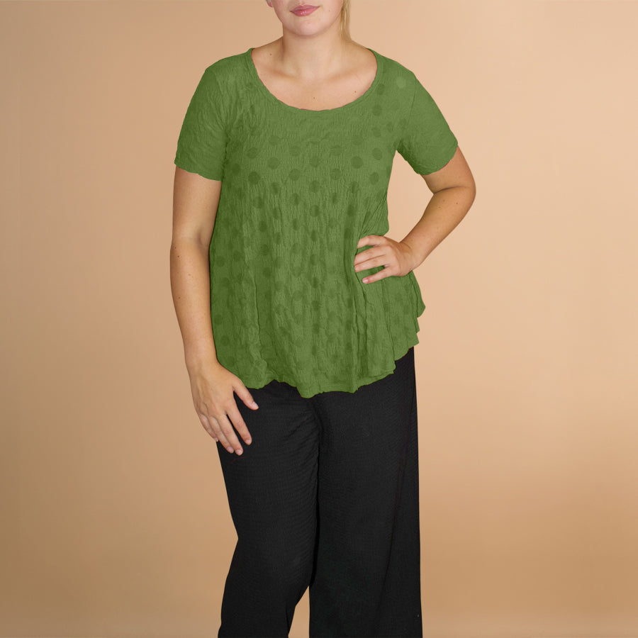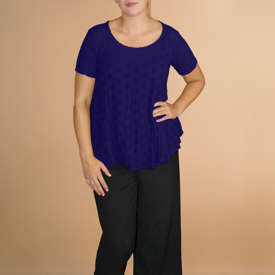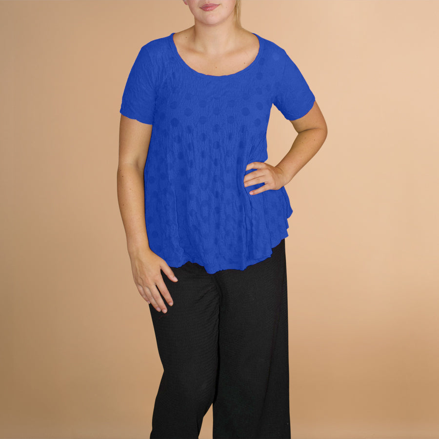 Dit A-lijn shirt van Boris Industries draag je makkelijk over een hemdje of top. De stof is licht en luchtig, met een patroon van kleine bolletjes. De korte mouw maakt het fijn voor warme dagen. Het shirt valt losjes en kleedt mooi af. Je voelt je er meteen fijn in.