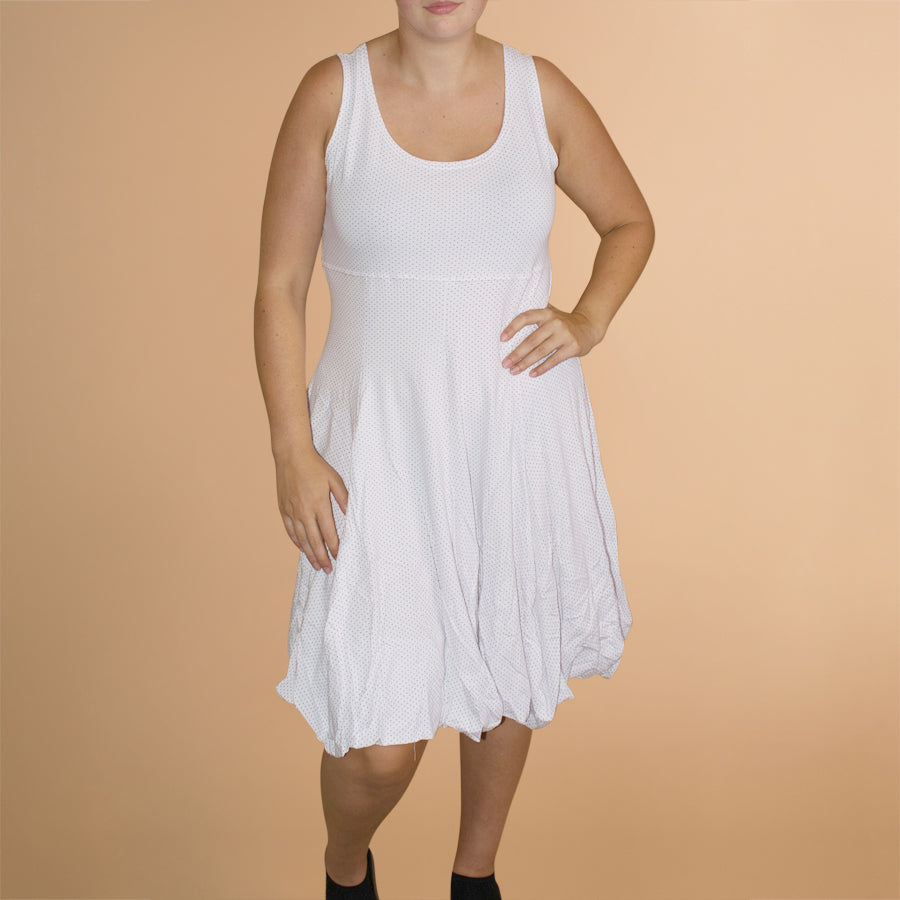 Boris Industries ballonjurk zonder mouw is een elegante jurk die door brede losse zoom leuk uitstaat. Zwierig model met een mooie ronde hals. Fijn als zomerjurk en kan ook prima met een wikkelvest gecombineerd worden. De jurk is verkrijgbaar in het lichte streepje, donkere streepje, zwart/witte stip, wit/zwarte stip en in effen zwart. Materiaal voelt aan als zachte tricot.