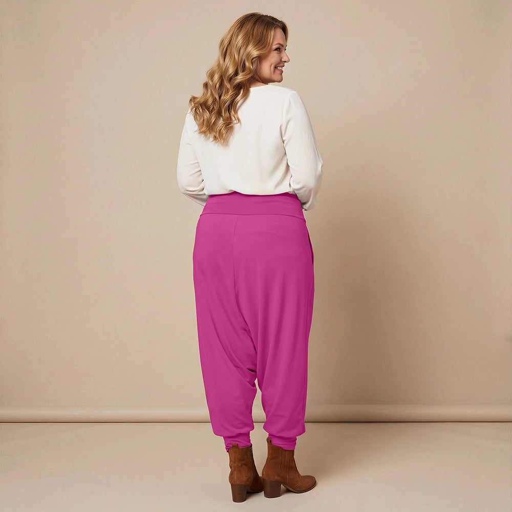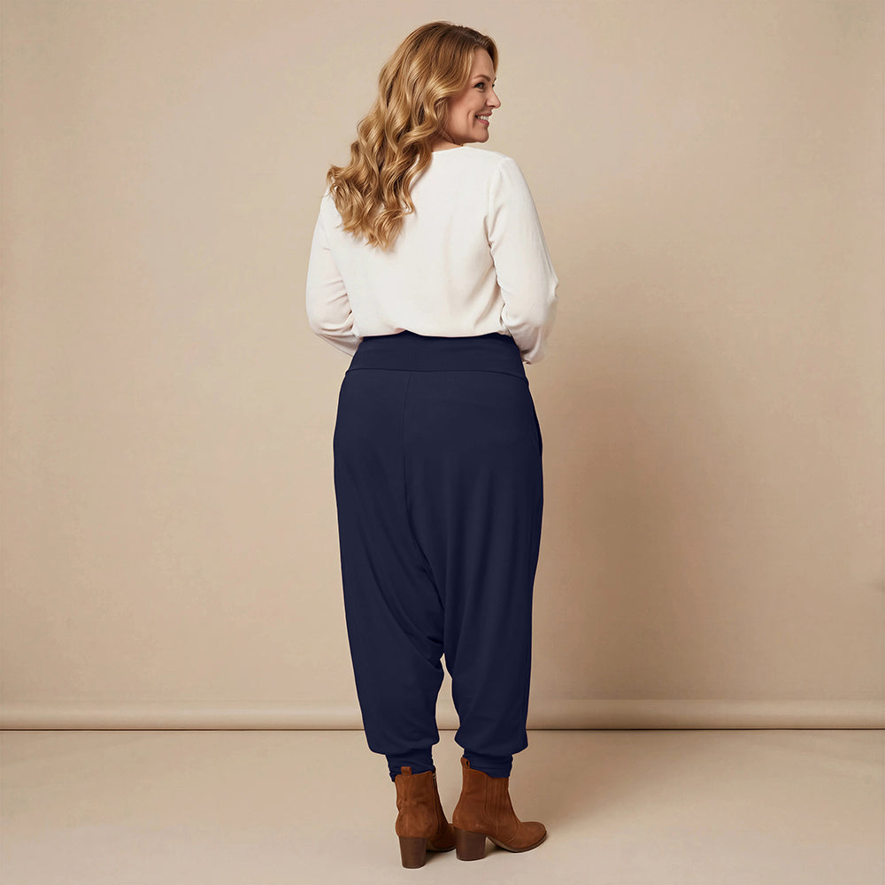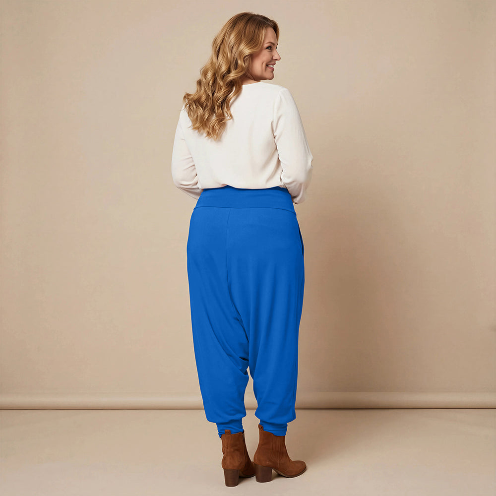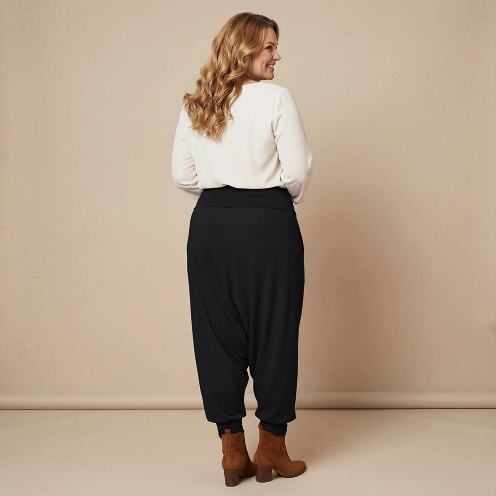 - Pasvorm: haremmodel met brede tailleband en boorden onderaan (ruim vallend)