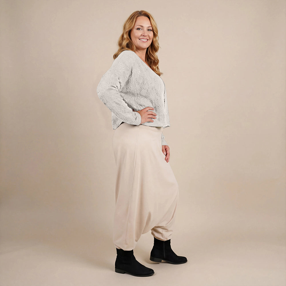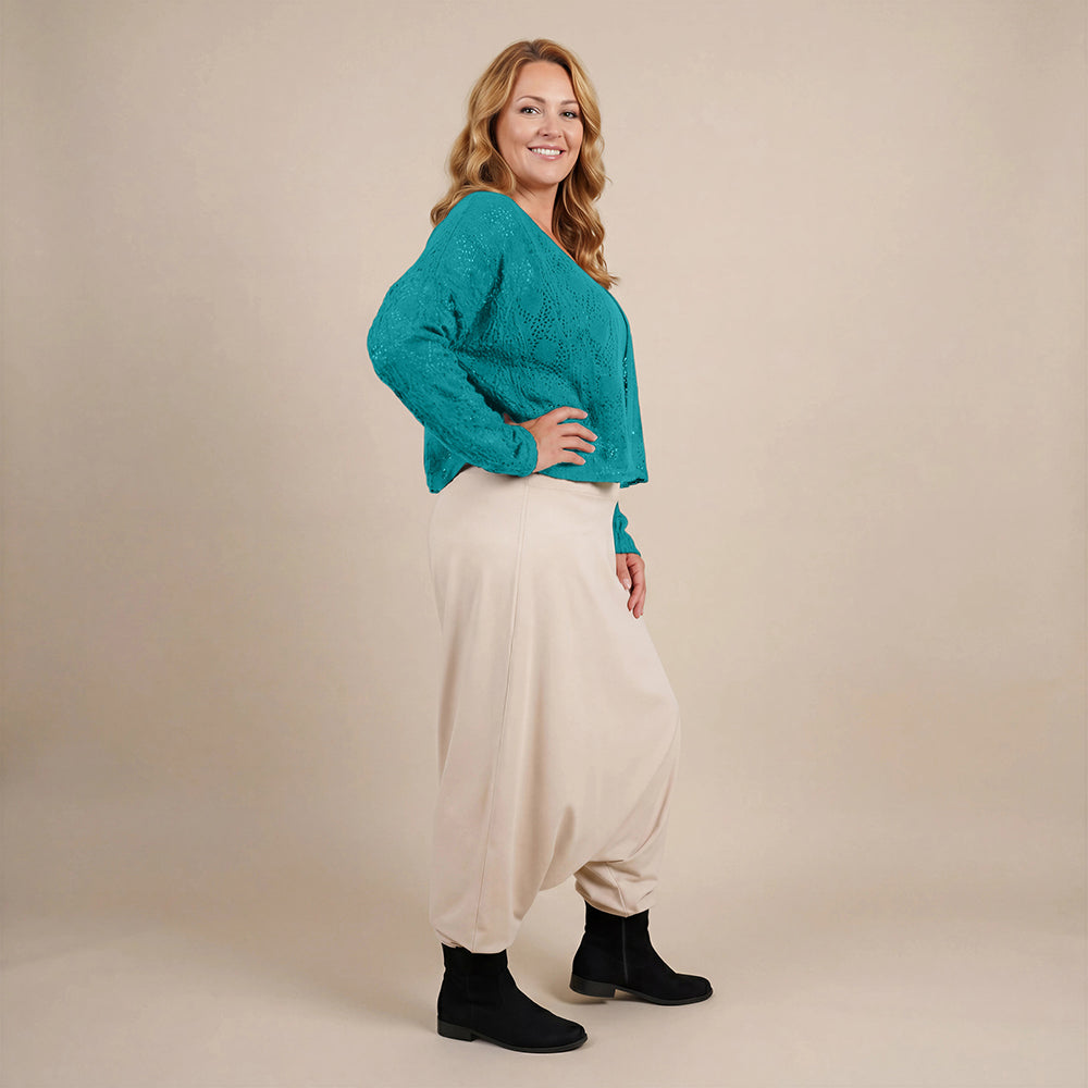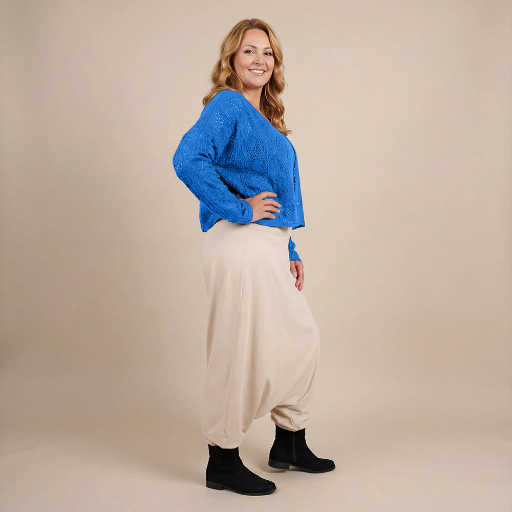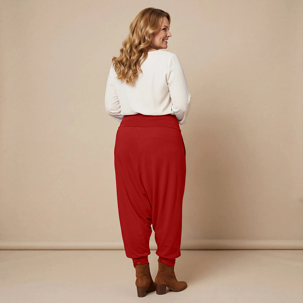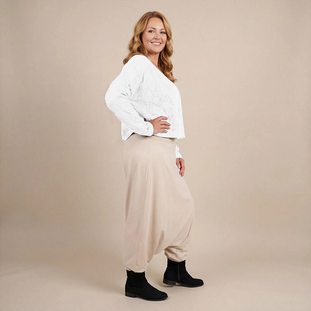 - Pasvorm: haremmodel met brede tailleband en boorden onderaan (ruim vallend)
