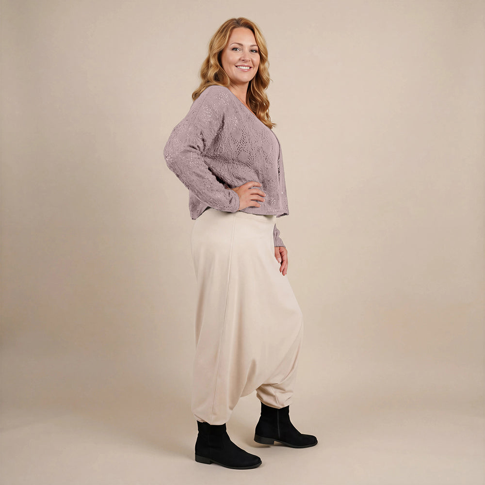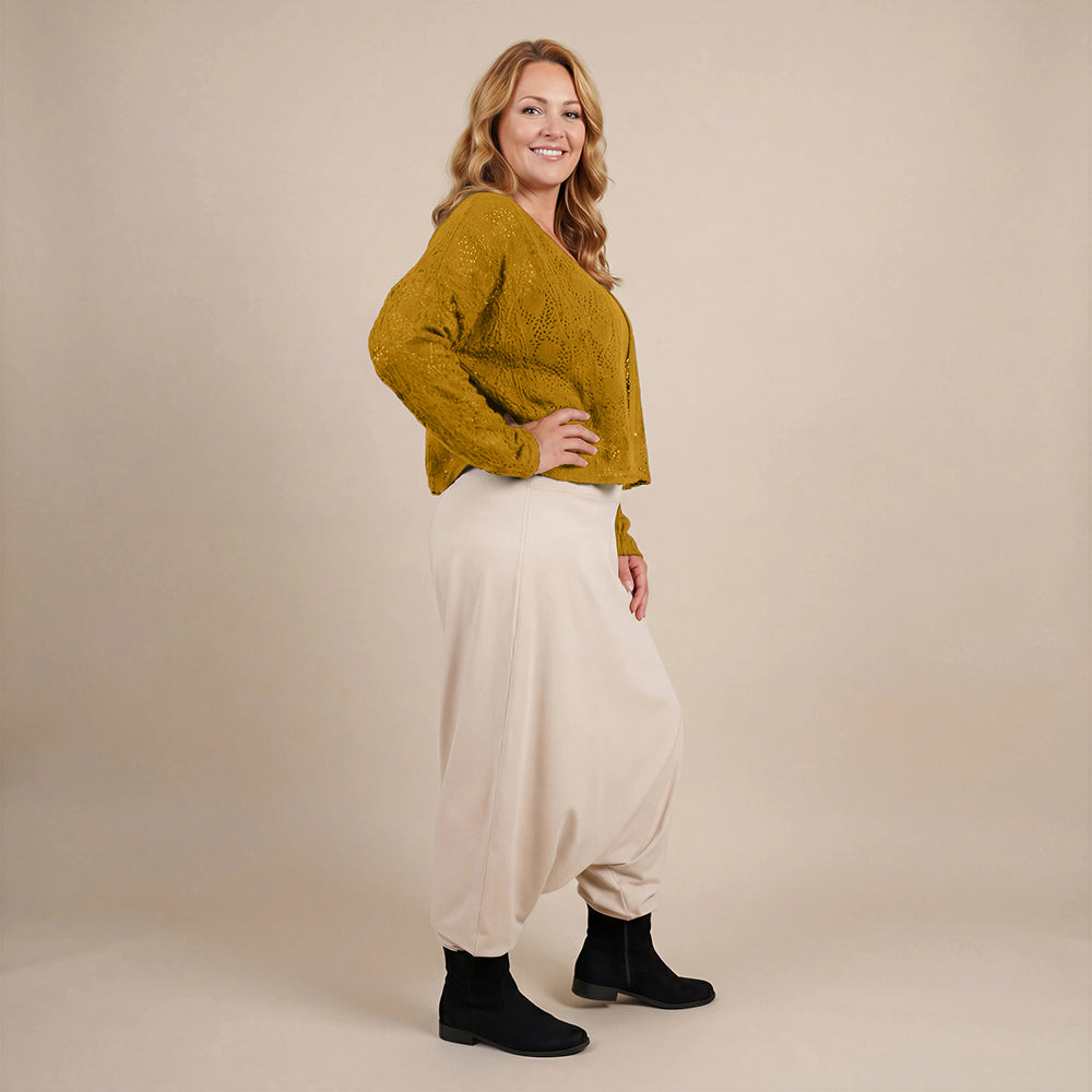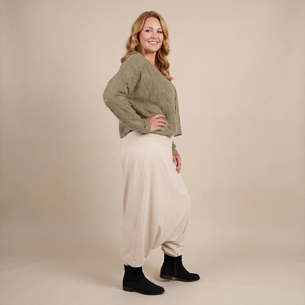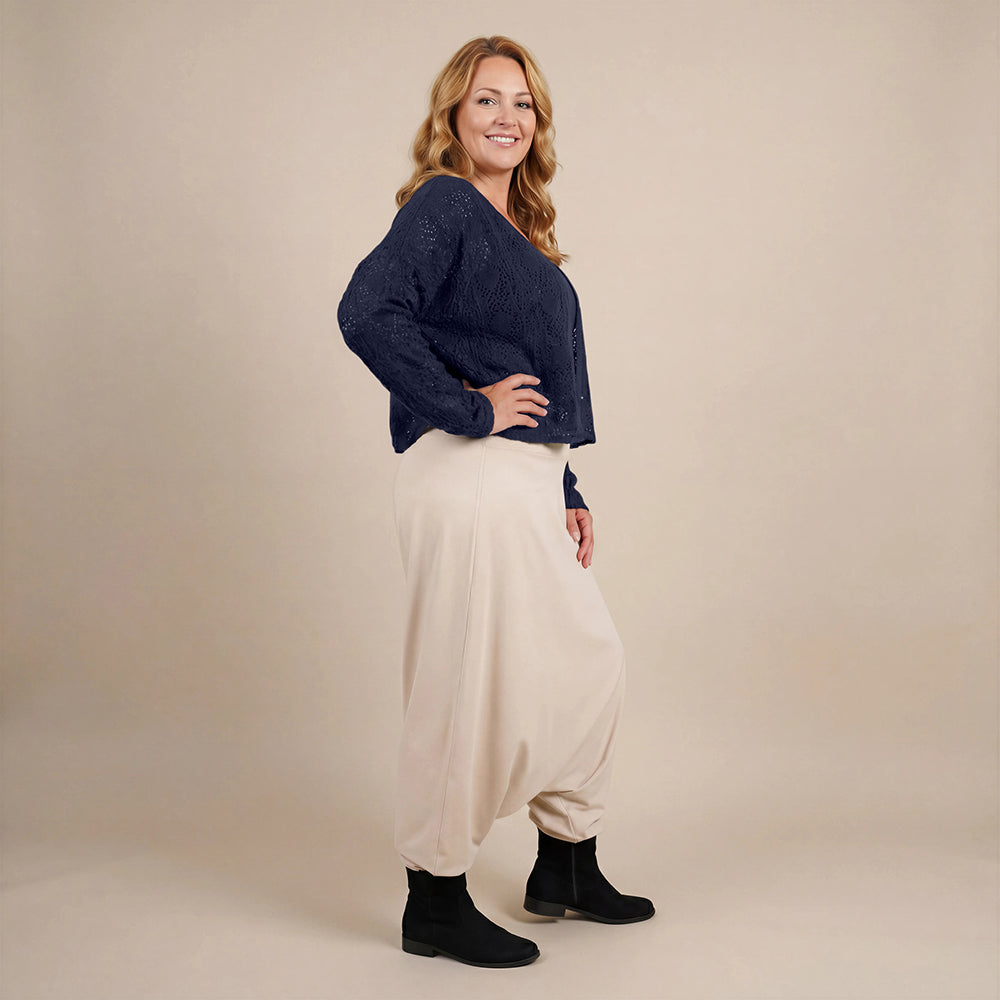 - Pasvorm: haremmodel met brede tailleband en boorden onderaan (ruim vallend)