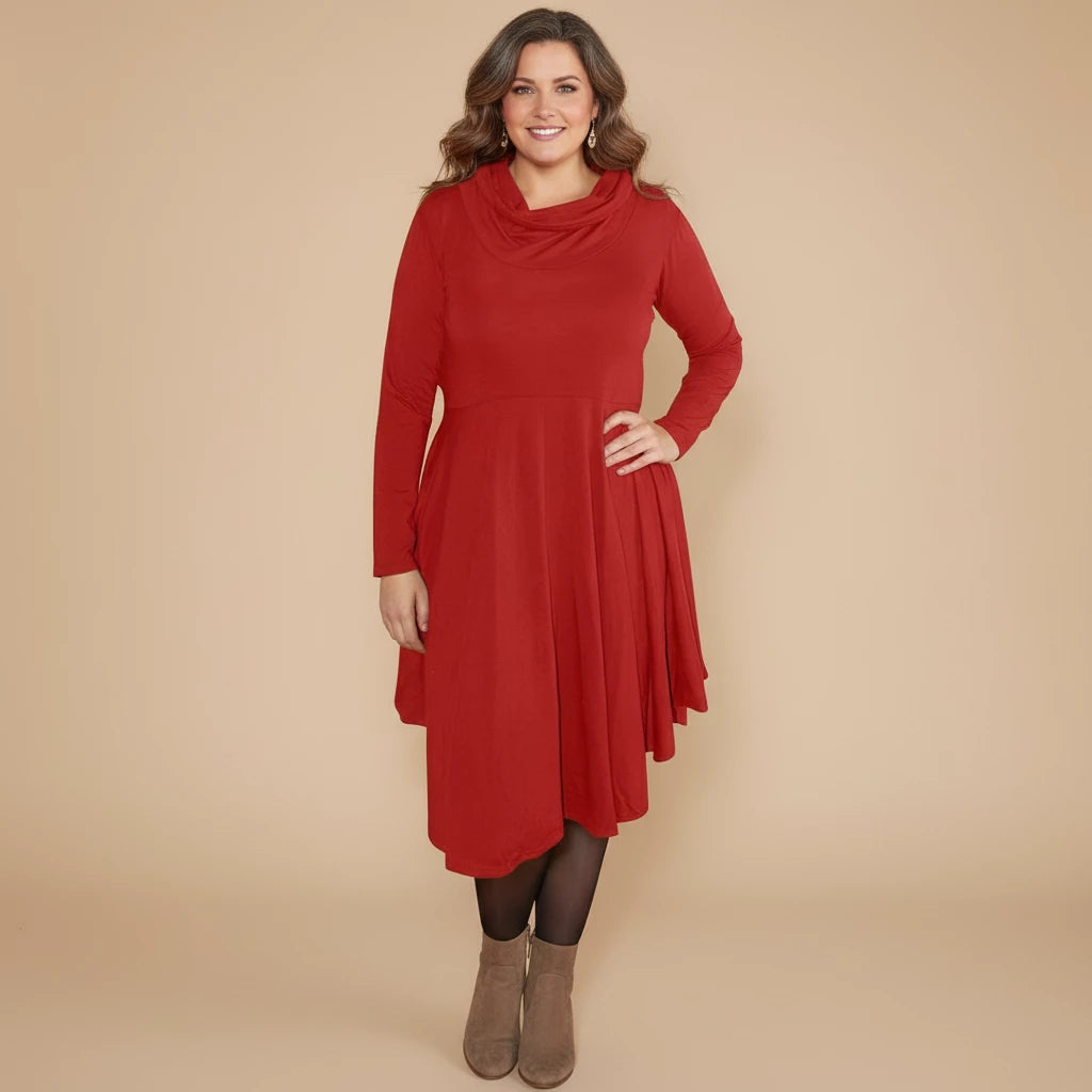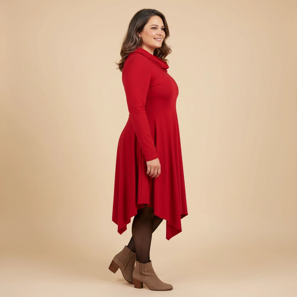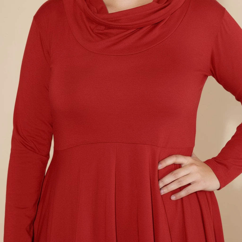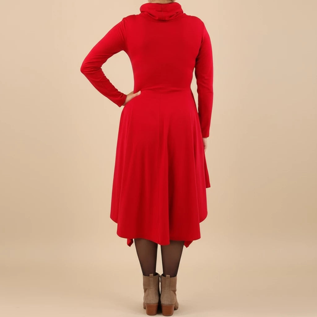 Deze jurk met cirkelrok van Boris Industries voelt soepel en zit comfortabel. De lange mouwen en het wijde model vanaf de buste geven je veel bewegingsvrijheid. De col kun je op verschillende manieren om je hals draperen, waardoor je zelf je stijl bepaalt.