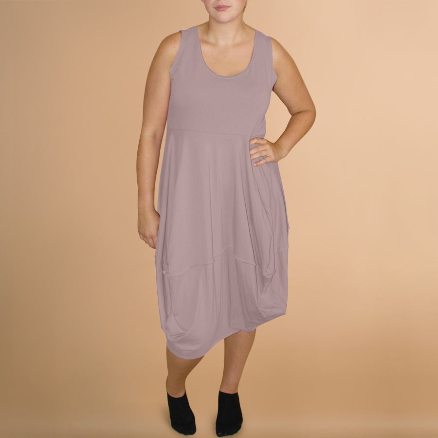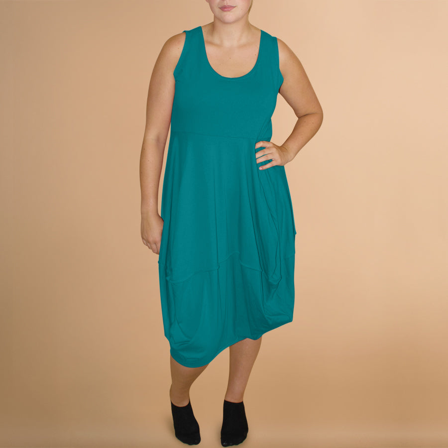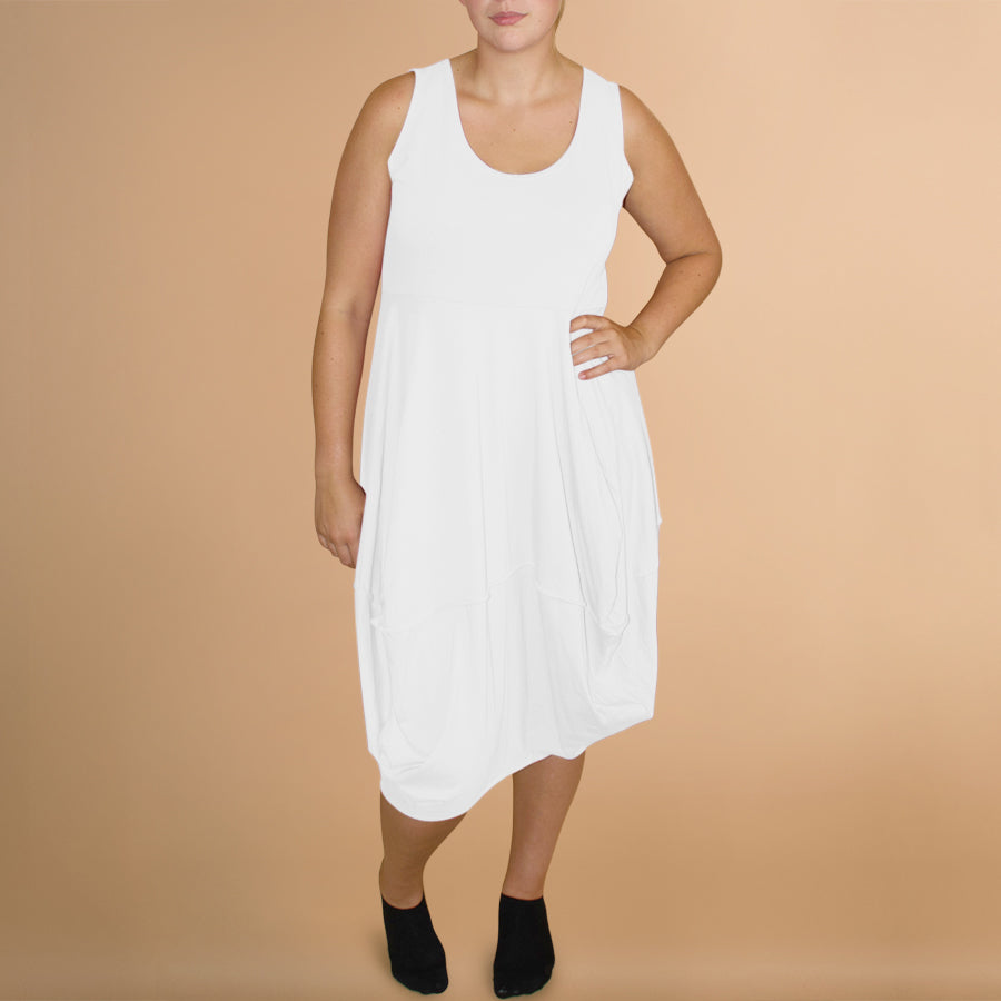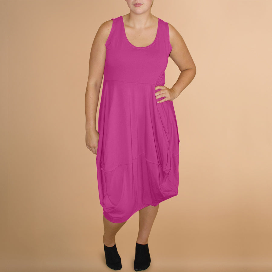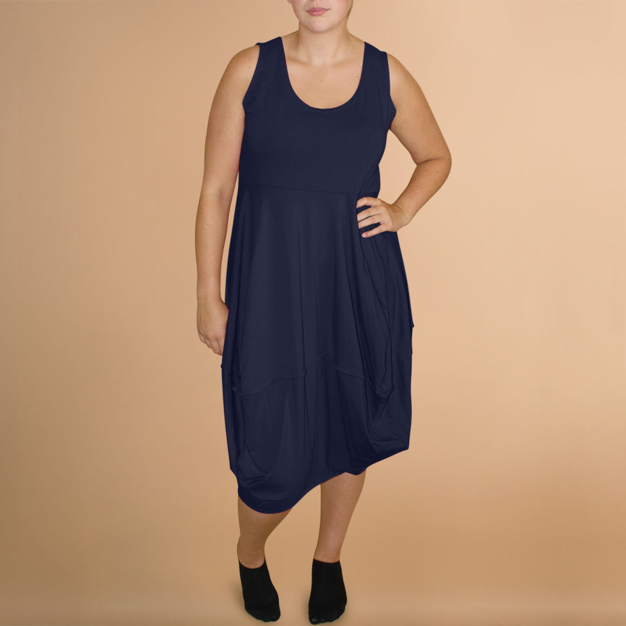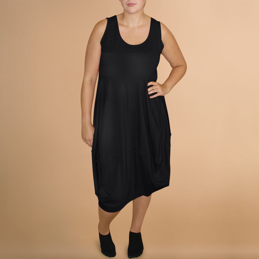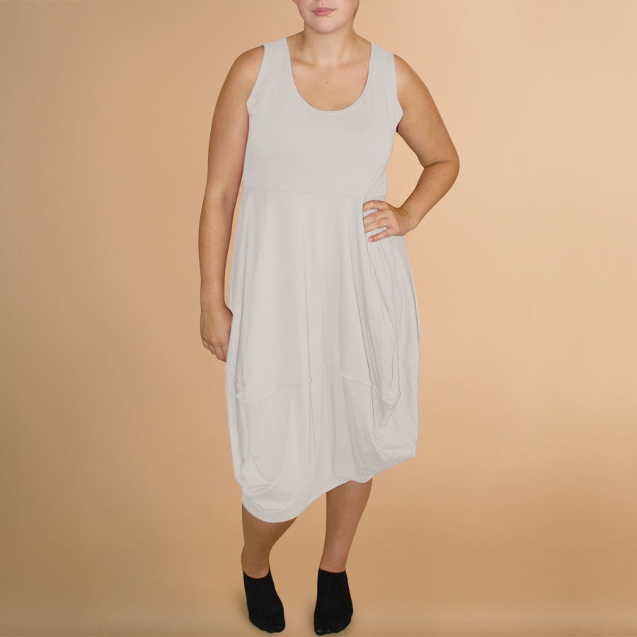 Boris Industries jurk stiksels zonder mouw heeft een mooie ronde hals. Aansluitend bovenlijfje met een rok in een ballonmodel. Perfecte basis jurk in je garderobe.