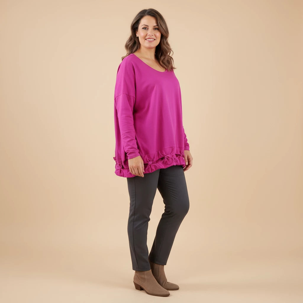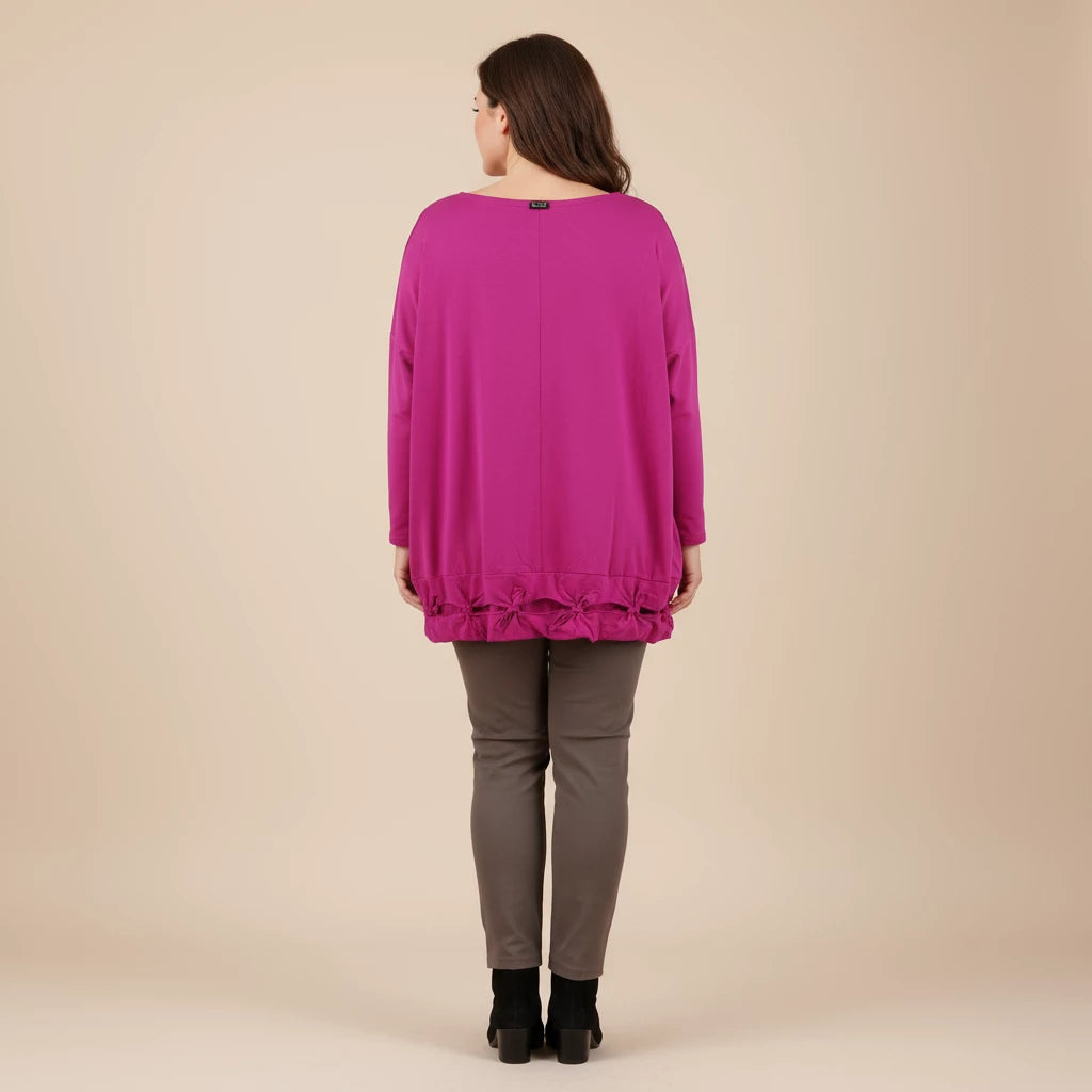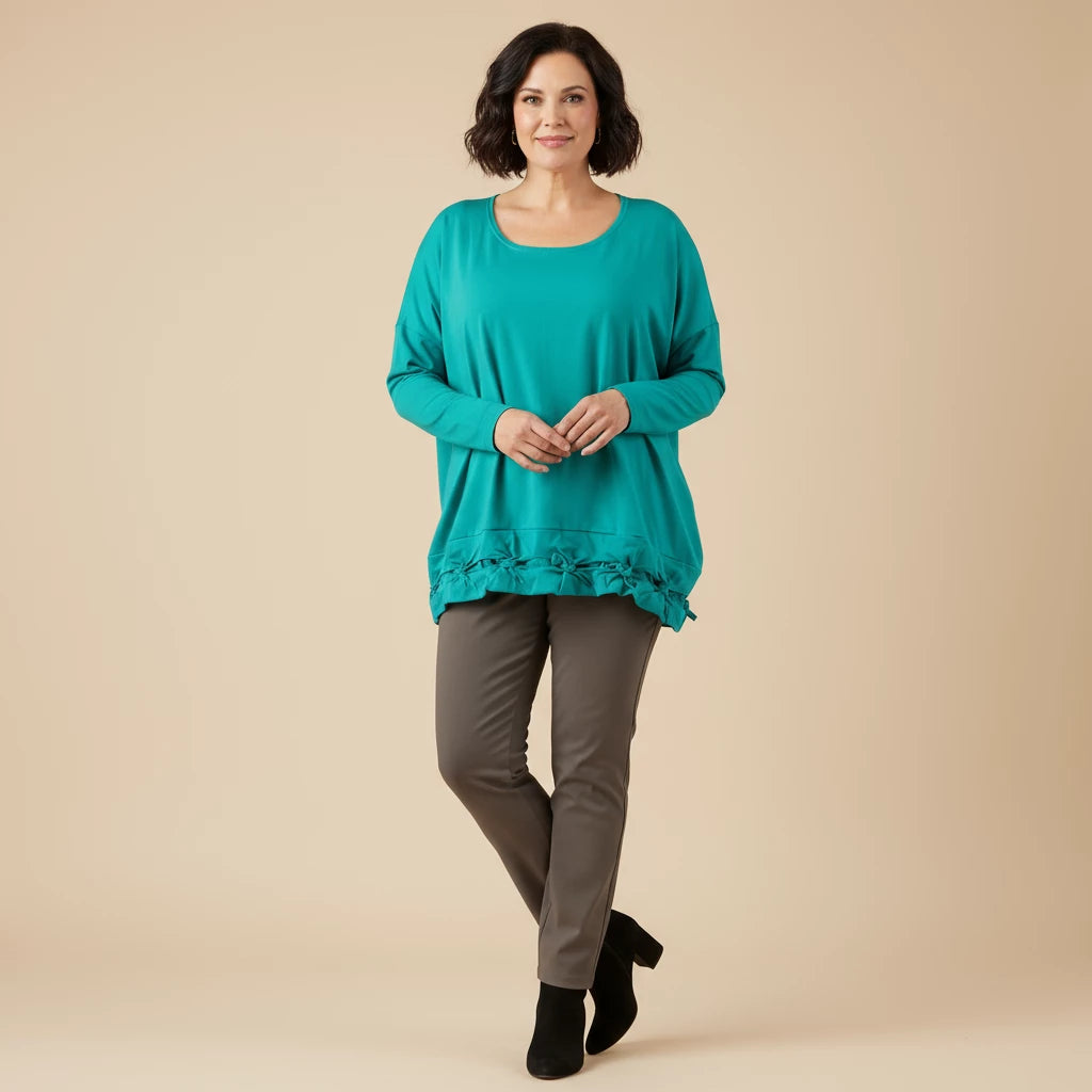 Deze wijdvallende top van Boris Industries draag je makkelijk over een jurk of lange tuniek. Door het brede model past hij van maat 42 tot 54 en zit hij altijd lekker los. De ronde hals en de zoom met strikjes en knoopjes geven net dat beetje extra.