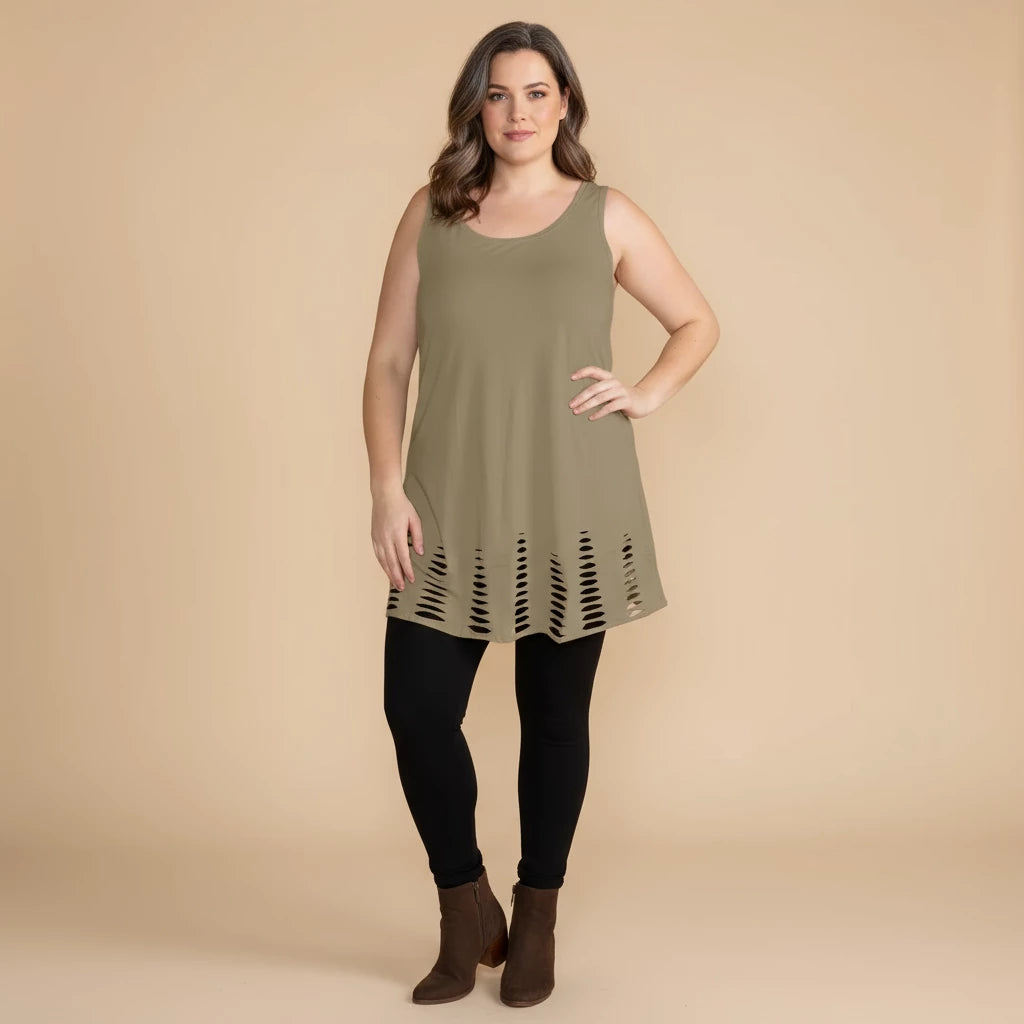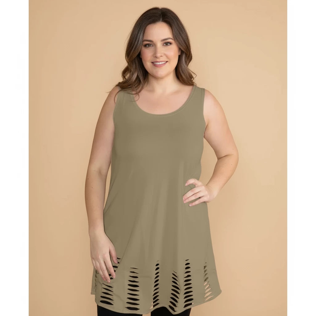 Deze tuniek van Boris Industries is net even anders. De subtiele horizontale inkepingen onderaan geven een speels ladder-effect. De A-lijn valt losjes om je heen en de ronde hals maakt 'm makkelijk te combineren. Je gooit 'm zo aan en je outfit is klaar — comfortabel én met een knipoog.
