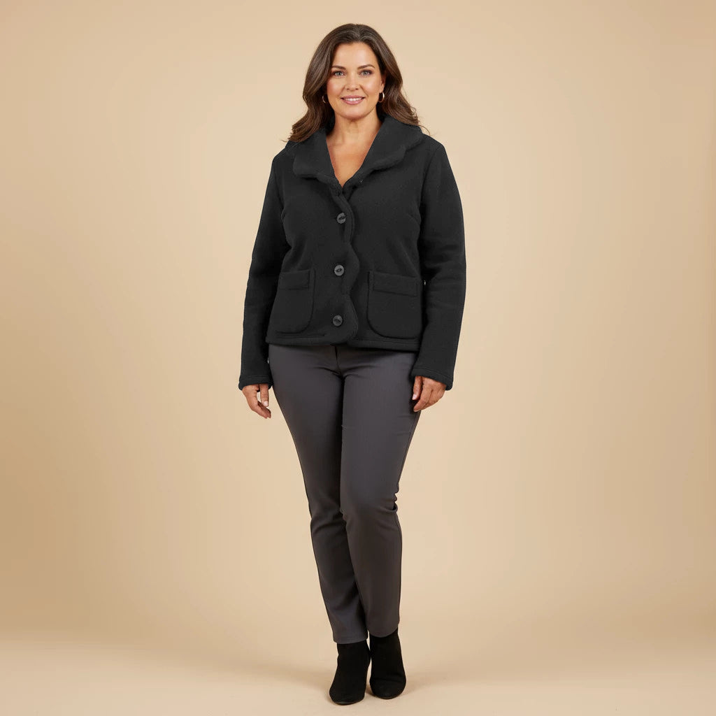 Эта короткая куртка от Boris Industries имеет элегантный волнистый край по передней части и воротнику. Куртка, изготовленная из 100% полиэстерового флиса, застегивается на четыре пуговицы спереди и имеет два удобных кармана. Эта универсальная куртка подходит как для нарядных, так и для повседневных образов и доступна в черном цвете.