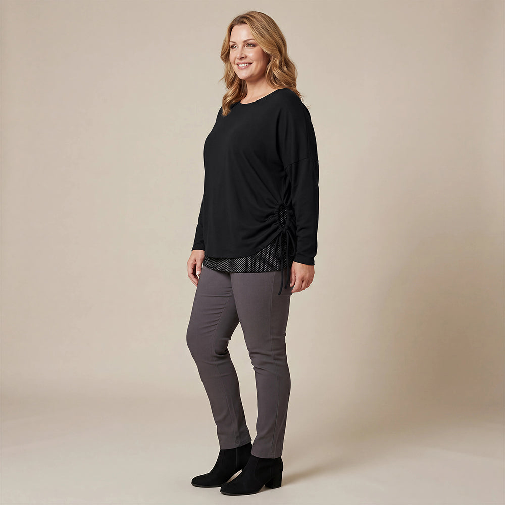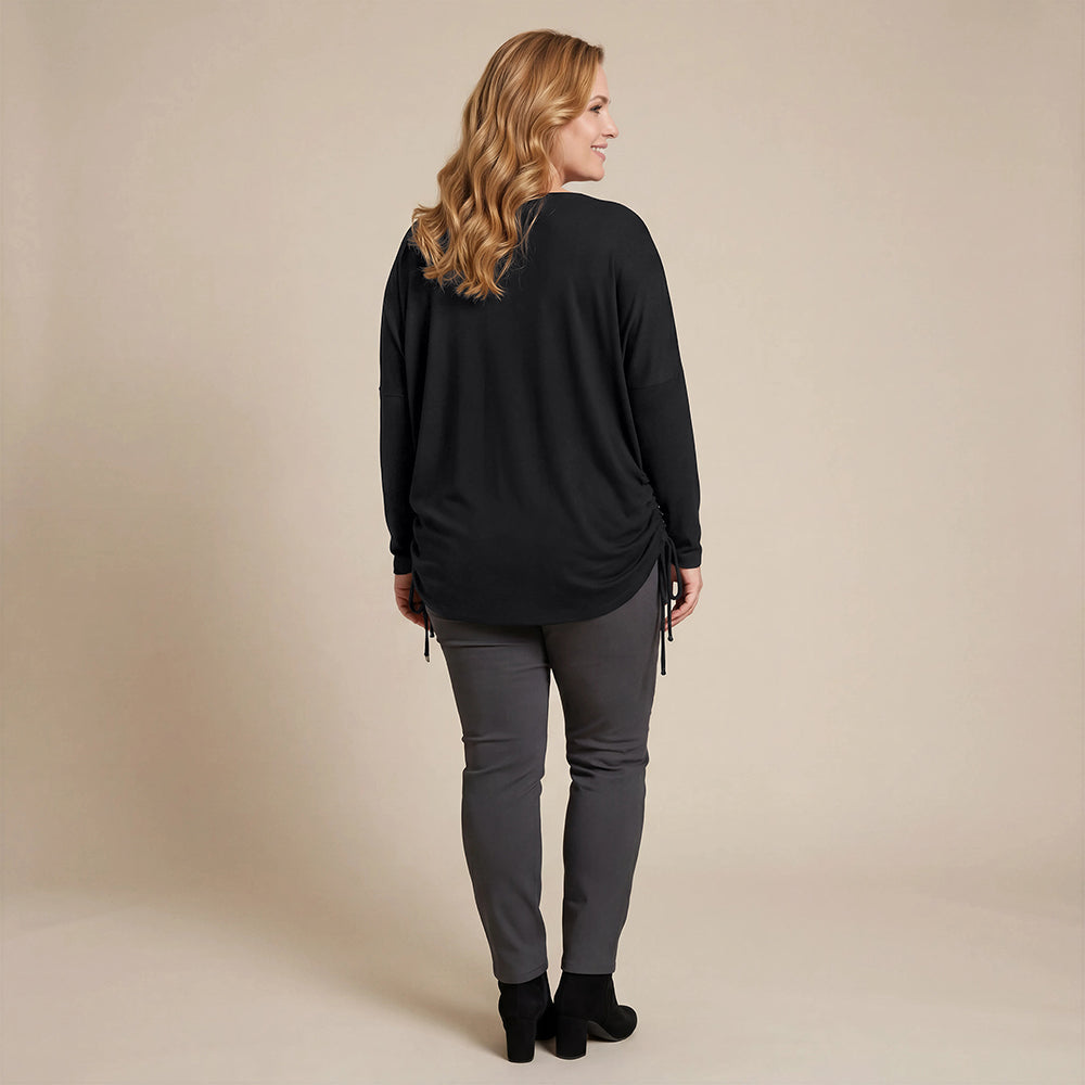 Boris Industries bred t-shirt Rand är en mångsidig och bekväm t-shirt med dragsko på sidorna. Dessa dragskor gör att du kan dra åt och forma t-shirten efter eget önskemål. Den rymliga designen gör den lämplig för storlekar från 42 till 54, perfekt för en lager-på-lager-look. T-shirten har en rund hals och är idealisk att bära över byxor eller klänning, vilket gör den till ett måste i varje garderob.