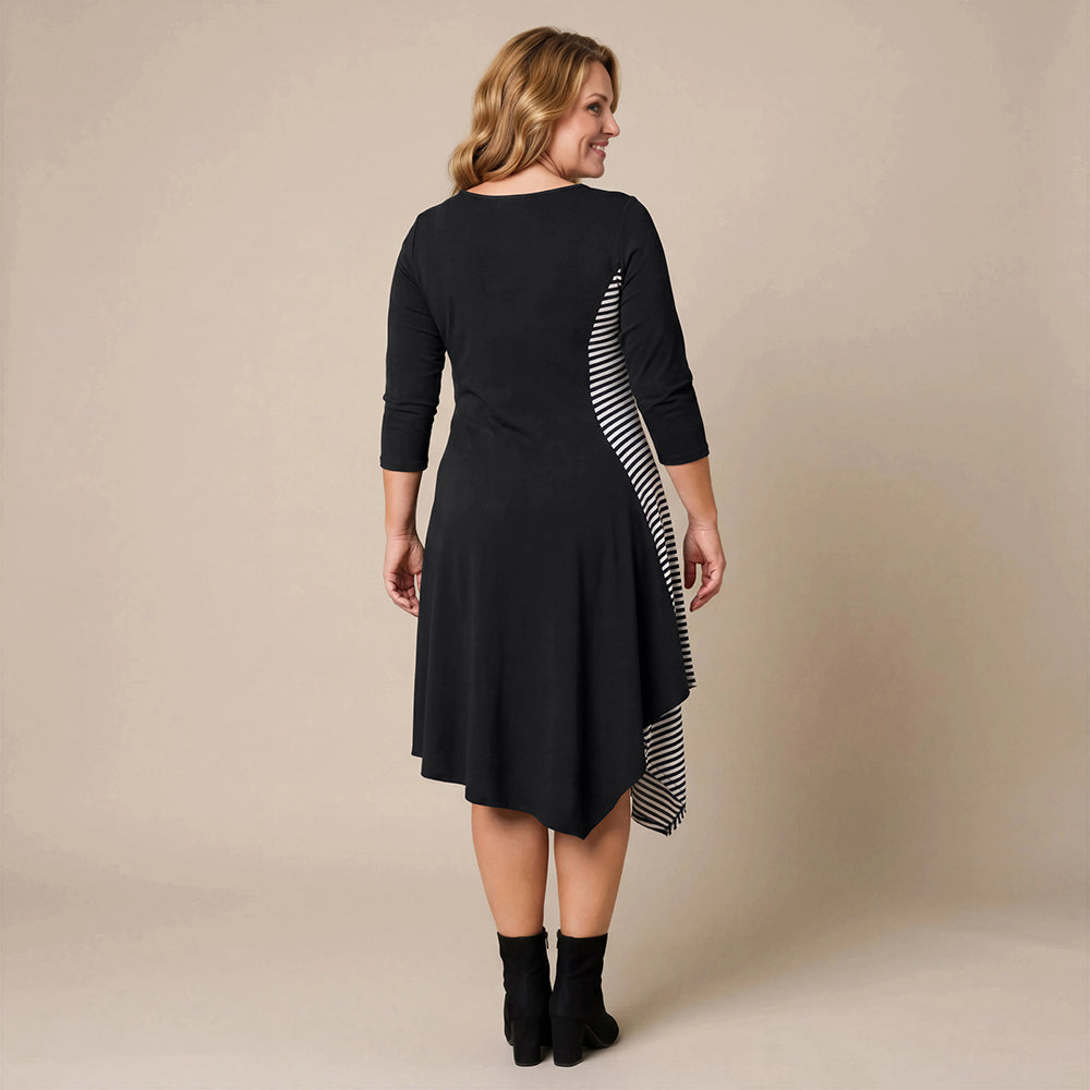 Asimetrik Elbise, güzel yuvarlak yaka ve bir ip ile yukarı kaldırabileceğiniz üç çeyrek kollu, vücuda oturan bir üst kısma sahip bir elbisedir. Elbisenin bir tarafında renkli bir şerit bulunmaktadır. Alt kısmında elbiseyi farklı modellerde giyebilmeniz için ipler bulunmaktadır.