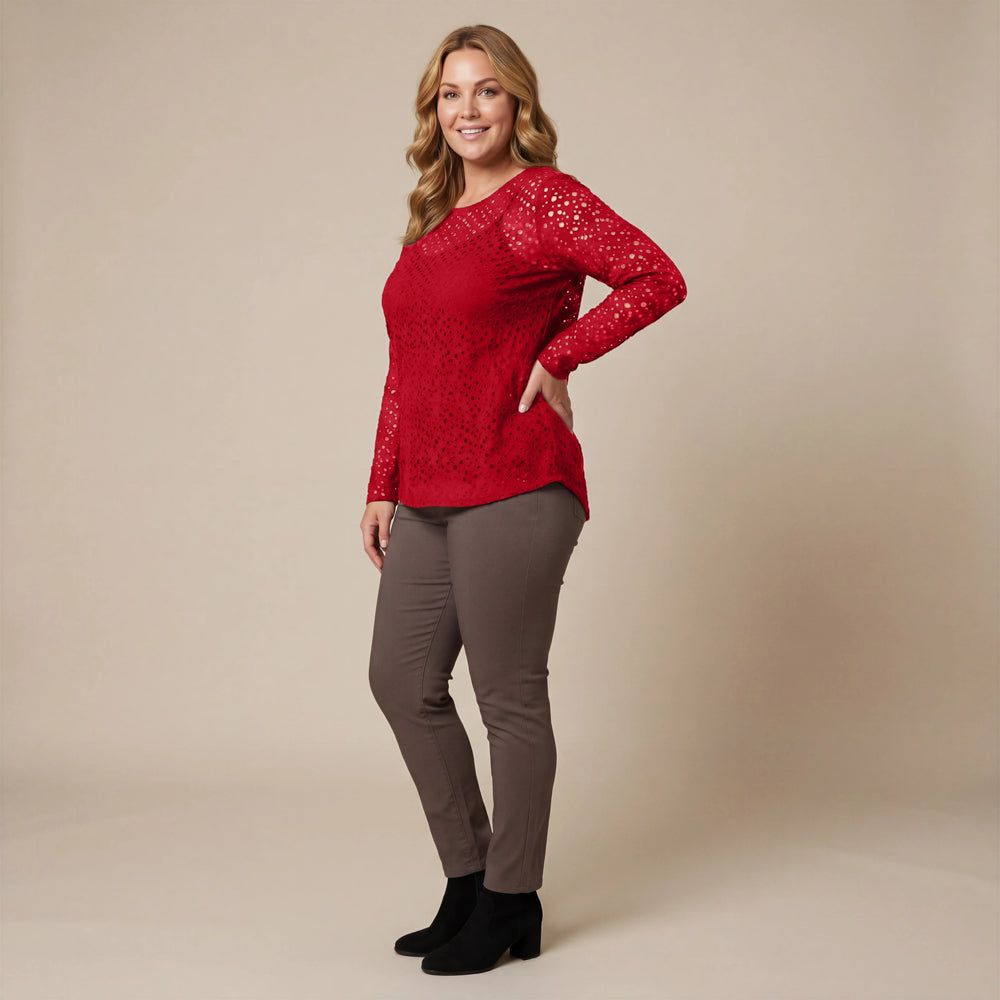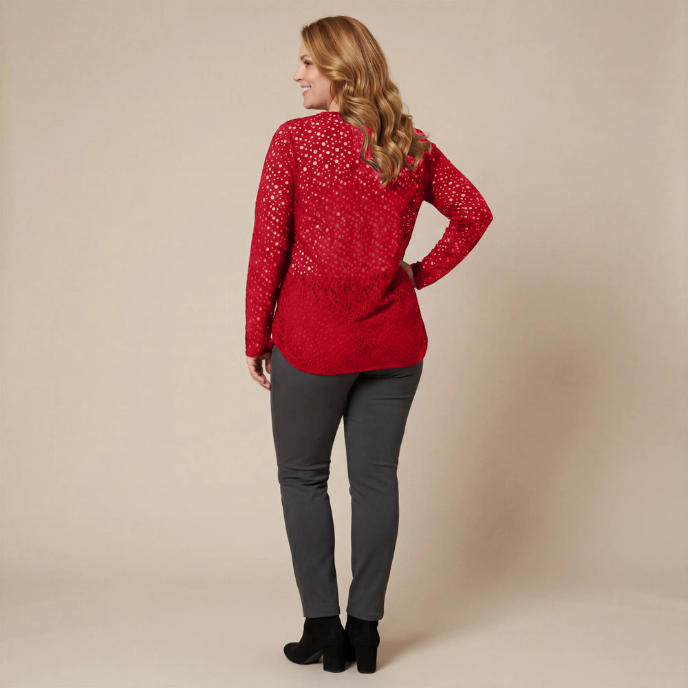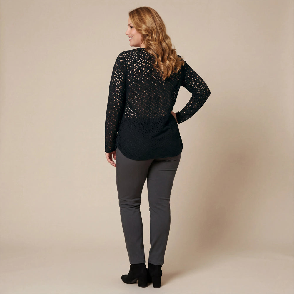 Boris Industries'in bu vücuda oturan gömleği, kumaşındaki düzensiz delikler sayesinde benzersiz bir dokuya sahip şık ve çok yönlü bir giysidir. Esnek malzeme, rahat bir uyum sağlarken, delikler farklı bir renkte bir tişört veya bluz giydiğinizde daha da belirgin hale gelir.